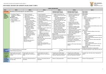 2023/24 ANNUAL TEACHING PLANS: GEOGRAPHY (INLAND): GRADE 12 2023/24 ANNUAL TEACHING PLANS: GEOGRAPHY (INLAND): GRADE 12 (TERM 1) CLIMATE AND WEATHER TERM 1 WEEK 1 WEEK 2 WEEK 3 WEEK 4 WEEK 5 WEEK 6 CAPS TOPIC Mid-latitude cyclones (frontal depression, extra tropical cyclones) Tropical cyclones Subtropical anticyclones and associated weather conditions Subtropical anticyclones and associated weather conditions Valley climates Urban climates CORE CONTENT, CONCEPTS, SKILLS, AND VALUES • Consolidation of Grade 11 Climatology work: Global air circulation Mid-latitude cyclones • General characteristics • Areas of formation • Conditions necessary for the formation • General characteristics • Areas of formation and associated terms in different parts of the world • Factors necessary for their formation • Stages of development • Associated weather patterns • Cross-section through a tropical cyclone (interpretation) • Impact of tropical cyclones on environment (physical) human activities • Pre-cautionary and management strategies manage the effects of tropical cyclones • Identification on synoptic weather maps and satellite images: o Identification of stages of development on synoptic weather maps o Reading and interpretation of applicable weather symbols • Case study of ONE recent tropical cyclone that affected southern Africa Map work & GIS Contour lines, contour interval and height and conventional signs Compass direction True bearing Satellite images, remote sensing, resolution, and interpretation of synoptic weather maps • Location and identification of the THREE high-pressure cells that affect South Africa: o South Atlantic high-pressure cell o South Indian high-pressure cell o Kalahari high pressure cell • General characteristics of the THREE high-pressure cells • Influence of anticyclones on South Africa’s weather and climate (integration with plateau, inversion layer, ocean currents and ridging of South Atlantic high-pressure cell) – summer and winter position • Reading and interpretation of information related to the THREE high pressure cells on synoptic weather maps anti-cyclonic air circulation and its influence on weather and climate Map work & GIS Magnetic declination and magnetic bearing Map scale – types of scales and comparing the scales of topographic maps, orthophoto maps and aerial photographs • Development of travelling, moving disturbance associated with anticyclonic circulation: o Moisture front and line thunderstorms o Coastal low pressure o SA berg wind • Resultant weather and impact (strategies to reduce the impact) associated with travelling, moving disturbances • Identification of travelling, moving disturbances on synoptic weather maps and satellite images • Reading and interpretation of travelling, moving disturbances on synoptic weather maps and satellite images that illustrate weather associated with anticyclonic conditions Map work & GIS Use topographic map to show location of settlements in valleys Calculating straight-line distance in reality Calculating area of regular features Use topographic, and orthophoto maps to identify mountain winds Valley climates Slope aspect: • Definition • Effect on the distribution of temperature in a valley • Definition and development of: o Anabatic winds o Katabatic winds o Inversions o Thermal belt o Frost pockets o Radiation fog • Influence, impact on human activities (economic, social, and environmental): o Settlement o Farming Urban climates • Reasons for differences between rural and urban climates • Urban heat islands: o Definition o Causes of urban heat islands, factors contributing to higher city temperatures o Effects of urban heat islands (economic, social, and environmental) o Strategies to reduce the urban heat island effect • Pollution dome: o Definition o Causes of pollution domes o Effects of pollution domes (economic, social, and environmental) o Strategies to reduce the pollution dome effect Map work & GIS Calculation and interpretation of average gradient • Stages of development • Cross-section through a midlatitude cyclone • Related weather conditions associated with cold, warm, and occluded fronts o Impact on human activities (social and economic) and the (physical) environment o Possible precautionary and management strategies • Identification on synoptic weather maps and satellite images: o Identification of stages of development on synoptic weather maps o Impact of South Indian High and South Atlantic High on movement of the cyclone o Reading and interpretation of weather symbols, predicted weather impact Map work & GIS Alphanumeric reference, grid reference Map coordinates, fixing position – stating the coordinates Application of GIS concepts, data layering, buffering REQUISITE PREKNOWLEDGE Gr 11: High and low pressures, and pressure belts Weather changes during cold fronts Gr 11: High, low pressures, and pressure belts Grade 11 content regarding HP, LP and pressure belts, global circulation RESOURCES (OTHER THAN TEXTBOOK) TO ENHANCE LEARNING Synoptic weather maps, windy TV, weather radar app on smartphones or tablets Synoptic weather maps, windy TV, weather radar app on smartphones or tablets Synoptic weather maps, windy TV, weather radar app on smartphones or tablets Topographic maps, satellite images, synoptic weather maps, temperature data, video clips, Google search by learners Topographic maps, satellite images, synoptic weather maps, temperature data, video clips, Google search by learners Topographic maps, video clips, photos, Google search by learners INFORMAL ASSESSMENT (CONTENT & MAPWORK) Minimum of 3 data response tasks and case studies Minimum of 3 data response tasks and case studies Minimum of 3 data response tasks and case studies Minimum of 3 data response tasks Minimum of 3 data response tasks Minimum of 3 data response tasks Knowledge of temperatures in valley, slopes and urban, rural 1 2023/24 ANNUAL TEACHING PLAN