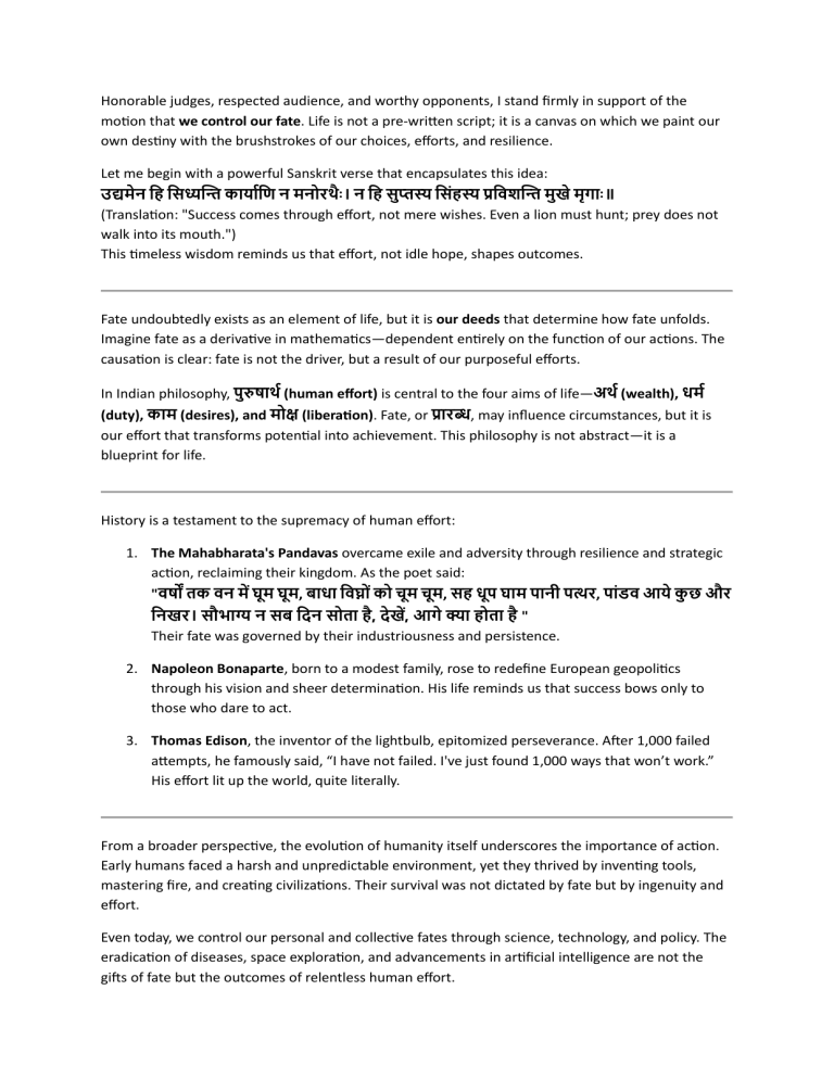 Honorable judges, respected audience, and worthy opponents, I stand firmly in support of the motion that we control our fate. Life is not a pre-written script; it is a canvas on which we paint our own destiny with the brushstrokes of our choices, efforts, and resilience. Let me begin with a powerful Sanskrit verse that encapsulates this idea: उद्यमेन हि हिध्यन्ति कार्ााहि न मनोरथैः । न हि िुप्तस्य हििंिस्य प्रहिशन्ति मुखे मृगाैः ॥ (Translation: "Success comes through effort, not mere wishes. Even a lion must hunt; prey does not walk into its mouth.") This timeless wisdom reminds us that effort, not idle hope, shapes outcomes. Fate undoubtedly exists as an element of life, but it is our deeds that determine how fate unfolds. Imagine fate as a derivative in mathematics—dependent entirely on the function of our actions. The causation is clear: fate is not the driver, but a result of our purposeful efforts. In Indian philosophy, पुरुषाथा (human effort) is central to the four aims of life—अथा (wealth), धमा (duty), काम (desires), and मोक्ष (liberation). Fate, or प्रारब्ध, may influence circumstances, but it is our effort that transforms potential into achievement. This philosophy is not abstract—it is a blueprint for life. History is a testament to the supremacy of human effort: 1. The Mahabharata's Pandavas overcame exile and adversity through resilience and strategic action, reclaiming their kingdom. As the poet said: "िषों तक िन में घूम घूम, बाधा हिघ्ोिं को चूम चूम, िि धूप घाम पानी पत्थर, पािंडि आर्े कुछ और हनखर। िौभाग्य न िब हिन िोता ि, िे खें, आगे क्या िोता ि " Their fate was governed by their industriousness and persistence. 2. Napoleon Bonaparte, born to a modest family, rose to redefine European geopolitics through his vision and sheer determination. His life reminds us that success bows only to those who dare to act. 3. Thomas Edison, the inventor of the lightbulb, epitomized perseverance. After 1,000 failed attempts, he famously said, “I have not failed. I've just found 1,000 ways that won’t work.” His effort lit up the world, quite literally. From a broader perspective, the evolution of humanity itself underscores the importance of action. Early humans faced a harsh and unpredictable environment, yet they thrived by inventing tools, mastering fire, and creating civilizations. Their survival was not dictated by fate but by ingenuity and effort. Even today, we control our personal and collective fates through science, technology, and policy. The eradication of diseases, space exploration, and advancements in artificial intelligence are not the gifts of fate but the outcomes of relentless human effort. Some argue that fate governs us—that we are mere passengers on a predetermined journey. But this perspective discounts the power of free will and ignores the distinction between circumstances and outcomes. While fate may dictate our starting point, it is our effort that determines where we finish. Consider two individuals born into similar circumstances. One toils relentlessly, while the other resigns to "fate." Their destinies, as we see time and again, diverge based on their choices and actions. Fate is simply the seed; the harvest depends on how we nurture it. This principle applies not just to great figures but to our daily lives. A student’s performance in an exam, for example, is influenced by preparation—not luck. A farmer’s yield depends on toil, irrigation, and care—not just the whims of the weather. To conclude, fate is not the master of our lives—it is the servant of our will. As Robert Frost wisely said, “The best way out is always through.” By embracing effort, perseverance, and action, we control our destiny. Let us reject passivity and take charge, knowing that the power to shape our fate lies firmly in our hands. Thank you.