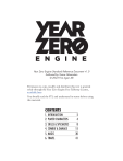 Year Zero Engine Standard Reference Document v1.0 Authored by Tomas Härenstam © 2023 Fria Ligan AB Permission to copy, modify and distribute this text is granted solely through the Year Zero Engine Free Tabletop License, available here. You should read the FTL and understand its terms before using this material. CONTENTS 1. INTRODUCTION 2. PLAYER CHARACTERS 3. SKILLS & SPECIALTIES 4. COMBAT & DAMAGE 5. MAGIC 6. TRAVEL 2 4 8 15 30 41 1 INTRODUCTION Welcome to Year Zero. This document contains the core Year Zero Engine mechanics for tabletop roleplaying, used in several Free League games. THE BASICS This section introduces some key concepts in roleplaying, and how they are used in games using the Year Zero Engine. THE PLAYERS Each player except one controls a player character (PC). You decide what your PC thinks and feels, what they say and do – but not what happens to them. It is your job as a player to immerse yourself in your PC. They may be an adventurer in a faraway fantasy world – but they are still, at heart, a person with feelings and dreams, just like you. Try to imagine – how would you react if you were in their shoes? What would you do? The player characters are always the protagonists of the story. The game is about you. Your decisions, your adventures. THE GAMEMASTER The final player is the Gamemaster, the GM. They describe the game world to you, they portray the people you meet, and they control the enemies you fight. The game is a conversation between the players and the GM, back and forth, until a critical situation arises where the outcome is uncertain. Then it’s time to break out the dice – read more about this in Chapter 3. It is the GM’s job to put obstacles in your path and challenge your PCs, forcing them to show what they’re really made of. But it is not up to the GM to decide everything that happens in the game – and above all, not how your story is supposed to end. That is decided in the game. That is why you are playing the game – to find out how your story ends. ABBREV IATION S PC = Player Character NPC = Non-Player Character GM = Gamemaster YZE = Year Zero Engine SRD = Standard Reference Document YOU AND OTHERS Most of the rules in this document are written in the second person – i.e., speaking to “you.” Rules that apply to you also apply to others in the game, both PCs and NPCs, unless explicitly stated otherwise. KEY FEATURES The Year Zero Engine was originally developed as the ruleset for Mutant: Year Zero, but has been further modified and adapted to a wide range of games with different themes and settings. Yet, six core features of the game remain the same in all iterations. These are listed and explained below. ACCESSIBLE The basics of the Year Zero Engine are very easy to learn. It is easy to teach to new players, making the barrier to play very low. Complexity and depth are added piece by piece, offering more choices to the player as they gain more insight into the system. FAST AND DECISIVE The Year Zero Engine is fast, quickly producing meaningful results by removing any dice rolling, bookkeeping and calculations that don’t move the action forward. Year Zero Engine combat systems are often deadly, pushing conflicts to decisive moments. The risks are high, and PCs are rarely safe from danger no matter how experienced they are. RISKS & REWARDS In the Year Zero Engine, you can increase your chances significantly by pushing your roll – i.e. re-rolling the dice – but pushing always comes with a cost. This dynamic constantly pushes you to weigh risks and rewards, and makes the Year Zero Engine particularly suited for harsh, survival-focused games. T H E S E S I DE B A R S Sidebars such as this one are interspersed throughout this rules text. They typically contain rules variants, comments and advice on how to play. Not for resale. Permission granted to print or photocopy this document for personal use only. Standard Reference Document v1.0 2 PLAYER-CENTRIC In Year Zero Engine games, the players and their characters are at the heart of the story. The PCs are the protagonists of the story, never the NPCs. The rules focus on the PCs and their actions, while NPCs are handled quickly and effectively by the Gamemaster. The system is designed to always present the players with meaningful choices. STORY DRIVEN Roleplaying is about creating stories, memorable moments at the gaming table that you’ll remember for years to come. The Year Zero Engine is designed to produce dramatic effects that will push your story forward and make it take unexpected turns. R O L L I N G DI C E The rules will sometimes ask you to roll D3, 2D6, D66, and D100. D3 means you roll a D6 and divide the result by two, rounding up. 2D6 means you roll two six-sided dice and add the results. D66 means you roll two D6. The first die represents the tens digit and the second die represents the ones digit. That generates a result between 11 and 66. D100 means you roll two D10. The first represents the tens digit and the second the ones digit. A double zero counts as 100. You can even roll D666, by rolling three six-sided dice. The first die then counts as the hundreds digit, the second as the tens digit and the third as the ones digit. ADAPTABLE CUSTOM CARDS The Year Zero Engine is designed to be very adaptable for different play styles, themes, and game settings. By using skills and talents in a modular fashion, the system creates building blocks that are very easily added, removed, and re-engineered. Another useful accessory for YZE games is a custom card deck. The cards can be used as reference sheets for gear or NPCs, but also to randomize initiative in combat – read more about this in Chapter 4. DICE POOLS vs STEP DICE Every Year Zero Game is different, but two main forks can be identified – the original dice pool variety (using pools of D6s) and the more recent step dice version (using a variety of polyhedral dice). Both versions are included in this SRD. When