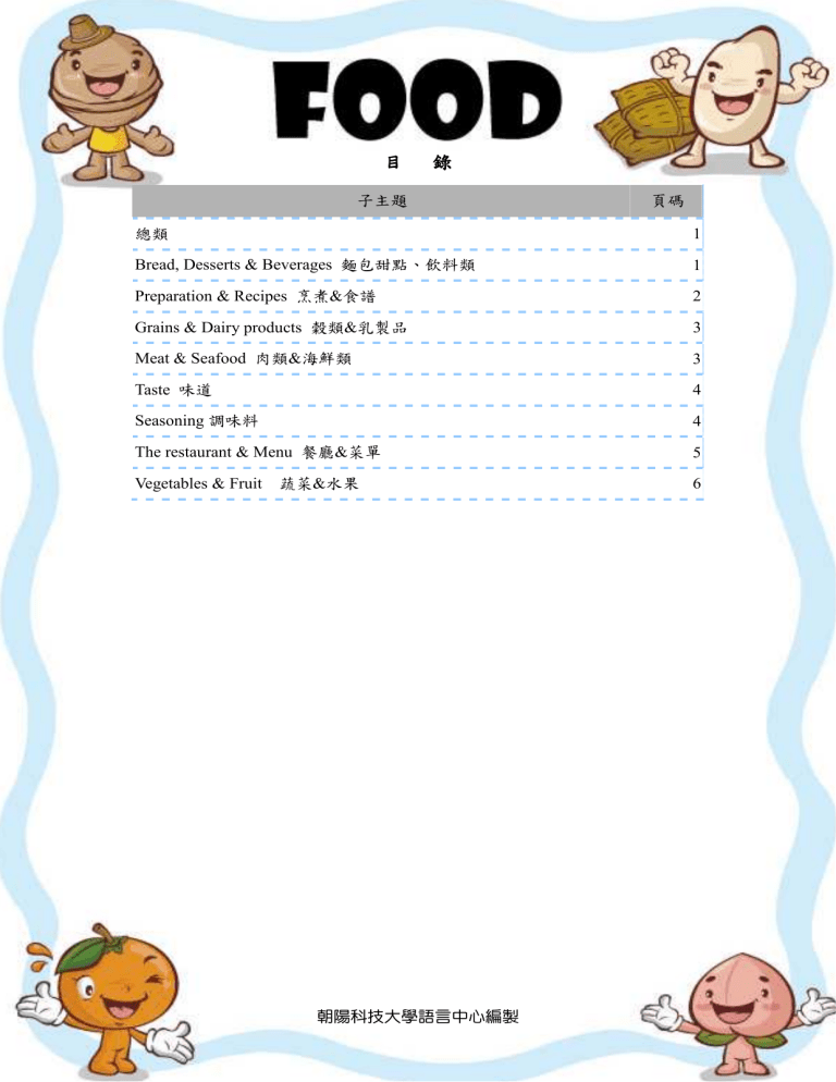 目 錄 子主題 頁碼 總類 1 Bread, Desserts & Beverages 麵包甜點、飲料類 1 Preparation & Recipes 烹煮&食譜 2 Grains & Dairy products 穀類&乳製品 3 Meat & Seafood 肉類&海鮮類 3 Taste 味道 4 Seasoning 調味料 4 The restaurant & Menu 餐廳&菜單 5 Vegetables & Fruit 蔬菜&水果 朝陽科技大學語言中心編製 6 breakfast ['brɛkfәst] brunch buffet [noun]自助餐 ['bʌfɪt] [noun]飲食,食物 [verb]節食 diet ['daɪәt] dinner ['dɪnɚ] dish [dɪʃ] dumpling ['dʌmplɪŋ] eat egg [ɛg] fat [fæt] feed [fid] [fud] [noun]早午餐 [brʌntʃ] [it] food [noun]早餐 full [fʊl] honey ['hʌnɪ] ice [aɪs] [noun]晚餐,正餐 lunch [noun]1.碟 碟,盤 2.一盤菜,菜餚 meal [noun]餃子 pizza [verb]吃 salad [noun]蛋 soup [adj]肥胖的 [noun]脂肪 脂肪 supper [verb]1.餵(養) 2.飼(養) tofu [lʌntʃ] [mil] ['pitsә] ['sælәd] [sup] ['sʌpɚ] ['tofu] [noun]食物 [adj]1.充滿的 2.吃飽的 蜂蜜 [noun]1.蜂蜜 2.【口語】親愛的 [noun]冰 [noun]午餐 [noun]一餐,一頓飯 [noun]比薩 [noun]沙拉 [noun]湯 [noun]晚餐,晚飯 [noun]豆腐 Bread, Desserts & Beverages 麵包甜點、 麵包甜點、飲料類 bakery ['bekәrɪ] beer [bɪr] bread [brɛd] bun [bʌn] [noun]麵包(糕點)店 cake [noun]啤酒 candy [noun]麵包 chocolate [kek] ['kændɪ] ['tʃɑkәlɪt] [noun]小圓麵包,小圓糕點 coffee ['kɔfɪ] [noun]蛋糕 [noun]糖果 [noun]巧克力 [noun]咖啡 Page 1 朝陽科技大學語言中心編製 本單字表之音標出處為奇摩字典。 Bread, Desserts & Beverages 麵包甜點、 麵包甜點、飲料類 coke [noun]【口語】可樂 [kok] cookie ['kuki] dessert [dɪ'zɝt] doughnut ['do͵nʌt] pie [paɪ] [noun]餅乾 sandwich [noun]甜點 snack ['sændwɪtʃ] [snæk] [noun]甜甜圈(=donut) soda ['sodә] [noun]派 [noun]三明治 [noun]點心,零食 [noun]蘇打水,汽水 [verb]飲,喝 drink [drɪŋk] hamburger ['hæmbɝgɚ] juice [dʒus] loaf [lof] [noun]1.飲料 2.酒 tea [ti] [noun]漢堡 toast [noun]果汁 wine [noun](一條)麵包 - [tost] [waɪn] [noun]茶 [noun]吐司 [verb]烤(吐司) [noun]葡萄酒,酒 Preparation & Recipes 烹煮&食譜 烹煮 食譜 bake [bek] barbecue ['bɑrbɪkju] boil [bɔɪl] cook [kʊk] [verb]烘,烤 cut [kʌt] [noun]烤肉 fry [fraɪ] [verb]烤(肉類) [verb](水等)沸騰,煮沸, mix [mɪks] 燒開 [verb]煮 煮 [noun]廚師 steam [stim] [verb]切 切 [noun]傷口 [verb] 油 煎 , 油 炸 , 油 炒 [noun]油炸食物 [verb]使混和 [noun]1.水蒸汽 2.蒸汽(動力) [verb]蒸 蒸(食物 食物) 食物 Page 2 朝陽科技大學語言中心編製 本單字表之音標出處為奇摩字典。 Grains & Dairy products 穀類&乳製品 穀類 乳製品 butter ['bʌtɚ] cereal ['sɪrɪәl] cheese [tʃiz] corn [kɔrn] cream [krim] flour [flaʊr] [noun]奶油 milk [noun]麥片 noodle [mɪlk] ['nud!] popcorn [noun]乳酪,起司 ['pɑp͵kɔrn] [noun]玉米 powder [noun]奶油,乳脂,乳霜 rice [noun]麵粉 spaghetti ['paʊdɚ] [raɪs] [spә'gɛtɪ] [noun]牛奶 [noun](常複數)麵條 [noun]爆米花 [noun]粉,粉末 [noun]米,米飯 [noun]義大利麵條 Meat & Seafood 肉類&海鮮類 肉類 海鮮類 beef [bif] chicken ['tʃɪkɪn] crab [kræb] duck [dʌk] fish [fɪʃ] goose [gus] ham [hæm] [noun]牛肉 lamb [læm] [noun]1.雞肉 雞肉 meat 2.【俚】膽小鬼,懦夫 [mit] pork [noun]螃蟹 [pork] [noun]1.鴨 2.鴨肉 shrimp [noun]魚 steak [noun]1.鵝 2.鵝肉 turkey [noun]火腿 - [ʃrɪmp] [stek] ['tɝkɪ] [noun]小羊 [noun]肉類 [noun]豬肉 [noun]蝦 [noun]牛排 [noun]火雞 Page 3 朝陽科技大學語言中心編製 本單字表之音標出處為奇摩字典。 Taste 味道 bitter ['bɪtɚ] delicious [dɪ'lɪʃәs] fresh [frɛʃ] rich [rɪtʃ] [adj]1.有苦味的,苦的 sour 2.(天氣)嚴寒的,刺骨的 ['saʊr] [adj]十分美味,很好吃的 sweet [adj]1.新鮮的 新鮮的 2.(空氣)清新的 taste [adj]酸的,有酸味的 [adj]甜的 甜的 [noun]【英】糖果 [swit] [noun]1.味道 2.味覺 [verb]嚐…味道 [test] [adj]]1.(味道 味道)濃郁的 味道 濃郁的, 濃郁的,營養價 yummy 值高的 值高 的 [adj]【口語】好吃的,美味 的,可口的 ['jʌmɪ] 2.有錢的,富有的 [adj]1.強壯的 strong [strɔŋ] 味道、 氣味)濃的 濃的, 2.(味道 味道 、氣味 濃的 ,強 - 烈的 Seasoning 調味料 ketchup ['kɛtʃәp] oil [ɔɪl] pepper ['pɛpɚ] salt [sɔlt] [noun]調味番茄醬 soy-sauce [noun]醬油 [noun]油 sugar [noun]糖 [noun]胡椒粉 vinegar [noun]鹽 - ['ʃʊgɚ] ['vɪnɪgɚ] [noun]醋 Page 4 朝陽科技大學語言中心編製 本單字表之音標出處為奇摩字典。 The restaurant & Menu 餐廳&菜單 餐廳 菜單 bar [bɑr] [noun]1.酒吧 2.棒、條(狀物) restaurant ['rɛstәrәnt] [noun]餐廳 [verb]1.為…服務 cafeteria [`kæfә'tɪrɪә] menu ['mɛnju] [noun]自助餐廳 serve 2.供應 [sɝv] 3.端上(食物) 4.擔任職務 [noun]菜單 service ['sɝvɪs] [noun]服務 [noun]1.命令 2.順序,秩序 3.訂貨,訂購 order ['ɔrdɚ] 4.點餐 點餐 [verb]1.下命令 2.訂購 - 3.點菜 點菜 Page 5 朝陽科技大學語言中心編製 本單字表之音標出處為奇摩字典。 Vegetables & Fruit 蔬菜&水果 蔬菜 水果 apple ['æp!] banana [bә'nænә] bean [bin] cabbage ['kæbɪdʒ] carrot ['kærәt] fruit [frut] grape [grep] guava ['gwɑvә] lemon ['lɛmәn] lettuce ['lɛtɪs] mango ['mæŋgo] melon ['mɛlәn] onion ['ʌnjәn] [noun]蘋果 orange [noun]香蕉 papaya [noun]豆 peach [noun]高麗菜 pear [noun]胡蘿蔔 pineapple [noun]水果 potato [noun]葡萄 pumpkin [noun]番石榴,芭樂 strawberry [noun]桃子 [pitʃ] [noun]洋梨 [pɛr] [noun]鳳梨 ['paɪn͵æp!] [noun]馬鈴薯 [pә'teto] [noun]南瓜 ['pʌmpkɪn] ['strɔbɛrɪ] tangerine [noun]萵苣 tomato [noun]芒果 vegetable [noun]洋蔥 [noun]木瓜 [pә'paiә] [noun]檸檬 [noun]瓜,甜瓜 [noun]柳橙 ['ɔrɪndʒ] ['tændʒә͵rin] [noun]草莓 [noun]橘子 [noun]番茄 [tә'meto] ['vɛdʒәtәb!] watermelon ['wɔtɚ`mɛlәn] [noun]蔬菜 [nou