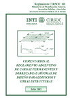 Reglamento CIRSOC 101 Ministerio de Planificación Federal, Inversión Pública y Servicios Secretaría de Obras Públicas de la Nación INTI Instituto Nacional de Tecnología Industrial CIRSOC Centro de Investigación de los Reglamentos Nacionales de Seguridad para las Obras Civiles COMENTARIOS AL REGLAMENTO ARGENTINO DE CARGAS PERMANENTES Y SOBRECARGAS MÍNIMAS DE DISEÑO PARA EDIFICIOS Y OTRAS ESTRUCTURAS Julio 2005 COMENTARIOS AL REGLAMENTO ARGENTINO DE CARGAS PERMANENTES Y SOBRECARGAS MÍNIMAS DE DISEÑO PARA EDIFICIOS Y OTRAS ESTRUCTURAS EDICIÓN JULIO 2005 Av. Cabildo 65, Subsuelo (C1426AAA) Buenos Aires – República Argentina TELEFAX. (54 11) 4779-5271 / 4779-5273 E-mail: cirsoc@inti.gob.ar cirsoc@ffmm.gov.ar INTERNET: www.inti.gob.ar/cirsoc Primer Director Técnico (h 1980): Ing. Luis María Machado Directora Técnica: Inga. Marta S. Parmigiani Coordinadora Área Acciones: Inga. Alicia M. Aragno Área Estructuras de Hormigón: Ing. Daniel A. Ortega Área Administración, Finanzas y Promoción: Lic. Mónica B. Krotz Área Venta de Publicaciones: Sr. Néstor D. Corti © 2008 Editado por INTI INSTITUTO NACIONAL DE TECNOLOGÍA INDUSTRIAL Av. Leandro N. Alem 1067 – 7° piso - Buenos Aires. Tel. 4515-5000/5001 Queda hecho el depósito que fija la ley 11.723. Todos los derechos, reservados. Prohibida la reproducción parcial o total sin autorización escrita del editor. Impreso en la Argentina. Printed in Argentina. ORGANISMOS PROMOTORES Secretaría de Obras Públicas de la Nación Subsecretaría de Vivienda de la Nación Instituto Nacional de Tecnología Industrial Instituto Nacional de Prevención Sísmica Ministerio de Hacienda, Finanzas y Obras Públicas de la Provincia del Neuquén Gobierno de la Ciudad de Buenos Aires Dirección Nacional de Vialidad Vialidad de la Provincia de Buenos Aires Consejo Interprovincial de Ministros de Obras Públicas Cámara Argentina de la Construcción Consejo Profesional de Ingeniería Civil Cámara Industrial de Cerámica Roja Asociación de Fabricantes de Cemento Pórtland Instituto Argentino de Normalización Techint Acindar MIEMBROS ADHERENTES Asociación Argentina de Tecnología del Hormigón Asociación Argentina de Hormigón Estructural Asociación Argentina de Hormigón Elaborado Asociación Argentina del Bloque de Hormigón Asociación de Ingenieros Estructurales Centro Argentino de Ingenieros Instituto Argentino de Siderurgia Telefónica de Argentina Transportadora Gas del Sur Quasdam Ingeniería Sociedad Central de Arquitectos Sociedad Argentina de Ingeniería Geotécnica Colegio de Ingenieros de la Provincia de Buenos Aires Cámara Argentina del Aluminio y Metales Afines Cámara Argentina de Empresas de Fundaciones de Ingeniería Civil ASESORES QUE INTERVINIERON EN LA REDACCIÓN DE LOS COMENTARIOS AL REGLAMENTO ARGENTINO DE CARGAS PERMANENTES Y SOBRECARGAS MÍNIMAS DE DISEÑO PARA EDIFICIOS Y OTRAS ESTRUCTURAS CIRSOC 101 Ing. Jorge Fontán Balestra COLABORADORES: Ing. Alicia Aragno Coordinadora Área Acciones INTI-CIRSOC Reconocimiento Especial El INTI-CIRSOC agradece muy especialmente a las Autoridades de la American National Standards Institute (ANSI) y de la American Society of Civil Engineers (ASCE) por habernos permitido adoptar como base para el desarrollo de este Reglamento, los Capítulos 3 y 4 del documento “Minimum Design Loads for Building and Other Structures” conocido como ASCE 7-95 (Revisión de ANSI-ASCE 7-93) y posteriormente ASCE 7-98. INDICE CAPÍTULO C3. CARGAS PERMANENTES 1 CAPÍTULO C4. SOBRECARGAS DE DISEÑO C4.1. CARGAS UNIFORMEMENTE DISTRIBUIDAS 3 C4.1.1.Sobrecargas de diseño 3 Tabla C4.1. Sobrecargas mínimas uniformemente distribuidas 4 Tabla C4.2. Estadísticas de sobrecarga típica 7 C4.3. CARGAS EN PASAMANOS, SISTEMAS DE PROTECCIÓN, SISTEMAS DE BARRAS AGARRADERAS Y SISTEMAS DE BARRERAS PARA VEHÍCULOS 7 C4.3.2. Cargas 7 C4.5. SISTEMAS DE CARGAS PARCIALES 8 C4.8. REDUCCIÓN DE LA SOBRECARGA 8 C4.8.1. Generalidades C4.8.2. Sobrecargas pesadas 8 9 Tabla C4.3. Factor de sobrecarga para elementos estructurales 11 C4.9. SOBRECARGAS MÍNIMAS PARA CUBIERTAS 11 C4.9.1. Cubiertas planas, horizontales o con pendiente y curvas C4.9.2. Cubiertas para propósitos especiales 11 11 C4.10. SOBRECARGAS PARA LOCALES DESTINADOS A COCHERAS DE AUTOMÓVILES 12 C4.11. SOBRECARGAS PARA BALCONES 12 C4.14. CARGAS EN PUENTES GRÚA 12 BIBLIOGRAFÍA 15 ANEXO I – CARGAS DE LLUVIA C I.1. SIMBOLOGÍA 17 C I.2. DESAGÜE DE CUBIERTAS 17 Reglamento CIRSOC 101, Comentarios I C I.3. CARGAS DE LLUVIA DE DISEÑO 17 C I.4. INESTABILIDAD POR ACUMULACIÓN DE AGUA 18 C I.5. DESAGÜE CONTROLADO 18 Tabla C I.1. Caudal de varios sistemas de desagüe con diferentes sobre elevaciones hidráulicas 19 C I.6. EJEMPLOS Ejemplo 1. Ejemplo 2. 20 21 BIBLIOGRAFIA DEL ANEXO I Reglamento Argentino de cargas permanentes y sobrecargas mínimas 25 II COMENTARIOS AL CAPÍTULO 3 CARGAS PERMANENTES C3.1.1. La experiencia ha mostrado, que existen situaciones que, si no se consideran en el diseño, pueden reducir la futura utilidad del edificio o reducir su margen de seguridad. Entre ellas están: 1. Cargas permanentes: Han habido numerosos ejemplos en los cuales los pesos reales de los elementos y materiales de construcción han excedido en la obra los valores usados en el diseño. Se aconseja no solo ser prudente en el uso de los valores tabulados, sino ser lo más preciso posible en la consideración de las medidas geométricas (altura, ancho, espesor) de los elementos constructivos. 2. Instalaciones futuras: Cuando parezca probable la realización de instalaciones o modificaciones futuras, se deberán prever las cargas correspondientes. Se llama la atención también a la posibilidad de cambios temporarios en el uso del edificio. 3. Particiones: Se debe prestar especial consideración a los tipos y posiciones probables de las particiones (paredes o tabiques divisorios), ya que una previsión insuficiente de particiones puede reducir la futura sobrecarga del e