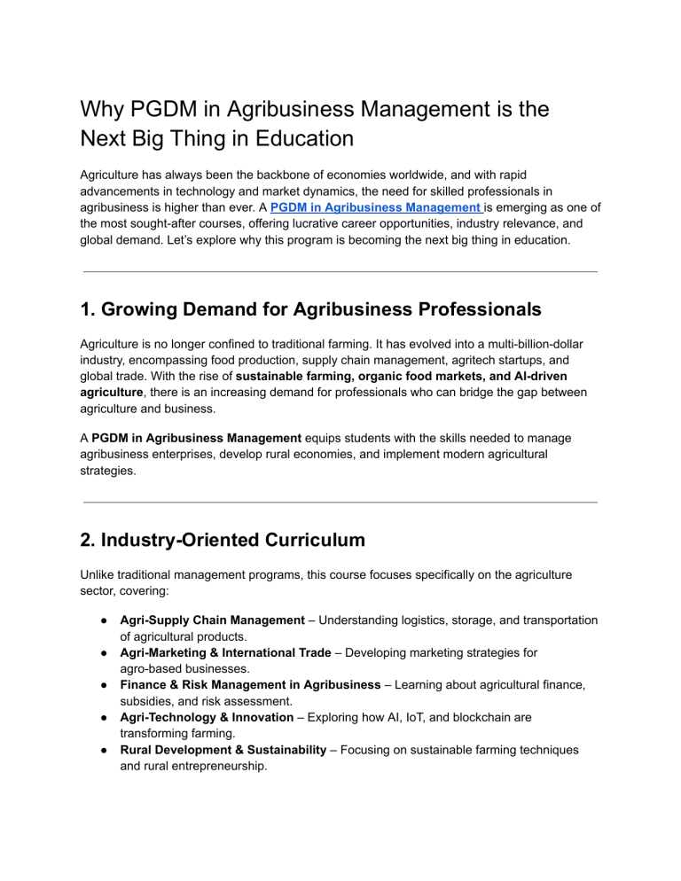 Why PGDM in Agribusiness Management is the Next Big Thing in Education Agriculture has always been the backbone of economies worldwide, and with rapid advancements in technology and market dynamics, the need for skilled professionals in agribusiness is higher than ever. A PGDM in Agribusiness Management is emerging as one of the most sought-after courses, offering lucrative career opportunities, industry relevance, and global demand. Let’s explore why this program is becoming the next big thing in education. 1. Growing Demand for Agribusiness Professionals Agriculture is no longer confined to traditional farming. It has evolved into a multi-billion-dollar industry, encompassing food production, supply chain management, agritech startups, and global trade. With the rise of sustainable farming, organic food markets, and AI-driven agriculture, there is an increasing demand for professionals who can bridge the gap between agriculture and business. A PGDM in Agribusiness Management equips students with the skills needed to manage agribusiness enterprises, develop rural economies, and implement modern agricultural strategies. 2. Industry-Oriented Curriculum Unlike traditional management programs, this course focuses specifically on the agriculture sector, covering: ● Agri-Supply Chain Management – Understanding logistics, storage, and transportation of agricultural products. ● Agri-Marketing & International Trade – Developing marketing strategies for agro-based businesses. ● Finance & Risk Management in Agribusiness – Learning about agricultural finance, subsidies, and risk assessment. ● Agri-Technology & Innovation – Exploring how AI, IoT, and blockchain are transforming farming. ● Rural Development & Sustainability – Focusing on sustainable farming techniques and rural entrepreneurship. This industry-aligned curriculum ensures that graduates are job-ready and can contribute to the sector immediately. 3. Government & Private Sector Support The Indian government has launched several schemes such as PM-Kisan, National Agriculture Market (eNAM), and Agri-Infra Fund, which emphasize agribusiness growth. Additionally, global investors and venture capitalists are backing agritech startups, creating ample opportunities for management professionals. ✅ ✅ ✅ ✅ Graduates of PGDM in Agribusiness Management can work with: Government agencies in policy-making and rural development. Agritech startups developing AI-based farming solutions. Multinational food corporations managing supply chains. Banks and financial institutions offering agri-loans and investment strategies. 4. Lucrative Career Opportunities The career scope for agribusiness graduates is expanding rapidly. Some of the top job roles include: 🔹 Agribusiness Manager – Managing agribusiness operations and supply chains. 🔹 Commodity Trader – Handling global trade of agricultural commodities. 🔹 Farm Management Consultant – Advising farmers on tech-driven solutions. 🔹 Agritech Specialist – Working with startups to implement AI and blockchain in farming. 🔹 Food Supply Chain Analyst – Ensuring efficient food distribution. With competitive salary packages ranging from ₹6-15 LPA, this field offers financial stability and career growth. 5. Sustainable and Impactful Career Path In a world facing climate change, food security issues, and increasing population, agribusiness professionals have a crucial role in creating sustainable agricultural models. A PGDM in Agribusiness Management allows individuals to make a real impact by improving food production, reducing waste, and implementing eco-friendly farming techniques. With global initiatives like UN’s Sustainable Development Goals (SDGs) focusing on food security and sustainability, this program aligns with the future of responsible business practices. Top Institutes Offering PGDM in Agribusiness Management 🏫 🏫 🏫 🏫 🏫 Several top B-schools in India offer this specialized PGDM program, including: IIM Ahmedabad – Agri-Business Management (FABM) National Institute of Agricultural Extension Management (MANAGE), Hyderabad International Institute of Business Study, Bangalore Xavier Institute of Management (XIMB), Bhubaneswar Institute of Rural Management, Anand (IRMA) These institutes provide industry exposure, internships, and placements with leading agribusiness firms. Conclusion A PGDM in Agribusiness Management is more than just an academic program—it's a gateway to a high-impact career that blends business, technology, and sustainability. With rapid growth in agritech, food processing, and rural development, professionals in this field are set to revolutionize the agriculture industry.