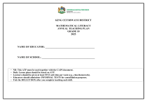KING CETSHWAYO DISTRICT MATHEMATICAL LITERACY ANNUAL TEACHING PLAN GRADE 10 2025 NAME OF EDUCATOR: ________________________________________ NAME OF SCHOOL: ___________________________________________ • • • • • NB: This ATP must be used together with the CAPS document. Daily Lesson plans should be based on ATP. Learners should be given at least FIVE activities per week (e.g., class/homework). Educators should administer INFORMAL TESTS for consolidation purposes. Tick the BULLET BOX after you complete teaching each skill. GRADE 10 MATHEMATICAL LITERACY ANNUAL TEACHING PLAN (ATP) 2025 TERM 1 TERM 1 Week 1 Week 2 CAPS Topic Note Week 4 Week 5 NUMBERS AND CALCULATIONS WITH NUMBERS Week 6 Week 7 Operations with point/comma; thousand separators (1000, 1000 000, etc.). whole numbers and decimals with and without a calculator (BODMAS) Positive and negative Use a calculator to numbers in contexts; conversions between number formats (e.g., dozen, over, century, etc.) find a square, cube, or square root of a number. Operations with Week 8 PATTERNS RELATIONSHIPS & REPRESENTATIONS The topics “Numbers and calculations with numbers” and “Patterns, relationships and representations” have been included in this work schedule to provide teachers with the opportunity to revise the concepts contained in these topics. However, it is essential that these concepts are not taught in the absence of contexts but that learners are exposed to these concepts in realistic scenarios (CAPS: Page 15) Number formats: Operations: Rounding, Ratio, Rates and Percentage: Patterns & Relations: Pattern and relationship representations: Decimal Concepts, skills, and values Week 3 Rounding, Ratio, Rates, Direct and Inverse Patterns and proportion, Percentages Table with dependent and independent relationships: Rounding-off: to a specified number of decimal places, to the nearest whole number, up or down Ratios: situations, formats and calculations Rates: meaning, types and calculations Percentage: notation and calculations Percentage increase and decrease calculations Constant, Direct proportion and inverse proportion relationships. Tables with input and output values values/variables Equations Graphs Interpretation of Tables and Graphs Example: Determine: dependent and independent values/variables, zero values, min/max values, missing values Write a story from a graph or draw a graph from a fractions Week 9 DATA HANDLING Number and Calculations with numbers Patterns Relations and Representations Data Handling Mean Median Mode Range Analyse data represented by the above story Page no. in CAPS % Term Curriculum Coverage % Year Curriculum Coverage Anticipated Date of completion Page 28 Page 29 Page 30 - 35 Page 38 Page 39 - 42 7.3% 12.2% (19.5%) 24.4% (43.9%%) 12.2% (56.1%) 24.4% (80.5%) 19.5% (100%) 2.3% 3.9% (6.2%) 7.8% (14%) 3.9% (17.9%) 7.8% (25.7%) 6.2% (31.9%) 17/01/2025 24/01/2025 07/02/2025 14/02/2025 28/02/2025 Basic number concepts – Grade 7-9 Mathematics Basic number concepts – Grade 7-9 Mathematics Basic number concepts – Grade 7-9 Mathematics Number patterns; Basic knowledge of graphs Number patterns; Basic knowledge of graphs ONE PAPER ONLY 75 MARKS: 1½ Hours Question 1: 20% (Level 1) Questions 2 to 5: Integration of term one topics Page 83 – 84 14/03/2025 Actual Date of completion DH control Signature and Date Prerequisite preknowledge CAPS Policy Document CAPS Aligned Textbooks Examination Guidelines Calculators Any other relevant resources Resources (other than textbook) to enhance learning Informal assessment; remediation SBA (Formal Assessment) Short tests on number formats Basic number concepts – Grade 7-9 Mathematics CAPS NEWSPAPERS and DATA BASES/SOURCES CAPS Aligned Textbooks Examination Guidelines Calculators Worksheet on rounding, ratio, proportion, and percentage Short tests on graphs Short test on Data (all concepts) INVESTIGATION AND CONTROLLED TEST Page 2 of 5 Week 11 REVISION/CONTROLLED TEST Developing questions. Collecting data Classifying and organizing data. Summarising data. - Week 10 Mathematical Literacy ATP 2025 TERM 2 TERM 2 Week 1 CAPS Topic Week 3 FINANCE Financial documents: Topic, concepts, skills, and values Week 2 Week 4 Week 5 MEASUREMENT Tariff systems: Household bills Shopping doc Banking doc Household Budget, Municipal tariff Telephone tariff Transport tariff Bank fees The terminology used in the above document, Calculate: Cost using tariff and /or formula, Conversions: Metric system Conversion using factors/tables. Time formats conventions/conversion (sec – min – hours – days – weeks – months – years – decade) Week 7 MAPS, PLANS & OTHER REPRESENTATIONS Measuring & estimating: Length Distance Weight/mass Volume Temperature Time Scale: Maps: Use Scale in the Describe the position of an form: 1: 500 and bar scales to: Calculate the actual distance and length from the given map/plan measurements. Calculate costs of products and services. Draw & interpret graphs of Week 6 object (e.g., building) in relation to its surroundings. Describe the position of a PROBABILITY Probability Expression and Representation Expression of probability Events and building) in relation to surrounding buildings. outcomes/results along, up, down, etc.) event. Prediction Find location, Follow & develop Relative frequency directions. and theoretical Direction indicators (left, right, probability of an House building numbering Numbering system used for various tariffs system Week 8 Tree diagrams and Two-way tables sitting in sports stadiums Page no. in CAPS % Term Curriculum Coverage % Year Curriculum Coverage Anticipated Date of completion Actual Date of completion DH control Signature and Date Prerequisite preknowledge Page 49 - 50 Page 50 Page 63 Page 64 - 67 Page 73 Page 74 - 75 Page 91 - 93 7.8% 13.2% (21%) 7.8% (28.8%) 10.6% (39.4%) 13.2% (52.6%) 26.4% (79%) 21% (100%) 2.3% (34.2%) 3.9% (38.1%) 2.3% (40.4%) 11/04/2025 17/04/2025 25/04/2025 Grades 8 & 9 work Financial