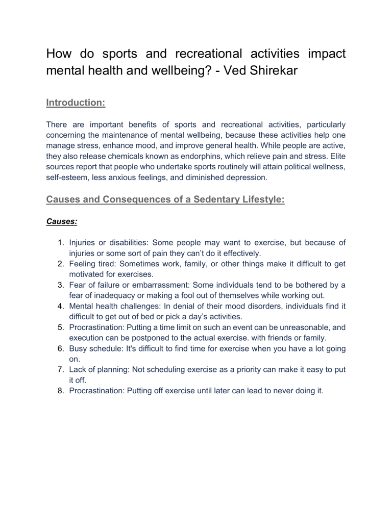 How do sports and recreational activities impact mental health and wellbeing? - Ved Shirekar Introduction: There are important benefits of sports and recreational activities, particularly concerning the maintenance of mental wellbeing, because these activities help one manage stress, enhance mood, and improve general health. While people are active, they also release chemicals known as endorphins, which relieve pain and stress. Elite sources report that people who undertake sports routinely will attain political wellness, self-esteem, less anxious feelings, and diminished depression. Causes and Consequences of a Sedentary Lifestyle: Causes: 1. Injuries or disabilities: Some people may want to exercise, but because of injuries or some sort of pain they can’t do it effectively. 2. Feeling tired: Sometimes work, family, or other things make it difficult to get motivated for exercises. 3. Fear of failure or embarrassment: Some individuals tend to be bothered by a fear of inadequacy or making a fool out of themselves while working out. 4. Mental health challenges: In denial of their mood disorders, individuals find it difficult to get out of bed or pick a day’s activities. 5. Procrastination: Putting a time limit on such an event can be unreasonable, and execution can be postponed to the actual exercise. with friends or family. 6. Busy schedule: It's difficult to find time for exercise when you have a lot going on. 7. Lack of planning: Not scheduling exercise as a priority can make it easy to put it off. 8. Procrastination: Putting off exercise until later can lead to never doing it. Consequences: 1. Burning fewer calories: This increases your chances of gaining weight. 2. You may lose muscle strength and endurance because you are not working your muscles as much. 3. Your bones may get weaker and lose certain minerals. 4. Your metabolism may be influenced, and your body may have more difficulty breaking down fats and sweets. 5. Your immune system may not be working as well. 6. You could have lower blood circulation. 7. Your body may have greater inflammation. Perspective (Global, National, and Local): Global Perspective: https://www.ncbi.nlm.nih.gov/pmc/articles/PMC9902068/ Sports and recreation can significantly improve mental health. Physical activity helps reduce anxiety, depression, and stress. These activities boost mood, self-esteem, and social connection. Community-based sports foster mental resilience, teamwork, and coping skills. Regular exercise can also enhance physical health, leading to a better overall quality of life. National Perspective: https://journals.sagepub.com/doi/10.1177/0020764019871314 Sports and recreation in India offer a positive impact on mental health. Physical activity can counteract rising mental health disorders like stress and anxiety. Government initiatives, like Fit India, encourage sports participation. Yoga, a popular practice, reduces mental discomfort and increases mindfulness. Local Perspective: Based on multiple sources (all mentioned in citations) Sports and recreation have become an integral part of life in Navi Mumbai, offering a range of benefits for physical and mental health. Local initiatives have made these activities more accessible to residents of all ages. From cricket and football to yoga and meditation, there's something for everyone. These activities not only promote physical fitness but also foster a sense of community, reduce stress, and boost selfesteem. The city's growing network of fitness centers and sports complexes has made it easier for residents to incorporate exercise into their daily routines. By participating in sports and recreation, Navi Mumbai citizens are actively contributing to their overall well-being and creating a healthier, happier community. Course of Action: Promoting physical activity is essential for improving public health and well-being. Making exercise accessible and appealing requires offering a variety of options that cater to different interests and fitness levels, including community-based activities, accessible facilities, and affordable choices. Creating a supportive environment at work and highlighting the social benefits of physical activity can also increase participation. People can easily incorporate more physical activity into their routines, such as walking or cycling for short trips or taking active breaks. Addressing barriers like time constraints or safety concerns and supporting those with health conditions ensures that everyone can benefit from regular exercise. Source of Analysis: https://www.youtube.com/watch?v=TrjEU97AeQ0 In this video, the speakers speak about some problems related to mental health and how sports helped out. For instance, in this case the speakers explain, it was fatigue, anxiety and then depression. The speakers also explain how, in their case, it was possible to develop an isolated condition and blame their heads for the issues of mental health. However, the speakers discovered that sports were working as a comforting solution towards those problematic issues. Sports made the speaker feel more connected to people, relieve their stress as well as self- image. https://www.youtube.com/watch?v=hmFQqjMF_f0 The speaker talks about the endorphins released during exercise. They say that these natural hormones can induce euphoria, commonly referred to as ‘the runner’s high’. Endorphin spike and regular exercise can enhance your attention, happiness, and even your recall. Reflection: Sports and recreation have been instrumental in my mental health journey. My parents encouraged an active lifestyle, which led to my discovery table tennis and gym workouts. These activities have been invaluable in reducing stress, improving my mood, and providing a sense of purpose. Conclusion: In conclusion, sports and recreational activities are essential for mental health and well-being. They reduce stress, anxiety, and depression, while also improving mood, self-esteem, and social c