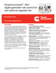 PowerCommand® 1301 digital generator set control kit and optional upgrade kits Description Features The 1301 control is a microprocessor-based generator set monitoring, metering and control system. The control provides a simple operator interface to the generator set, digital voltage regulation, digital engine speed governing, start/stop control, 12 V/24 V battery operation and generator set protective functions. The integration of all functions into a single control system provides enhanced reliability and performance compared to conventional generator set control systems. 12 and 24 VDC battery operation. The 1301 generator set control is designed for mounting directly on the generator set and is suitable for use on a wide range of generator sets in non-paralleling applications. It is compatible with reconnectable alternators up to 600 VAC line-to-line and can be configured for any frequency, voltage and power connection configuration from 120-600 VAC line-to-line. It functions over a voltage range from 8 VDC to 30 VDC. The control offers a wide range of standard and optional features so custom control configurations are not needed to meet application specifications. Power for the control is derived from the generator set starting batteries. Digital voltage regulation - Full wave rectified single phase (line-to-line) sensing. Digital engine speed governing (optional) Provides isochronous frequency regulation. Generator set monitoring - Monitors status of all critical engine and alternator functions. Configurable for single or three phase AC metering. Engine starting - Includes relay drivers for start, fuel shut off (FSO) and glow plug/spark ignition power. Start disconnect is achieved by monitoring the battery charging alternator. Generator set protection - Engine and alternator. Operator display panel - Provides easy to use symbolic/English text operator display of critical generator set parameters and operating history. Advanced serviceability - Utilizing InPower™, a PCbased software service tool. Environmental protection - The control system is designed for reliable operation in harsh environments. The core control board is an encapsulated module that is fully protected from the elements. Configurable inputs and outputs - Two discrete inputs and two dry contact relay outputs. Certifications - Suitable for use on generator sets that are designed, manufactured, tested and certified to relevant UL, NFPA, ISO, IEC, Mil Std. and CE standards. Warranty and service - Backed by a comprehensive warranty and worldwide distributor service network. ©2010 Cummins Power Generation Inc. All rights reserved. Cummins Power Generation and Cummins are registered trademarks of Cummins Inc. InPower and “Our energy working for you.” are trademarks of Cummins Power Generation. Other company, product, or service names may be trademarks or service marks of others. Specifications are subject to change without notice. S-1506d (6/10) Page 1 of 7 Control system The 1301 Control system includes all functions necessary to locally or remotely start and stop, regulate voltage and protect the generator set. Run/off/auto - In the off mode the generator set is immediately shut down (if running) and cannot be started. In the run mode the generator set will execute its start sequence and operate at rated speed and voltage. In the auto mode, the generator set can be started with a start signal from a remote device, such as an automatic transfer switch. Operation of the switch to the off position also resets faults in the control. Status indications - The control includes a lamp driver for an external fault/status indication. When this feature is used, it provides the operator with basic status information on the generator set. Functions displayed include: • The lamp flashes during preheat (when used) and while the generator set is starting. • The lamp indicates ready to load by flashing until the generator set is at rated voltage and frequency, then glowing continuously. • Fault conditions are displayed by flashing a two-digit fault code number. Engine speed governing The control is available with an optional governor power stage. This power stage amplifies control signals to directly drive an engine fuel control valve. The run/off/auto switch function is integrated into the display panel; therefore an external switch is not required. All data on the control can be viewed by scrolling through screens with the navigation keys. The control displays current active faults and a timeordered history of previous faults. LED indicating lamps - The display panel includes LED indicating lamps for the following functions: - Not in auto - Shutdown - Warning - Remote start - Auto - Run Operator adjustments - The display panel includes provisions for many set up and adjustment functions via raise/lower switches. Functions that can be adjusted by the operator include: - Time delay start (0-300 seconds) - Time delay stop (0-600 seconds) - Alternator voltage (plus or minus 5%) Generator set hardware data - Access to the control and software part number, generator set rating in kVar and generator set model number is provided from the display panel or InPower. Data logs - Engine run time, controller on time, number of runs and number of start attempts are available from the display panel or through InPower. Fault history - Provides a record of the most recent fault conditions with control hours time stamp. Up to 5 events are stored in the control non-volatile memory. Display panel The control includes a digital display panel that may be either locally or remotely mounted. The operator screens are made up of internationally accepted symbols or English test, so translations are not required. The display is composed of a backlit LCD display, with a series of 6 generator status LED lamps. The display is accompanied by six tactile-feel membrane switches that are used by the operator to navigate through control menus and to make con