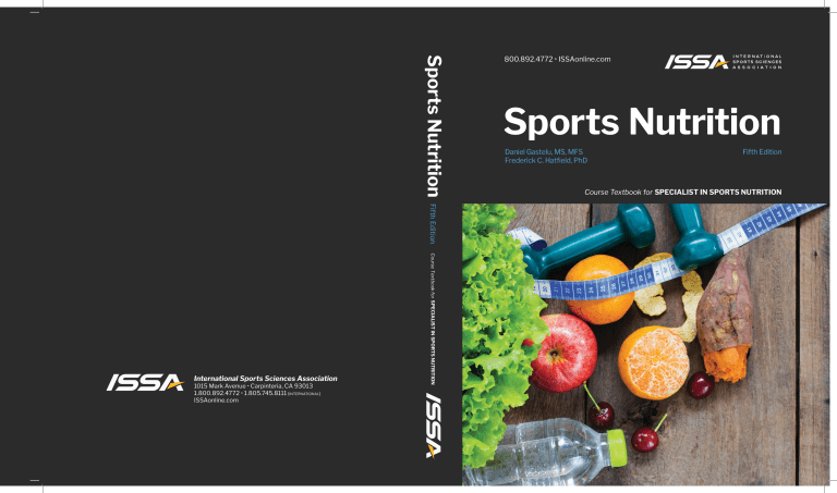 Sports Nutrition Fifth Edition 1015 Mark Avenue • Carpinteria, CA 93013 1.800.892.4772 • 1.805.745.8111 (international) ISSAonline.com Course Textbook for SPECIALIST IN SPORTS NUTRITION International Sports Sciences Association 800.892.4772 • ISSAonline.com Sports Nutrition Daniel Gastelu, MS, MFS Frederick C. Hatfield, PhD Fifth Edition Course Textbook for SPECIALIST IN SPORTS NUTRITION Sports Nutrition Daniel Gastelu, MS, MFS Frederick C. Hatfield, PhD Sports Nutrition (Edition 5) Official course text for: International Sports Sciences Association’s Specialist in Sports Nutrition Program 10 9 8 7 6 5 4 3 2 Copyright © 2019 International Sports Sciences Association. Published by the International Sports Sciences Association, Carpinteria, CA 93013. All rights reserved. No part of this work may be reproduced or transmitted in any form or by any electronic, mechanical, or other means, now known or hereafter invented, including xerography, photocopying, and recording, or in any information storage and retrieval system without the written permission of the publisher. Direct copyright, permissions, reproduction, and publishing inquiries to: International Sports Sciences Association, 1015 Mark Avenue, Carpinteria, CA 93013 1.800.892.4772 • 1.805.745.8111 (local) • 1.805.745.8119 (fax) Revie wers Charles Staley, Alex Hoffmann Editors Charles Staley, Judy Hobbisiefken, Connie Bernardo, Heather Rothman Disclaimer of Warranty This text is informational only. The data and information contained herein are based upon information from various published and unpublished sources that represents training, health, and nutrition literature and practice summarized by the author and publisher. The publisher of this text makes no warranties, expressed or implied, regarding the currency, completeness, or scientific accuracy of this information, nor does it warrant the fitness of the information for any particular purpose. The information is not intended for use in connection with the sale of any product. Any claims or presentations regarding any specific products or brand names are strictly the responsibility of the product owners or manufacturers. This summary of information from unpublished sources, books, research journals, and articles is not intended to replace the advice or attention of health care professionals. It is not intended to direct their behavior or replace their independent professional judgment. If you have a problem or concern with your health, or before you embark on any health, fitness, or sports training programs, seek clearance and guidance from a qualified health care professional. Table of Contents PART ONE: NUTRIENTS AND ATHLETIC PERFORMANCE FROM A TO Z, P.1 1Sports Nutrition: The Vital Link to Supercharging Athletic Performance, p. 3 2Food, Ingredients, and Nutrients: An Overview, p. 27 3Carbohydrates: The Ultimate Performance Food, p. 73 4Protein and Amino Acids: Muscle Builders and More, p. 107 5Lipids and the Athlete: Energy and Growth Factors, p. 157 6 Water and Oxygen, p. 177 7 Vitamins, p. 205 8 Minerals, p. 233 9Metabolites and Botanical Supplements, p. 255 PART THREE: FINE TUNING YOUR PERFORMANCE, P. 437 10Guide to Food and Supplement Product Labeling, p. 289 17Sports Nutrition Approach Concepts and Examples, p. 439 11Label Claims for Conventional Foods and Dietary Supplements, p. 313 18Fat Loss and Muscle Gain for Athletes, p. 501 PART TWO: ANATOMY AND METABOLISM DETERMINE NUTRIENT NEEDS, P. 345 12Anatomy of an Athlete: Cells, Tissues, and Systems, p. 347 13Digestion and Absorption, p. 367 14 Body Composition, p. 383 19Glycogen Loading (Super Compensation), p. 523 20 Special Concerns of Athletic Females, p. 539 21Putting It All Together: Athletic Performance Improvement Approach, p. 555 APPENDIX 15 Calorie Needs and Metabolism, p. 403 References, p. 573 16 Dietary Guidelines for Americans, p. 425 Glossary of Key Words, p. 629 This page is intentionally blank. PART ONE Nutrients and Athletic Performance from A to Z Sports Nutrition: The Vital Link to Supercharging Athletic Performance, p. 3 Food, Ingredients, and Nutrients: An Overview, p. 27 Carbohydrates: The Ultimate Performance Food, p. 73 Protein and Amino Acids: Muscle Builders and More, p. 107 Lipids and the Athlete: Energy and Growth Factors, p. 157 Water and Oxygen, p. 177 Vitamins, p. 205 Minerals, p. 233 etabolites and Botanical M Supplements, p. 255 Guide to Food and Supplement Product Labeling, p. 289 Label Claims for Conventional Foods and Dietary Supplements, p. 313 This page is intentionally blank. Topics Covered In This Unit Introduction Innovative sports nutrition course A word about sports nutrition supplements and other sports nutrition products United States and Canada Dietary Reference Values Athletic perfection from imperfection The Dynamic Nutrition Approach Origins of sports nutrition odern science discovers how M nutrition improves athletic performance The new age of sports nutrition Nutrition defined The three Es of nutrition Essential Nutrition for Health and Survival Essential Nutrition for Athletic Performance Performance Daily Intakes (The PDIs™) Effectiveness and safety Healthy adults Nutrition intake approaches Conclusion UNIT 1 SPORTS NUTRITION: THE VITAL LINK TO SUPERCHARGING ATHLETIC PERFORMANCE 4 | Unit 1 Unit Outline I. Introduction XI. II. Innovative sports nutrition course XII. The three Es of nutrition III.A word about sports nutrition supplements and other sports nutrition products IV. United States and Canada V. Dietary Reference Values VI.Athletic perfection from imperfection VII. The Dynamic Nutrition Approach VIII. Origins of sports nutrition IX.Modern science discovers how nutrition improves athletic performance X. The new age of sports nutrition Nutrition defined a. Essential Nutrition for Health and Survival i. Dietary Reference Intakes ii. Dietary Reference Intake terminology iii.Essential nutrition for optimum health (The ODAs) b.Essential Nutrition for Athletic