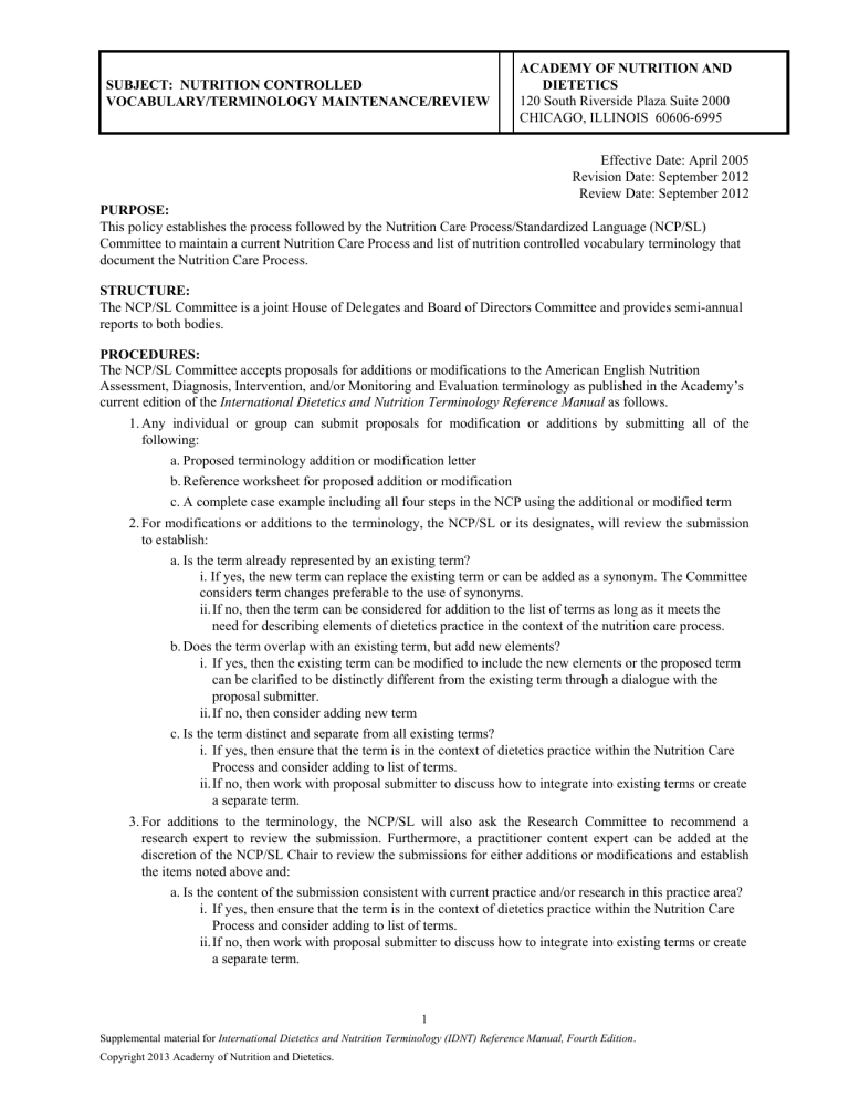 SUBJECT: NUTRITION CONTROLLED VOCABULARY/TERMINOLOGY MAINTENANCE/REVIEW ACADEMY OF NUTRITION AND DIETETICS 120 South Riverside Plaza Suite 2000 CHICAGO, ILLINOIS 60606-6995 Effective Date: April 2005 Revision Date: September 2012 Review Date: September 2012 PURPOSE: This policy establishes the process followed by the Nutrition Care Process/Standardized Language (NCP/SL) Committee to maintain a current Nutrition Care Process and list of nutrition controlled vocabulary terminology that document the Nutrition Care Process. STRUCTURE: The NCP/SL Committee is a joint House of Delegates and Board of Directors Committee and provides semi-annual reports to both bodies. PROCEDURES: The NCP/SL Committee accepts proposals for additions or modifications to the American English Nutrition Assessment, Diagnosis, Intervention, and/or Monitoring and Evaluation terminology as published in the Academy’s current edition of the International Dietetics and Nutrition Terminology Reference Manual as follows. 1. Any individual or group can submit proposals for modification or additions by submitting all of the following: a. Proposed terminology addition or modification letter b. Reference worksheet for proposed addition or modification c. A complete case example including all four steps in the NCP using the additional or modified term 2. For modifications or additions to the terminology, the NCP/SL or its designates, will review the submission to establish: a. Is the term already represented by an existing term? i. If yes, the new term can replace the existing term or can be added as a synonym. The Committee considers term changes preferable to the use of synonyms. ii. If no, then the term can be considered for addition to the list of terms as long as it meets the need for describing elements of dietetics practice in the context of the nutrition care process. b. Does the term overlap with an existing term, but add new elements? i. If yes, then the existing term can be modified to include the new elements or the proposed term can be clarified to be distinctly different from the existing term through a dialogue with the proposal submitter. ii. If no, then consider adding new term c. Is the term distinct and separate from all existing terms? i. If yes, then ensure that the term is in the context of dietetics practice within the Nutrition Care Process and consider adding to list of terms. ii. If no, then work with proposal submitter to discuss how to integrate into existing terms or create a separate term. 3. For additions to the terminology, the NCP/SL will also ask the Research Committee to recommend a research expert to review the submission. Furthermore, a practitioner content expert can be added at the discretion of the NCP/SL Chair to review the submissions for either additions or modifications and establish the items noted above and: a. Is the content of the submission consistent with current practice and/or research in this practice area? i. If yes, then ensure that the term is in the context of dietetics practice within the Nutrition Care Process and consider adding to list of terms. ii. If no, then work with proposal submitter to discuss how to integrate into existing terms or create a separate term. 1 Supplemental material for International Dietetics and Nutrition Terminology (IDNT) Reference Manual, Fourth Edition. Copyright 2013 Academy of Nutrition and Dietetics. 4. The reviewers will provide a recommendation for accepting (adding or modifying the terminology) or denying the submission to the NCP/SL committee at the routine face-to-face meetings or teleconferences. 5. The NCP/SL will prepare a summary of comments and one representative of the NCP/SL may confer with the proposal submitter after the initial discussion to answer questions and discuss the initial input from the NCP/SL Committee. If the proposal submitter is not satisfied with the direction proposed by the NCP/SL, then they may be invited to submit additional documentation and have time on the next teleconference/meeting agenda to personally present their concerns. 6. The NPC/SL Committee will review submissions June-December of odd years (2011, 2013, 2015, etc.) in preparation for IDNT Manual publication in the following even year. Submissions must be postmarked on or before March 31 of odd years. Between March and May of odd years, submissions will be reviewed by staff or designees for completeness with requests for additional information as needed. Submissions sent after March 31 of odd years will be considered at the discretion of the NCP/SL Committee and may be delayed until the following revision. It is anticipated that submission decisions will be sent to the contact person by May 31 of even years. 7. Changes or modifications accepted by the NCP/SL will be integrated into the Nutrition Assessment, Diagnosis, Intervention, and/or Monitoring and Evaluation terminology that is published on a biennial (every other year) basis. 8. Any changes to the terminology for countries outside of the U.S. and for use in a language other than the source language (American English), including, but not limited to, culturally acceptable concepts or alternate spellings for certain terms, e.g. Fibre vs. Fiber are addressed through country/organization translation agreements. Please contact ncpslpermissions@eatright.org. STAFFING: Research and Strategic Business Development provide staff support for Nutrition Care Process/Standardized Language (NCP/SL) Committee functions. ATTACHMENTS: 1. Letter template for proposing a New Term for Nutrition Assessment AND/OR Monitoring and Evaluation terminology 2. Letter template for proposing a New Term for Nutrition Diagnostic terminology 3. Letter template for proposing a New Term for Nutrition Intervention terminology 4. Letter template for proposing Modifications to the Nutrition Assessment, Diagnosis, Intervention, and/or Monitoring and Evaluation terminology 5. Template for reference sheet to support Additions/