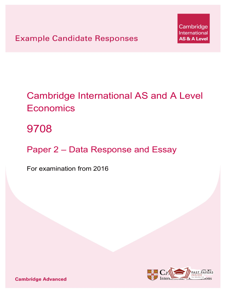 Cambridge International AS and A Level Economics 9708 Paper 2 – Data Response and Essay )RUH[DPLQDWLRQIURP In order to help us develop the highest quality Curriculum Support resources, we are undertaking a continuous programme of review; not only to measure the success of our resources but also to highlight areas for improvement and to identify new development needs. We invite you to complete our survey by visiting the website below. Your comments on the quality and relevance of Cambridge Curriculum Support resources are very important to us. https://www.surveymonkey.co.uk/r/GL6ZNJB Do you want to become a Cambridge consultant and help us develop support materials? Please follow the link below to register your interest. http://www.cie.org.uk/cambridge-for/teachers/teacherconsultants/ Cambridge International Examinations retains the copyright on all its publications. Registered Centres are permitted to copy material from this booklet for their own internal use. However, we cannot give permission to Centres to photocopy any material that is acknowledged to a third party even for internal use within a Centre. Contents Contents .............................................................................................................................. 3 Introduction .......................................................................................................................... 4 Assessment at a glance ....................................................................................................... 6 Paper 2 – Data Response and Essay .................................................................................. 7 Question 1 ........................................................................................................................ 7 Question 2 ...................................................................................................................... 18 Question 3 ...................................................................................................................... 33 Question 4 ...................................................................................................................... 45 Introduction The main aim of this booklet is to exemplify standards for those teaching Cambridge International AS and A Level Economics (9708), and to show how different levels of candidates’ performance (high, middle and low) relate to the subject’s curriculum and assessment objectives. In this booklet candidate responses have been chosen to exemplify a range of answers. Each response is accompanied by a brief commentary explaining the strengths and weaknesses of the answers. For each question, each response is annotated with a clear explanation of where and why marks were awarded or omitted. This, in turn, is followed by examiner comments on how the answer could have been improved. In this way it is possible for you to understand what candidates have done to gain their marks and what they will have to do to improve their answers. At the end there is a list of common mistakes candidates made in their answers for each question. This document provides illustrative examples of candidate work. These help teachers to assess the standard required to achieve marks, beyond the guidance of the mark scheme. Some question types where the answer is clear from the mark scheme, such as short answers and multiple choice, have therefore been omitted. The questions, mark schemes and pre-release material used here are available to download as a zip file from Teacher Support as the Example Candidate Responses Files. These files are: Question Paper 21, June 2016 Question paper 9708_s16_qp_21.pdf Mark scheme 9708_s16_ms_21.pdf Question Paper 42, June 2016 Question paper 9708_s16_qp_42.pdf Mark scheme 9708_s16_ms_42.pdf Past papers, Examiner Reports and other teacher support materials are available on Teacher Support at https://teachers.cie.org.uk 4 Cambridge International AS and A Level Economics 9708 Introduction How to use this booklet Answers by real candidates in exam conditions. These show you the types of answers for each level. Discuss and analyse the answers with your learners in the classroom to improve their skills. Examiner comments are alongside the answers, linked to specific part of the answer. These explain where and why marks were awarded. This helps you to interpret the standard of Cambridge exams and helps your learners to refine their exam technique. This explains how the candidate could have improved their answer and helps you to interpret the standard of Cambridge exams and helps your learners to refine exam technique. This lists the common mistakes candidates made in answering each question. This will help your learners to avoid these mistakes at the exam and give them the best chance of achieving a high mark. Cambridge International AS and A Level Economics 9708 5 Assessment at a glance For Cambridge International AS and A Level Economics, candidates: take Papers 1 and 2 only (for the Cambridge International AS Level qualification) or follow a staged assessment route by taking Papers 1 and 2 (for the Cambridge International AS Level qualification) in one series, then Papers 3 and 4 (for the Cambridge International A Level qualification) in a later series or take Papers 1, 2, 3 and 4 in the same examination series, leading to the full Cambridge International A Level. All components are externally assessed. Weighting Component Paper 1 Multiple Choice 20% 30% 30% 15% 15% 1 hour 30 multiple choice questions based on the Additional A Level syllabus content 30 marks Paper 4 Data Response and Essays 40% 1 hour 30 minutes Section A: one data response question (20 marks) Section B: one structured essay from a choice of three (20 marks) Based on the AS Level syllabus content 40 marks Paper 3 Multiple Choice A Level 1 hour 30 multiple choice questions based on the AS Level syllabus content 30 marks Paper 2 Data Response and Essay AS Level 1