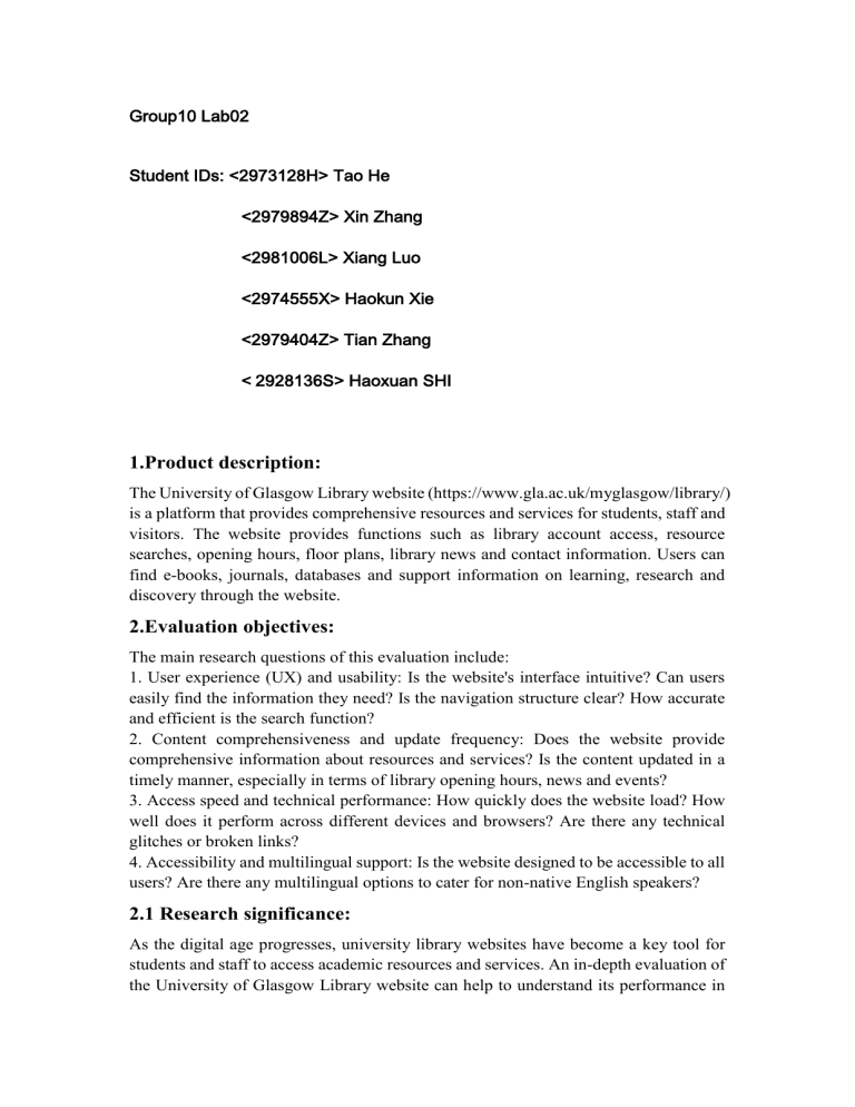 Group10 Lab02 Student IDs: <2973128H> Tao He <2979894Z> Xin Zhang <2981006L> Xiang Luo <2974555X> Haokun Xie <2979404Z> Tian Zhang < 2928136S> Haoxuan SHI 1.Product description: The University of Glasgow Library website (https://www.gla.ac.uk/myglasgow/library/) is a platform that provides comprehensive resources and services for students, staff and visitors. The website provides functions such as library account access, resource searches, opening hours, floor plans, library news and contact information. Users can find e-books, journals, databases and support information on learning, research and discovery through the website. 2.Evaluation objectives: The main research questions of this evaluation include: 1. User experience (UX) and usability: Is the website's interface intuitive? Can users easily find the information they need? Is the navigation structure clear? How accurate and efficient is the search function? 2. Content comprehensiveness and update frequency: Does the website provide comprehensive information about resources and services? Is the content updated in a timely manner, especially in terms of library opening hours, news and events? 3. Access speed and technical performance: How quickly does the website load? How well does it perform across different devices and browsers? Are there any technical glitches or broken links? 4. Accessibility and multilingual support: Is the website designed to be accessible to all users? Are there any multilingual options to cater for non-native English speakers? 2.1 Research significance: As the digital age progresses, university library websites have become a key tool for students and staff to access academic resources and services. An in-depth evaluation of the University of Glasgow Library website can help to understand its performance in terms of user experience, content quality and technical performance. This will not only provide the library with suggestions for improvement and enhance user satisfaction, but also serve as a reference for other academic institutions when designing and optimising their library websites. In addition, considering the needs of a diverse user base, it is also important to evaluate the accessibility features and multilingual support of the website to ensure that all users can equally and conveniently access and utilise library resources. 2.2 Pilot summary In the evaluation of the University of Glasgow Library's website, attention was focussed on the user experience, comprehensiveness of content, speed of access, technical performance and accessibility of the site. During the evaluation, it was found that the use of advanced research features was cumbersome and could affect the ability of users to fully utilise the site's resources. Therefore, the experimental tasks were simplified to improve efficiency and ensure a smoother user experience. In addition, the questionnaire design was adjusted to focus on the usability and functionality of the website to improve the accuracy and reliability of the survey results. Through these adjustments, the evaluation team aimed to gain a clearer understanding of user needs, thereby improving the overall experience and functional effectiveness of the website. The aim of streamlining the evaluation process and optimising the questionnaire structure is to provide more valuable feedback to help the website improve user experience and overall performance. 3 Evaluation Plan 3.1 Evaluation Overview 3.1.1 Study Background The objective of this evaluation is to assess the usability of the University of Glasgow Library website, specifically focusing on the ease of use of its search functionality and overall user experience. To gather data, we distributed a questionnaire to five students from other groups in the same course. Participants were asked to perform specific tasks on their own computers and provide feedback through the survey. This study will analyze both quantitative data (task success rate, error rate) and qualitative feedback (user satisfaction, usability experience). 3.1.2 Evaluation Method The evaluation type of this experiment is remote usability study. Participants used their own computer equipment to complete the tasks and questionnaires, without restrictions on experiment location and browser, and visited the UofG Library website. Each participant should complete the task within 30 minutes, independently during the experiment, and complete the questionnaire. The experimental designer drew the conclusion by analyzing the questionnaire data. 3.2 Variables The study examines the impact of different search methods—basic search (entering keywords in the main search bar) and advanced search (using filters such as fields, date, content type, and discipline)—on task performance. These different search methods are the independent variables of this experiment. The dependent variables include task success rate (percentage of participants completing tasks successfully), error rate (number of mistakes), and user satisfaction (measured on a 1-5 Likert scale). Additionally, website performance, specifically page loading speed, is considered an independent variable as it may affect task completion efficiency and user satisfaction. Control variables ensure consistency, such as a fixed task order, uniform task instructions, and acknowledgment of device and network variability, which, although uncontrolled, will be accounted for in the analysis due to the remote nature of the experiment. 3.3 Briefing and Debriefing In this experiment, participants are five students from other groups in the same Human Computer Interaction Design and Evaluation course, they have a similar level of understanding of usability principles. Before the experiment, participants are informed about the purpose of the study, which is “We are evaluating the usability of the UofG Library website”. They are informed that the study should take 20-30 minutes, and they can withdraw at any time. After the experime