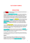 IELTS IELTS ESSAY SAMPLE EDUCATION 1. As computers are being used more and more in education, there will be soon no role for teachers in the classroom. There have been immense advances in technology in most aspects of people's lives, especially in the field of education. Nowadays, an increasing number of students rely on computers to research for information and to produce a perfect paper for school purposes. Others have decided to leave the original way of learning to get knowledge through online schools. These changes in the learning process have brought a special concern regarding the possible decrease of importance of teachers in the classroom. Some people believe the role of teachers started to fade because computers have been helping some students to progress in their studies quicker than when compared with an original classroom. For example, in the same classroom, students have different intellectual capacities, thus some would be tied to a slow advance in their studies because of others’ incapacity of understanding. In this way, pupils could progress in their acquisition of knowledge at their own pace using computers instead of learning from teachers. However, the presence of a teacher is essential for students because the human contact influences them in positive ways. Firstly, students realize that they are not dealing with a machine but with a human being who deserves attention and respect. They also learn the importance of studying in group and respect other students, which helps them to improve their social skills. Moreover, teachers are required in the learning process because they acknowledge some student's deficiencies and help them to solve their problems by repeating the same explanation, giving extra exercises or even suggesting a private tutor. Hence, students can have a bigger chance not to fail in a subject. In conclusion, the role for teachers in the learning process is still very important and it will continue to be in the future because no machine can replace the human interaction and its consequences. Sample 2 : Nobody can argue that the acquisition of knowledge is more fun and easier with computers. The mere activity of touching and exploring this device constitutes an enjoyable task for a kid. This, accompanied with the relaxing attitude and software interactivity, usually conduce to a better grasping of new knowledge. At a higher 1 educational level; the availability of digital books, simulator and other academic materials, provide the student with an ever accessible source of information, that otherwise would not be at hand. But, besides the increasing complexity and behavior of intelligent software, which is usually embedded in the academic digital material, the need of human interaction in the learning process will always be present, at least in the foreseeable future. There is the necessity for a human being to be able to determine what the specifics needs of each individual are. The expertise of a teacher in how to explain and adapt complex concepts to different individuals can hardly be mimicked by a computer, no matter how sophisticated its software is. As computers are becoming a common tool for teaching, teachers should be more aware of their role as guides in the acquisition of knowledge rather than transmitters of facts. They have to be open minded to the changes that are taking places, keep updated and serve as a problem solvers in the learning process, thus allowing students to discover the fact for themselves. To summarize, in my personal view, teachers play and will() play an important role in the classroom, especially at the primary level. No matter how complex computers become, there will be no replacement for the human interaction, but in the way haw this interaction takes place. Excellent essay! Are you a native English speaker? Well done. The only problem: too long, 365 words instead of 250-265 maximum. 2. In some countries young people are encouraged to work or travel for a year between finishing high school and starting university studies. Discuss the advantages and disadvantages for young people who decide to do this. It is quite common these days for young people in many countries to have a break from studying after graduating from high school. This trend is not restricted to rich students who have the money to travel, but is also evident among poorer students who choose to work and become economically independent for a period of time. The reasons for this trend may involve the recognition that a young adult who passes directly from school to university is rather restricted in terms of general knowledge and experience of the world. By contrast, those who have spent some time earning a living or traveling to other places have a broader view of life and better personal resources to draw on. They tend to be more independent, which is a very important factor in academic study and research, as well as giving them an advantage in terms of coping with the challenges of student life. However, there are certainly dangers in taking time off at that important age. Young adults may end up never returning to their studies or finding it difficult to readapt to an academic environment. They may think that it is better to continue in a particular job, or to do something completely different from a university course. But overall, I think this is less likely today, when academic qualifications are essential for getting a reasonable career. My view is that young people should be encouraged to broaden their horizons. That is the best way for them to get a clear perspective of what they are hoping to do with their lives 2 and why. Students with such a perspective are usually the most effective and motivated ones and taking a year off may be the best way to gain this. (291 words) 3 3. Some people believe that a college or university education should be available to all students. Others believe that higher education should be available only to good student