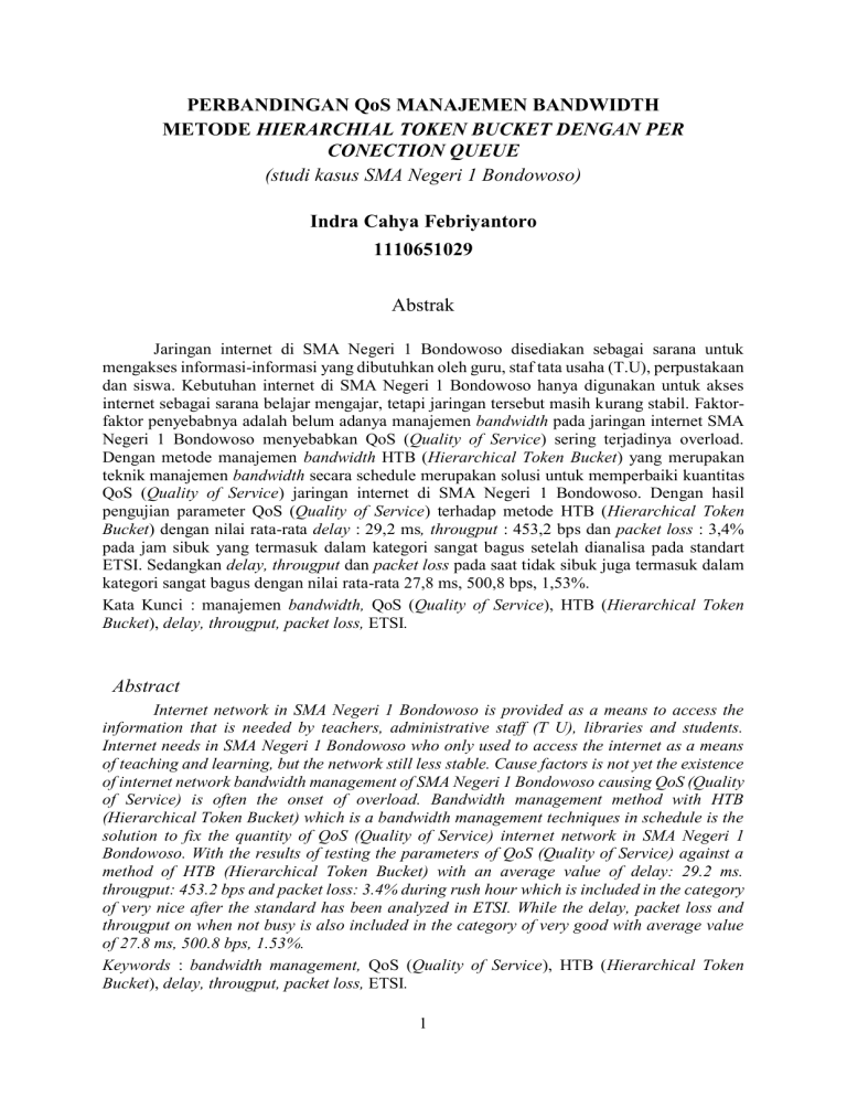 PERBANDINGAN QoS MANAJEMEN BANDWIDTH METODE HIERARCHIAL TOKEN BUCKET DENGAN PER CONECTION QUEUE (studi kasus SMA Negeri 1 Bondowoso) Indra Cahya Febriyantoro 1110651029 Abstrak Jaringan internet di SMA Negeri 1 Bondowoso disediakan sebagai sarana untuk mengakses informasi-informasi yang dibutuhkan oleh guru, staf tata usaha (T.U), perpustakaan dan siswa. Kebutuhan internet di SMA Negeri 1 Bondowoso hanya digunakan untuk akses internet sebagai sarana belajar mengajar, tetapi jaringan tersebut masih kurang stabil. Faktorfaktor penyebabnya adalah belum adanya manajemen bandwidth pada jaringan internet SMA Negeri 1 Bondowoso menyebabkan QoS (Quality of Service) sering terjadinya overload. Dengan metode manajemen bandwidth HTB (Hierarchical Token Bucket) yang merupakan teknik manajemen bandwidth secara schedule merupakan solusi untuk memperbaiki kuantitas QoS (Quality of Service) jaringan internet di SMA Negeri 1 Bondowoso. Dengan hasil pengujian parameter QoS (Quality of Service) terhadap metode HTB (Hierarchical Token Bucket) dengan nilai rata-rata delay : 29,2 ms, througput : 453,2 bps dan packet loss : 3,4% pada jam sibuk yang termasuk dalam kategori sangat bagus setelah dianalisa pada standart ETSI. Sedangkan delay, througput dan packet loss pada saat tidak sibuk juga termasuk dalam kategori sangat bagus dengan nilai rata-rata 27,8 ms, 500,8 bps, 1,53%. Kata Kunci : manajemen bandwidth, QoS (Quality of Service), HTB (Hierarchical Token Bucket), delay, througput, packet loss, ETSI. Abstract Internet network in SMA Negeri 1 Bondowoso is provided as a means to access the information that is needed by teachers, administrative staff (T U), libraries and students. Internet needs in SMA Negeri 1 Bondowoso who only used to access the internet as a means of teaching and learning, but the network still less stable. Cause factors is not yet the existence of internet network bandwidth management of SMA Negeri 1 Bondowoso causing QoS (Quality of Service) is often the onset of overload. Bandwidth management method with HTB (Hierarchical Token Bucket) which is a bandwidth management techniques in schedule is the solution to fix the quantity of QoS (Quality of Service) internet network in SMA Negeri 1 Bondowoso. With the results of testing the parameters of QoS (Quality of Service) against a method of HTB (Hierarchical Token Bucket) with an average value of delay: 29.2 ms. througput: 453.2 bps and packet loss: 3.4% during rush hour which is included in the category of very nice after the standard has been analyzed in ETSI. While the delay, packet loss and througput on when not busy is also included in the category of very good with average value of 27.8 ms, 500.8 bps, 1.53%. Keywords : bandwidth management, QoS (Quality of Service), HTB (Hierarchical Token Bucket), delay, througput, packet loss, ETSI. 1 Pendahuluan Tinjauan Pustaka Saat ini banyak perangkat keras baik laptop maupun gadget yang dilengkapi oleh teknologi wireless sebagai penghubung user terhadap dunia internet. Akibatnya penggunaan internet dalam satu jaringan komputer semakin tidak terkontrol dan membutuhkan suatu manajemen bandwidth dalam mengatasi masalah tersebut. SMA Negeri 1 Bondowoso memiliki masalah dalam manajemen bandwidth supaya setiap user tidak mengalami ketidak nyamanan dalam mengakses internet. Internet pada SMA Negeri 1 Bondowoso digunakan sebagai fasilitas dalam belajar dan mengajar baik digunakan untuk mencari referensi pelajaran bagi siswa maupun sebagai media upload atau download data dari Dinas yang di lakukan oleh staf tata usaha sekolah. Profil SMA Negeri 1 Bondowoso SMA Negeri (SMAN) 1 Bondowoso, merupakan salah satu Sekolah Menengah Atas Negeri yang ada di Provinsi Jawa Timur, Indonesia. Sama dengan SMA pada umumnya di Indonesia masa pendidikan sekolah di SMAN 1 Bondowoso ditempuh dalam waktu tiga tahun pelajaran, mulai dari Kelas X sampai Kelas XII. SMAN 1 Bondowoso merupakan satu lembaga pendidikan di bawah naungan Dinas Pendidikan yang beralamatkan di Jln. CURAHDAMI 1294, RT/RW : 35/7 Desa Badean, Kec. Bondowoso, Jawa Timur dan berada pada garis lintang/bujur : 7.9145/113.8083. Dengan disediakannya fasilitas internet di sekolah, berarti hampir seluruh warga sekolah menggunakan fasilitas tersebut untuk menjelajah dunia maya secara bebas tanpa dibatasi. Karena semakin banyaknya user yang mengakses jaringan internet menyebabkan pembagian bandwidth secara tidak merata dan hanya terperioritas pada satu user yang mendominasi saja. Hal itu terkadang menyebabkan kerugian pada user lainnya Gambar 1 SMAN 1 Bondowoso via google map Sekolah tersebut memiliki 35 ruang yang sebagai prasarana belajar dan mengajar dengan jumlah siswa sebanyak 557 siswa, yang terdiri dari 300 siswa laki-laki dan 257 siswa perempuan serta mempunyai 47 tenaga pendidik yang kompeten pada bidangnya dan 10 tenaga administrasi sekolah. Gambar 2 Denah SMAN 1 Bondowoso 2 Queue, baik Simple Queue maupun Queue Tree. PCQ (Per Connection Queuing) melakukan manajemen bandwidth secara massive kepada semua client secara besarbesaran. Dengan menggunakan PCQ ini, walaupun jumlah client tidak tentu dan sangat banyak, kita hanya perlu membuat satu atau dua konfigurasi Queue. PCQ Classifier berfungsi mengklasifikasikan arah koneksi, Misalnya jika Classifier yang digunakan adalah src-address pada Local interface, maka aliran PCQ akan menjadi koneksi upload. Begitu juga dengan dst-address akan menjadi PCQ download. PCQ rate berfungsi untuk membatasi bandwidth maksimum yang bisa didapatkan. Dengan memasukkan angka pada rate ini (default: 0) maka maksimal download yang akan didapatkan per IP akan dibatasi mis. 128k (kbps). Manajemen Bandwidth Penggunaan Internet bersama pastinya mempengaruhi bandwidth dan kecepatan transfer data antar komputer, oleh karena itu dibutuhkan sebuah manajemen bandwidth. Server melakukan pembagian bandwidth secara merata kepada para pelanggan agar tidak terjadi penguasaan bandwidth. Setiap orang memiliki keperluan masingmasing. Ada yang men