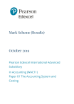 Mark Scheme (Results) October 2019 Pearson Edexcel International Advanced Subsidiary In Accounting (WAC11) Paper 01 The Accounting System and Costing Edexcel and BTEC Qualifications Edexcel and BTEC qualifications are awarded by Pearson, the UK’s largest awarding body. We provide a wide range of qualifications including academic, vocational, occupational and specific programmes for employers. For further information visit our qualifications websites at www.edexcel.com or www.btec.co.uk. Alternatively, you can get in touch with us using the details on our contact us page at www.edexcel.com/contactus. Pearson: helping people progress, everywhere Pearson aspires to be the world’s leading learning company. Our aim is to help everyone progress in their lives through education. We believe in every kind of learning, for all kinds of people, wherever they are in the world. We’ve been involved in education for over 150 years, and by working across 70 countries, in 100 languages, we have built an international reputation for our commitment to high standards and raising achievement through innovation in education. Find out more about how we can help you and your students at: www.pearson.com/uk October 2019 Publications Code WAC11_01_MS_1910 All the material in this publication is copyright © Pearson Education Ltd 2019 General Marking Guidance • All candidates must receive the same treatment. Examiners must mark the first candidate in exactly the same way as they mark the last. • Mark schemes should be applied positively. Candidates must be rewarded for what they have shown they can do rather than penalised for omissions. • Examiners should mark according to the mark scheme not according to their perception of where the grade boundaries may lie. • There is no ceiling on achievement. All marks on the mark scheme should be used appropriately. • All the marks on the mark scheme are designed to be awarded. Examiners should always award full marks if deserved, i.e. if the answer matches the mark scheme. Examiners should also be prepared to award zero marks if the candidate’s response is not worthy of credit according to the mark scheme. • Where some judgement is required, mark schemes will provide the principles by which marks will be awarded and exemplification may be limited. • When examiners are in doubt regarding the application of the mark scheme to a candidate’s response, the team leader must be consulted. • Crossed out work should be marked UNLESS the candidate has replaced it with an alternative response. Section A Question Answer Mark Number 1 (a) AO2(6): A02: Six marks for calculating adjusted balances Alvor £ Assets Goodwill Non-current assets Inventory Trade receivables Other receivables Bank Liabilities 5% bank loan (repayable 2022) Trade payables Other payables Bank overdraft Capital Bernie £ 18 000 9 000 (1) AO2 5 500 (1)AO2 5 700 (1) AO2 300 4 500 43 000 21 000 9 500 (1) AO2 900 40 000 - 12 000 3 800 1 200 5 000 5 400 500 6 100 24 000 38 000 16 000 (1of) AO2 Both 8 600 Alvor: Non -current assets 14000- 5000 = 9000 Inventory 7000- 1500 = 5500 Trade receivables 6000- 300 = 5700 Bernie: Trade receivables 11600 – 1600 – 500 = 9500 (1) AO2 (6) Question Answer Mark Number 1 (b) AO1:(1)AO2(3):AO3(2) AO1: One mark for totalling sub section A02: Three marks for calculating the bank overdraft AO3: Two marks for adjusting capital for goodwill not retained Alvor and Bernie Statement of Financial Position at 1 October 2018 £ £ Assets Non-current assets (carrying value) 30 000 (1) AO1 No alien Current assets Inventory 14 100 Trade receivables 15 200 Other receivables 1 200 30 500 (1of) AO2 No alien Total assets 60 500 Capital and liabilities Capital Alvor 38 000 – 12 000 26 000 (1of) AO3 Bernie 16 000 – 6 000 10 000 (1of) AO3 36 000 Non-current liabilities 5% bank loan (repayable 2022) 12 000 Current liabilities Trade payables 9 200 Other payables 1 700 Bank overdraft 4 500 – 6 100 1 600 (1) AO2 12 500 (1of) AO2 Total capital and liabilities 60 500 (6) Question Answer Mark Number 1 (c) AO1:(5)AO2(11):AO3(3) AO1: Five marks for transferring balances to the income statement A02: Eleven marks for calculating or adjusting balances for the income statement AO3: Three marks for balances requiring two levels of adjustment Statement of Profit or Loss and Comprehensive Income, including an appropriation section, for the year ended 30 September 2019 £ Revenue £ 300 000 Less Cost of sales: Opening inventory 14 100 Purchases 148 000 Carriage inwards 7 900 170 000 (1of) AO2 Closing inventory (17 600) (152 400) (1of) +w AO2 Gross profit 147 600 Plus Other income: 12 650 (1) AO2 Commission receivable 11 750 + 900 160 250 Less Electricity and water 5 650 - 800 4 850 (1) AO2 Telephone and communications 6 150 (1) AO1 Supervision salaries 24 000 (1) AO1 Rent 16 700 – 6 700 10 000 (1) AO2 Wages 38 300 + 2 300 40 600 (1) AO2 Bank loan interest 600 (1) AO2 General expenses 7 400 (1) AO1 Insurance 1 800 (1) AO1 Computer repairs 2 900 (1) AO1 Depreciation: Motor vehicles 3 200 (1) AO2 Computers 1 500 (1) AO2 Fixtures and fittings 800 (1) AO2 Increase in allowance for doubtful debts 2 050 -800 1 250 (1) AO3 (105 050) Profit for the year 55 200 Add Interest on drawings: Alvor 12 000 - 10 000 x 10% 200 Bernie 800 14 000 - 6 000 x 10% 1 000 (1) AO3 Less Salaries: Alvor 10 000 Bernie 6 000 (16 000) (1) AO2 40 200 Share of profit: Alvor 26 800 (1of) AO3 If correct split no aliens Bernie 13 400 _____ 40 200 (19) Question Answer Mark Number 1 (d) AO1:(6) AO1: Six marks for identifying and explaining the characteristics Supervision salaries Semi-fixed (1) AO1 Additional supervisors would be required as production or the service expands. This would lead to a stepped increase in costs. (1) AO1 Rent Fixed (1) AO1 The rent would be constant for the accounting period irrespective of the activity undertaken within the premises. (1) AO1 Telephone and communications Semi-variable (1) AO1 There wou