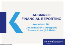 Document classification: Internal ACCM4300 FINANCIAL REPORTING Workshop 10 : Consolidation : Intragroup Transactions (AASB10) WARNING This material has been reproduced and communicated to you by or on behalf of Kaplan Business School pursuant to Section 113P of the Copyright Act 1968 (Act). This material in this communication may be subject to copyright under the Act. Any further reproduction or communication of this material by you may be the subject of copyright protection under the Act. Do not remove this notice. Unless otherwise specifically referenced, material in this slide deck has been adopted from Financial reporting in Australia / Janice Loftus, Ken Leo, Sorin Daniliuc, Noel Boys, Belinda Luke, Hong Ang, Karyn Byrnes. Second edition. John Wiley & Sons Australia, Ltd; Leo, K, Knapp, J, McGowan, S, Sweeting, J & Meng, L, Company Accounting, 12th edition, John Wiley & Sons Australia, Ltd, Queensland. . Prepared by © Kaplan Business School Document classification: Internal Learning objectives After this workshop you should be able to: 1. Justify the need for adjusting for intragroup transactions 2. Determine worksheet entries for intragroup transactions involving profits and losses in inventories 3. Determine worksheet entries for intragroup transactions involving profits and losses on the transfer of property, plant and equipment 4. Construct the worksheet entries for intragroup services 5. Construct the worksheet entries for intragroup dividends Document classification: Internal Learning objectives After this workshop you should be able to: 1. Justify the need for adjusting for intragroup transactions 2. Determine worksheet entries for intragroup transactions involving profits and losses in inventories 3. Determine worksheet entries for intragroup transactions involving profits and losses on the transfer of property, plant and equipment 4. Construct the worksheet entries for intragroup services 5. Construct the worksheet entries for intragroup dividends Document classification: Internal Introduction • In this workshop, the group under discussion is restricted to one where: ̶ There are only two entities within the group (i.e. one parent and one subsidiary) ̶ The parent owns all the shares of the subsidiary. (Loftus,2020) Document classification: Internal Introduction • Adjustments involving equity at the acquisition date, namely the business combination valuation entries (if any) and the pre-acquisition entry, eliminating the investment account in the parent’s financial statements against the pre-acquisition equity of the subsidiary. • Elimination of intragroup balances and the effects of transactions whereby profits or losses are made by different members of the group through trading with each other. Document classification: Internal Rationale for adjusting for intragroup transactions • Whenever related entities trade with each other, or borrow and lend money to each other, the separate legal entities disclose the effects of these transactions in the assets and liabilities recorded and the profits and losses reported. • Hence, the effects of transactions within the group must be adjusted for in the preparation of the consolidated financial statements. Document classification: Internal Rationale for adjusting for intragroup transactions • The requirement for the full adjustment for the effects of intragroup transactions is stated in paragraph B86(c) of AASB 10/IFRS 10 Consolidated Financial Statements: • Eliminate in full intragroup assets and liabilities, equity, income, expenses and cash flows relating to transactions between entities of the group. • Intragroup losses may indicate an impairment that requires recognition in the consolidated financial statements. • AASB 112[IAS 12] Income Taxes applies to temporary differences that arise from the elimination of profits and losses resulting from intragroup transactions. Document classification: Internal Workshop Activity 1 Jessica Ltd sold inventory during the current period to its wholly owned subsidiary, Amelie Ltd, for $15 000. These items previously cost Jessica Ltd $12 000. Amelie Ltd subsequently sold half the items to Ningbo Ltd for $8000. The tax rate is 30%. The group accountant for Jessica Ltd, Li Chen, maintains that the appropriate consolidation adjustment entries are as follows: Required Discuss whether the entries suggested by Li Chen are correct, explaining on a line-by-line basis the correct adjustment entries. Document classification: Internal Learning objectives After this workshop you should be able to: 1. Justify the need for adjusting for intragroup transactions 2. Determine worksheet entries for intragroup transactions involving profits and losses in inventories 3. Determine worksheet entries for intragroup transactions involving profits and losses on the transfer of property, plant and equipment 4. Construct the worksheet entries for intragroup services 5. Construct the worksheet entries for intragroup dividends Document classification: Internal Transfers of inventories • Paragraph B86(c) of AASB 10/IFRS 10 states that the profits and losses resulting from intragroup transactions that require consolidation adjustments to be made are those ‘recognised in assets’. • The test for realisation is the involvement of an external party in relation to the item involved in the intragroup transaction. • If the parent then sells the inventories to a party external to the group, the intragroup profit becomes realised to the group. Document classification: Internal Transfers of inventories – Example 1 On 1 January 2022, Jessica acquired $10,000 worth of inventory for cash from Amelia Ltd. The inventories had previously cost Amelia Ltd $8,000. 30 June 2022, all the inventories sold by Amelie Ltd to Jessica Ltd are still on hand. The adjustment entries in the consolidation worksheet at 30 June 2022 are: Sales Revenue Cost of Sales Inventories Dr Cr Cr DTA Dr 600 Income tax expense Document 