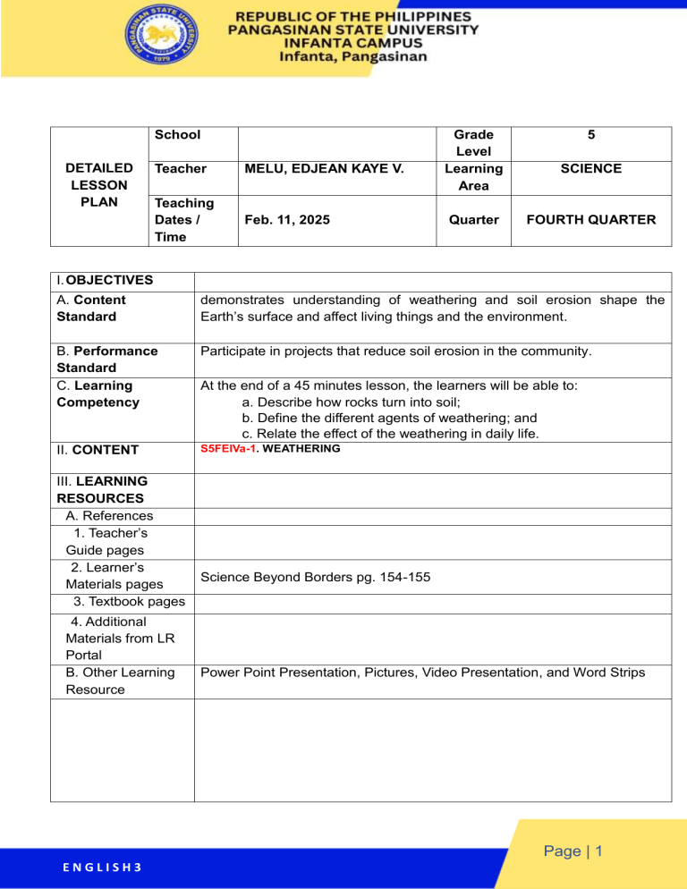 School DETAILED LESSON PLAN Teacher MELU, EDJEAN KAYE V. Teaching Dates / Time Feb. 11, 2025 Grade Level Learning Area Quarter 5 SCIENCE FOURTH QUARTER I. OBJECTIVES A. Content Standard demonstrates understanding of weathering and soil erosion shape the Earth’s surface and affect living things and the environment. B. Performance Standard C. Learning Competency Participate in projects that reduce soil erosion in the community. II. CONTENT S5FEIVa-1. WEATHERING III. LEARNING RESOURCES A. References 1. Teacher’s Guide pages 2. Learner’s Materials pages 3. Textbook pages 4. Additional Materials from LR Portal B. Other Learning Resource At the end of a 45 minutes lesson, the learners will be able to: a. Describe how rocks turn into soil; b. Define the different agents of weathering; and c. Relate the effect of the weathering in daily life. Science Beyond Borders pg. 154-155 Power Point Presentation, Pictures, Video Presentation, and Word Strips Page | 1 ENGLISH3 Teacher’s Activity IV. PROCEDURE A. Reviewing previous lesson or presenting the new lesson Good day children! Student’s Activity Good day ma’am! How are you today my dear learners? We are good ma’am! Wow very good, nice to hear that! Did you have your breakfast/lunch? Very good! Yes, ma’am. I hope that everyone is safe and okay today. Now are ready to listen kids? Before we start our lesson for today let us have first a prayer. Yes, ma’am. Okay MMJ come in front and lead the prayer. Let’s stand up, bow our heads and feel the presence of God. Amen, Thank you MMJ. Dear God, we give thanks to you, our Lord and Savior Jesus Christ, for another beautiful day with our loved ones. As we conduct our day, you are forever in our hearts and thoughts. We ask for your love, guidance, and protection in everything we do. Please watch over those who mean the most to us. We ask this through Christ our Lord, Amen. Okay class you may now take your sit so that we can start our lesson proper. Page | 2 ENGLISH3 Before we proceed, I want you to tell the name of your classmate that are not here None, ma’am. today. So, class who is absent? None? Wow very good, I am happy that we are all here and ready to take our lesson for today! Before we proceed to our new lesson for today, I want to ask you what is our last discussion all about? We talk about Weathering ma’am. Very good! Last time we talk about, what is weathering. What is weathering again my dear learners? It is a process wherein rocks turn into soil. So what are the three types of WEATHERING? Yes Jake? The mechanical, chemical and biological ma’am. Yes, very good! Excellent! I am so happy that you still remember our last discussion. Very good, thank you so much my dear learner’s. B. Establishing a purpose for the lesson Yes, ma’am Now before we move forward to our discussion, let’s have first an activity. Are you familiar with 4 PICS 1 WORD? Page | 3 ENGLISH3 I will group you into four (4) and paste the correct answer on the board based on the picture in the board. GROUP 1 PLANTS GROUP 2 TEMPERATURE GROUP 3 Page | 4 ENGLISH3 WATER GROUP 4 C. Presenting After the activity you did, what do you examples/Instances think is our topic for today? of the new lesson Jhena? You are right, it is similar. WIND About natural elements that may cause weathering ma’am. Another? Trisha Mae? Good job!. It is all about water, wind, temperature, and plants ma’am. Page | 5 ENGLISH3 D. Discussing new Next, we have the different agents of concepts and weathering. practicing new skills #1 Who among you here have any ideas about the different agents of weathering or None ma’am, we don’t have any idea. you can give some examples. What are the natural elements again that Water, Wind, Temperature, are pasted on the board? and Plants ma’am. Yes, very good. Can you please give 1, 2, 3 (clap) yourself a very good clap. 1,2,3 (foot stamp) Very Good!! Those are the WEATHERING. AGENTS OF Now, let’s define those four (4). 1. WATER can break rocks in different ways for example the strong waves Yes ma’am. hitting the rocks can make it break also water can seep in to the cracks of the rocks and when it’s get colder, these water can expand and turn into ice which can trigger rocks to break. Understood? 2. WIND causes many beautiful formations like the Mahayaw Arch in Sabtang Isalnd, Batanes, Philippines. As the wind blows, it carries sand or small rock particles that scratch the rocks’ surface. This can bring about mechanical weathering which can also result to different rock formations. Did understand? Page | 6 ENGLISH3 3. TEMPERATURE, when rocks are exposed to varying temperature, it expands. If rocks are exposed to a low temperature, it contracts. The repeated expansion and contraction of rocks due to changes in temperature results in weathering. 4. PLANTS, some plants, like lichens, ferns, and mosses, can also trigger weathering. How? It can grow on rocks and cause it to break into pieces. Eventually, metabolic or life process of these plants will cause the gradual breakage of rocks into smaller pieces. E. Discussing new concepts and practicing new skills #2 - TEMPERATURE, when rocks are exposed to varying temperature, it expands. If rocks are exposed to a low temperature, it contracts. The repeated expansion and contraction of rocks due to changes in temperature results in weathering. - PLANTS, some plants, like lichens, ferns, and mosses, can also trigger weathering. How? It can grow on rocks and cause it to break into pieces. Eventually, metabolic or life process of these plants will cause the gradual breakage of rocks into smaller pieces. Instruction: Describe the agents of weathering. Each type will be provided by one example that will be written in a table. AGENTS OF WEATHERING AGENTS OF DESCRIPTION WEATHERING DESCRIPTION EXAMPLE Page | 7 ENGLISH3 ( ALL THE POSSIBLE ANSWER ARE ACCPTED) Page | 8 ENGLISH3 F. Developing mastery (leads to Formative Assessment 3) Define what is weatherin
