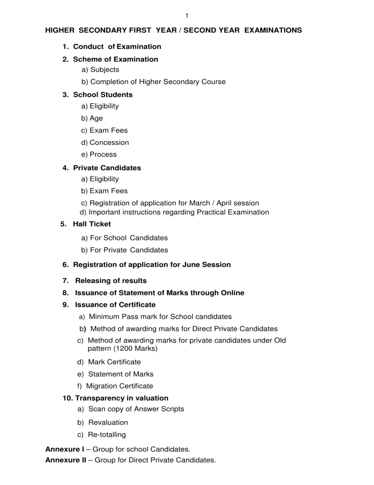 1 HIGHER SECONDARY FIRST YEAR / SECOND YEAR EXAMINATIONS 1. Conduct of Examination 2. Scheme of Examination a) Subjects b) Completion of Higher Secondary Course 3. School Students a) Eligibility b) Age c) Exam Fees d) Concession e) Process 4. Private Candidates a) Eligibility b) Exam Fees c) Registration of application for March / April session d) Important instructions regarding Practical Examination 5. Hall Ticket a) For School Candidates b) For Private Candidates 6. Registration of application for June Session 7. Releasing of results 8. Issuance of Statement of Marks through Online 9. Issuance of Certificate a) Minimum Pass mark for School candidates b) Method of awarding marks for Direct Private Candidates c) Method of awarding marks for private candidates under Old pattern (1200 Marks) d) Mark Certificate e) Statement of Marks f) Migration Certificate 10. Transparency in valuation a) Scan copy of Answer Scripts b) Revaluation c) Re-totalling Annexure I – Group for school Candidates. Annexure II – Group for Direct Private Candidates. 2 1. Conduct of Examination Higher Secondary Examination is conducted twice in a year. 1. Higher Secondary Examinations, March / April 2. Higher Secondary Supplementary Examinations, June / July 2. Scheme of Examination a) Subjects Examination will be conducted for the following subjects on the dates fixed by the Director of Government Examinations. The syllabus and text books are prescribed by the State Council of Educational Research and Training for Higher Secondary First Year / Second Year (State Board). Examination Duration Subjects Part I (Language) 3 hours Permitted languages: Tamil, Hindi, Kannada, Telugu, Malayalam, Urdu, Sanskrit, Arabic, French and German Part II – English 3 hours English Part III – 4 subjects 3 hours Any four subjects from the group of General Stream or Vocational Stream. List of Groups i. For School students – Annexure I ii. For Direct Private candidates Annexure II. • Permitted medium for Part III subjects are Tamil, Telugu, Malayalam, Kannada, Urdu & English. • Question papers will be provided only in Tamil and English. However for the Ten subjects such as Physics, Chemistry, Biology, Botany, Zoology, Mathematics, History, Commerce, Economics and Accountancy question papers will also be provided in Telugu, Kannada, Malayalam and Urdu medium. 3 b) Completion of Higher Secondary course: • Those students who have not passed in any subject in XI standard are still eligible to continue for the Higher Secondary Second year course. • For Higher Education, the candidates should have passed in all the subjects of XI and XII Standard Examinations. 3. School students a) Eligibility A Pass in SSLC or equivalent examination. They should have studied in a recognized School. b) Age Candidates should have completed the age of 15 on or before the 1st day of the month in which the Higher Secondary First year Examination is to be held. c) Exam Fees Exam fees a) For groups involving subjects with practical Amount (Rs.) 200/- b) For groups involving subjects without practical 150/- c) Mark Certificate 20/- d) Service Charges 5/- d) Concessions Category Tamil medium candidates studying all type of schools. Concession in All Tamil medium candidates are exempted from paying the exam fee Other than Tamil medium - SC / SCA / ST / SC converts (SS) / MBC / DNC candidates studying in Govt. and Govt. aided schools Exam fee exemption Other than Tamil medium - OBC / BC / BCM candidates studying in Govt. and Govt. aided schools (whose parental income does not exceed Rs.2,00,000/-) Exam fee exemption Blind candidates (i) Fee exemption (ii) Appointment of Scribe (iii) Extra one hour time for writing the exams 4 Physically challenged candidates, Paralytic attacked candidates, locomotors disability due to accident (i) Appointment of Scribe Mentally Retarded candidates (i) Appointment of Scribe. (ii) Extra one hour time for writing the exams (ii) Extra one hour time for writing the exams (iii) Exemption for any one of the languages (Part I or Part II) Deaf & Dumb candidates (i) Fee exemption (ii) Extra one hour time for writing the exams. (iv) Exemption for any one of the languages (Part I or Part II) Dyslexia candidates / Neurotics (i) Appointment of Scribe (ii) Extra one hour time for writing the exams (iii) Exemption for any one of the language (Part I or Part II) (iv) Overlooking of spelling errors. (v) Permitted to use calculator G.Os of concession to the Differently abled candidates are published in this website www.dge.tn.gov.in under Government Orders. e) Process The heads of the school should upload the Nominal Roll i.e. the particulars of the pupils who are appearing for the public examination from their schools in the prescribed format in the website of this Directorate on the dates announced by the Directorate of Government Examinations. 4. Private Candidate : a) Eligibility Higher Secondary Examination for Private candidates will be held during March / April and Supplementary Examination is being conducted during June / July. Notification will be issued by this Department in dailies. Private Candidates applying for Higher Secondary Examination are classified under two categories as detailed below : 5 1.HIGHER SECONDARY FIRST YEAR EXAMINATION Regular Private candidates (H) Failed Candidates who have once Registered for the earlier session of Higher Secondary First year Examination may apply for the failed or absented subjects in the same group Eligibility criteria: Direct Private candidates (HP) (Candidates applying for Higher Secondary First year Examination for the first time) 1. For candidates who have appeared for the SSLC Public examination and have secured 35% of marks in each of the subjects prescribed for the SSLC Public examination (X) or who have passed any other examination which is equivalent to SSLC Examination or Other State Boards are eligible to apply. 2. Candidates who have passed their SSLC Examination in other s