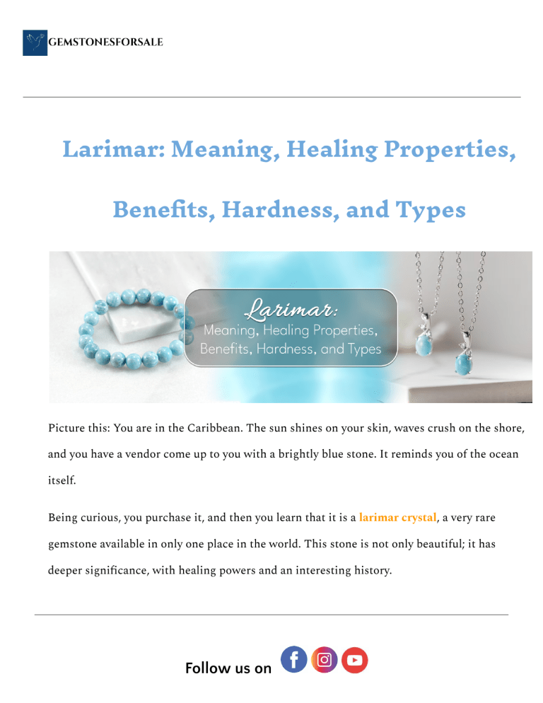 Larimar: Meaning, Healing Properties, Benefits, Hardness, and Types Picture this: You are in the Caribbean. The sun shines on your skin, waves crush on the shore, and you have a vendor come up to you with a brightly blue stone. It reminds you of the ocean itself. Being curious, you purchase it, and then you learn that it is a larimar crystal, a very rare gemstone available in only one place in the world. This stone is not only beautiful; it has deeper significance, with healing powers and an interesting history. Follow us on Ever felt yourself being attracted by the beauty of a gemstone and wanted to know its story? Well, dive into the page to learn the meaning of the larimar, its healing properties, types, and how to care for the precious jewel. What is the Larimar Gemstone? The rare blue variety of pectolite, a mineral formed by volcanic activity, is known as Larimar or the "Stone of Atlantis." Its striking blue color, often swirled with white patterns, mirrors the Caribbean Sea. Follow us on ● Colour Spectrum: Deep turquoise to light sky blue. ● Hardness: It is softer than many gemstones, with a Mohs hardness of 4.5–5. ● Found In: The Dominican Republic. In addition to its beauty, the larimar qualities give it a calming energy that we will discuss in more detail. Larimar - The Gemstone of Communication Larimar is often referred to as the "gemstone of communication." It finds its vibrational relationship in the throat chakra, with a purpose of clarifying, confidencing, and librely speechifying. Follow us on Let's speak our minds or try to solve problems by finding solutions or well deep inside ourselves with larimar. Another is believed to carry the peaceful energy of water and air. It helps maintain calmness in humans during turbulent moments related to emotions. These stones also look beautiful when you combine them with other stones like moonstone crystal, sapphires, moldavite gemstone and pearls. Historic Importance In the Dominican Republic, the natives considered larimar as a treasure of the sea gods. They would perform ceremonies in connection with the spiritual world to gain energy from nature. Follow us on Presently, it has become an added mystery by associating it with the lost city of Atlantis. Many say it is carrying the energies of that lost civilization. Where is Larimar Mined? It is mined only in the Dominican Republic, in the small mountain region called Los Chupaderos. Mining involves much labor to extract the stone and is, therefore, careful not to harm its quality. Due to such exclusivity, larimar crystals are rare, making them coveted by collectors as well as those with spiritual purposes. Follow us on Healing Properties of Uses of Larimar Larimar is known to possess complete holistic healing properties, which will have benefits on spiritual, emotional, mental, and physical levels. Follow us on 1. Spiritual Healing ● It connects with higher consciousness and divine energies. ● Activates the throat chakra, thus enhancing communication. ● It brings serenity and peace like the soothing ocean waves. 2. Healing on an Emotional Level ● relieves emotional blockages, guilt, and fears. ● promotes acceptance and love for oneself. ● helps people feel calm in stressful situations. 3. Healing of the Mind ● increases originality and creative thinking. ● encourages rational decision-making and thought processes. ● lessens overanalyzing and anxiety. 4. Physical Recovery ● claimed to relieve chest, neck, and throat problems. Follow us on ● promotes the balance of hormones. ● reduces health issues brought on by stress. Must Read: Moonstone in Mythology and Folklore: Tales from Around the World Varieties of Larimar Larimar gemstones are unique and distinguished by the color patterns they have. There is something about every variety that gives them a different type of charm to collectors, jewelry lovers, and spiritual enthusiasts. Below are the main varieties of larimar crystal: Follow us on 1. Larimar Sky Blue This is the most popular type, and it's a bright, light blue that looks like a clear sky. Significance: Often used for jewellery and spiritual activities, it symbolises serenity and clarity. Rarity: Frequently found but highly prized for its visual appeal. 2. Larimar Volcano Dark inclusions, streaks, or patterns that resemble volcanic eruptions are present. Significance: A grounding energy and raw power symbol that links wearers to the natural forces of the Earth. Rarity: Seldom found, valued for its distinctive look. 3. Larimar Ocean Description: Ocean-wave-like swirling patterns of blue and white. Follow us on Significance: Perfect for people looking for equilibrium, it reflects the calming and harmonious energy of the sea. Rarity: Visually captivating but moderately accessible. 4. Deep Blue Larimar Description: Has little white streaking and a deep, vibrant blue hue. Significance: Stands for concentration, depth, and a link to a higher state of awareness. Rarity: One of the priciest types, it is extremely rare and highly valued. 5. Greenish-blue The Larimar Description: A combination of blue and green tones, occasionally with faint white highlights. Meaning: Connects with the throat and heart chakras, representing rebirth, growth, and equilibrium. Rarity: Infrequent and uncommon in jewellery. Follow us on Every type of larimar crystal has a special combination of aesthetic appeal and spiritual properties. Larimar is a gemstone that genuinely enchants the senses and the soul, regardless of whether you are drawn to the serene Sky Blue, the unadulterated beauty of Volcanic patterns, or the uniqueness of Deep Blue. Don't Miss to Explore: A Simple Guide To Moldavite Gemstones And Chakras How to Maintain Jewellery Made of Larimar Due to its relative softness, larimar needs extra attention to keep looking beautiful: Follow us on ● Prevent Scratches: To avoid damage, store separately. ● Avoid Chemicals: Take off before swimming in chlorinated water