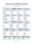 Italian Verb Conjugation Blueprint A comprehensive reference guide to conjugate regular verbs in Italian BY ITALIAN MATTERS VERBS IN -ARE INDICATIVO (INDICATIVE) SIMPLE TENSES COMPOUND TENSES Presente (Present: I speak / I do speak / I am speaking) parl -o parl -i parl -a parl -iamo parl -ate parl -ano Passato prossimo (Present perfect1: I spoke / I have spoken2) 3 ho parlato hai parlato ha parlato abbiamo parlato avete parlato hanno parlato Imperfetto (Imperfect: I spoke / I used to speak / I was speaking) parl -avo parl -avi parl -ava parl -avamo parl -avate parl -avano Trapassato prossimo (Past perfect: I had spoken) avevo parlato avevi parlato aveva parlato avevamo parlato avevate parlato avevano parlato Passato remoto (Past absolute: I spoke) Futuro semplice (Simple future: I will speak) parl -ai parl -asti parl -ò parl -ammo parl -aste parl -arono Trapassato remoto (Past anterior: I had spoken) ebbi parlato avesti parlato ebbe parlato avemmo parlato aveste parlato ebbero parlato parl -erò parl -erai parl -erà parl -eremo parl -erete parl -eranno Futuro anteriore (Future perfect: I will have spoken) avrò parlato avrai parlato avrà parlato avremo parlato avrete parlato avranno parlato CONGIUNTIVO (SUBJUNCTIVE) Presente (Present: that I speak) parl -i parl -i parl -i parl -iamo parl -iate parl -ino Passato (Past: that I have spoken) abbia parlato abbia parlato abbia parlato abbiamo parlato abbiate parlato abbiano parlato Imperfetto (Imperfect: that I spoke) parl -assi parl -assi parl -asse parl -assimo parl -aste parl -assero CONDIZIONALE (CONDITIONAL) Presente (Present: I could speak / I would speak) parl -erei parl -eresti parl -erebbe parl -eremmo parl -ereste parl -erebbero Passato (Past: I could have spoken / I would have spoken) avrei parlato avresti parlato avrebbe parlato avremmo parlato avreste parlato avrebbero parlato INFINITO (INFINITIVE) Presente (Present: to speak) parl -are Passato (Past: to have spoken) avere parlato IMPERATIVO (IMPERATIVE) Affermativo (Affirmative: speak / let’s speak) -parl -a parl -i parl -iamo parl -ate parl -ino GERUNDIO (GERUND) Presente (Present: speaking) parl -ando Trapassato (Past perfect: that I had spoken) avessi parlato avessi parlato avesse parlato avessimo parlato aveste parlato avessero parlato Passato (Past: having spoken) avendo parlato © ITALIAN MATTERS LLC. ALL RIGHTS RESERVED. Negativo (Negative: don’t speak / let’s not speak) -non parl -are non parl -i non parl -iamo non parl -ate non parl -ino PARTICIPIO (PARTICIPLE) Presente (Present: speaking) parl -ante Passato (Past: spoken) parl -ato VERBS IN -ERE INDICATIVO (INDICATIVE) SIMPLE TENSES COMPOUND TENSES Presente (Present: I sell / I do sell / I am selling) vend -o vend -i vend -e vend -iamo vend -ete vend -ono Passato prossimo (Present perfect: I sold / I have sold) ho venduto hai venduto ha venduto abbiamo venduto avete venduto hanno venduto Imperfetto (Imperfect: I sold / I used to sell / I was selling) vend -evo vend -evi vend -eva vend -evamo vend -evate vend -evano Trapassato prossimo (Past perfect: I had sold) Passato remoto (Past absolute: I sold) Futuro semplice (Simple future: I will sell) vend -ei / -etti vend -esti vend -é / -ette vend -emmo vend -este vend -erono / -ettero Trapassato remoto (Past anterior: I had sold) avevo venduto avevi venduto aveva venduto avevamo venduto avevate venduto avevano venduto ebbi venduto avesti venduto ebbe venduto avemmo venduto aveste venduto ebbero venduto vend -erò vend -erai vend -erà vend -eremo vend -erete vend -eranno Futuro anteriore (Future perfect: I will have sold) avrò venduto avrai venduto avrà venduto avremo venduto avrete venduto avranno venduto CONGIUNTIVO (SUBJUNCTIVE) Presente (Present: that I sell) vend -a vend -a vend -a vend -iamo vend -iate vend -ano Passato (Past: that I have sold) abbia venduto abbia venduto abbia venduto abbiamo venduto abbiate venduto abbiano venduto CONDIZIONALE (CONDITIONAL) Presente (Present: I could sell / I would sell) vend -erei vend -eresti vend -erebbe vend -eremmo vend -ereste vend -erebbero Passato (Past: I could have sold / I would have sold) avrei venduto avresti venduto avrebbe venduto avremmo venduto avreste venduto avrebbero venduto INFINITO (INFINITIVE) Presente (Present: to sell) vend -ere Passato (Past: to have sold) avere venduto Imperfetto (Imperfect: that I sold) vend -essi vend -essi vend -esse vend -essimo vend -este vend -essero Trapassato (Past perfect: that I had sold) avessi venduto avessi venduto avesse venduto avessimo venduto aveste venduto avessero venduto IMPERATIVO (IMPERATIVE) Affermativo (Affirmative: sell / let’s sell) -vend -i vend -a vend -iamo vend -ete vend -ano GERUNDIO (GERUND) Negativo (Negative: don’t sell / let’s not sell) -non vend -ere non vend -a non vend -iamo non vend -ete non vend -ano PARTICIPIO (PARTICIPLE) Presente (Present: selling) Passato (Past: having sold) Presente (Present: selling) vend -endo avendo venduto vend -ente © ITALIAN MATTERS LLC. ALL RIGHTS RESERVED. Passato (Past: sold) vend -uto VERBS IN -IRE INDICATIVO (INDICATIVE) SIMPLE TENSES COMPOUND TENSES Presente (Present: I hear / I do hear / I am hearing) sent -o sent -i sent -e sent -iamo sent -ite sent -ono Passato prossimo (Present perfect: I heard / I have heard) ho sentito hai sentito ha sentito abbiamo sentito avete sentito hanno sentito Imperfetto (Imperfect: I heard / I used to hear / I was hearing) sent -ivo sent -ivi sent -iva sent -ivamo sent -ivate sent -ivano Trapassato prossimo (Past perfect: I had heard) Passato remoto (Past absolute: I heard) Futuro semplice (Simple future: I will hear) sent -ii sent -isti sent -ì sent -immo sent -iste sent -irono Trapassato remoto (Past anterior: I had heard) avevo sentito avevi sentito aveva sentito avevamo sentito avevate sentito avevano sentito ebbi sentito avesti sentito ebbe sentito avemmo sentito aveste sentito ebbero sentito sent -irò sent -irai sent -irà sent -iremo sent -irete sent -iranno 