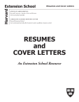Harvard Extension School Resumes and Cover Letters OFFICE OF CAREER SERVICES Harvard University · Faculty of Arts and Sciences www.ocs.fas.harvard.edu CAREER AND ACADEMIC RESOURCE CENTER Harvard Extension School www.extension.harvard.edu/resources/career-academic-resource-center RESUMES and COVER LETTERS An Extension School Resource © 2021 President and Fellows of Harvard College All rights reserved. No part of this publication may be reproduced in any way without the express written permission of the Harvard University Faculty of Arts & Sciences Office of Career Services. 7/21 Office of Career Services Harvard University Faculty of Arts & Sciences Cambridge, MA 02138 ocsrecep@fas.harvard.edu www.ocs.fas.harvard.edu RESUMES AND COVER LETTERS Create a Strong Resume A resume is a brief, informative summary of your abilities, education, and experience. It should highlight your strongest assets and skills relevant to the job for which you are applying, and differentiate you from other candidates seeking similar positions. Although it alone will not get you a job or internship, a good resume is an important element toward obtaining an interview. Tailor your resume to the type of position you are seeking. This does not mean that all of your experience must relate directly, but your resume should reflect the kind of skills the employer would value. NEED HELP? • • • RESUME TIPS RESUME LANGUAGE SHOULD BE: • Specific rather than general • Active rather than passive • Written to express not impress • Articulate rather than “flowery” • Fact-based (quantify and qualify) • Written for people who scan quickly DON’T: • Use personal pronouns (such as I) • Abbreviate • Use a narrative style • Number or letter categories • Use slang or colloquialisms • Include a picture • Include age or sex • List references • Start each line with a date CARC/OCS Resume and Cover Letter Webinar. Learn the nuts and bolts of getting started. See the CARC or OCS websites for dates. HES Call-ins. First Monday of the month or second Monday, if the first is a holiday, Sep-May, 1:00-3:45pm (10 minutes). Phone (617-496-8946) or Skype (amandacpeters. at.ocs) during call-in hours only. Available to currently registered Extension School students and alumni only. Career Advising Appointments. Matriculated degree students andalumni only. Please set up a 30-minute appointment via Crimson Careers; offered year-round. TOP 5 RESUME MISTAKES: 1. Spelling and grammar errors 2. Missing email and phone information 3. Using passive language instead of “action” words 4. Not well organized, concise, or easy to skim 5. Not tailored to the position or industry DO: • Be consistent in format and content • Make it easy to read and follow, balancing white space • Use consistent spacing, bold, and capitalization for emphasis • List headings (such as Experience) in order of importance • Within headings, list information in reverse chronological order (most recent first) • Avoid information gaps such as a missing summer • Be sure that your formatting translated properly if converted to a .pdf PLAN TO WORK INTERNATIONALLY? Resume guidelines can vary from country to country. RESUMES AND COVER LETTERS Action Verbs for your Resume LEADERSHIP Accomplished Achieved Administered Analyzed Assigned Attained Chaired Consolidated Contracted Coordinated Delegated Developed Directed Earned Evaluated Executed Handled Headed Impacted Improved Increased Led Mastered Orchestrated Organized Oversaw Planned Predicted Prioritized Produced Proved Recommended Regulated Reorganized Reviewed Scheduled Spearheaded Strengthened Supervised Surpassed COMMUNICATION Addressed Arbitrated Arranged Authored Collaborated Convinced Corresponded Delivered Developed Directed Documented Drafted Edited Energized Enlisted Formulated Influenced Interpreted Lectured Liaised Mediated Moderated Negotiated Persuaded Presented Promoted Publicized Reconciled Recruited Reported Rewrote Spoke Suggested Synthesized Translated Verbalized Wrote Clarified Collected Concluded Conducted Constructed Critiqued Derived Determined Diagnosed Discovered Evaluated Examined Extracted Formed Identified Inspected Interpreted Interviewed Investigated Modeled Organized Resolved Reviewed Summarized Surveyed Systematized Tested RESEARCH TECHNICAL Assembled Built Calculated Computed Designed Devised Engineered Fabricated Installed Maintained Operated Optimized Overhauled Programmed Remodeled Repaired Solved Standardized Streamlined Upgraded Adapted Advised Clarified Coached Communicated Coordinated Demystified Developed Enabled Encouraged Evaluated Explained Facilitated Guided Informed Instructed Persuaded Set Goals Stimulated Studied Taught Trained TEACHING QUANTITATIVE Administered Allocated Analyzed Appraised Audited Balanced Budgeted Calculated Computed Developed Forecasted Managed Marketed Maximized Minimized Planned Projected Researched Developed CREATIVE Acted Composed Conceived Conceptualized Created Customized Designed Directed Established Fashioned Founded Illustrated Initiated Instituted Integrated Introduced Invented Originated Performed Planned Published Redesigned Revised Revitalized Shaped Visualized HELPING Assessed Assisted Clarified Coached Counseled Demonstrated Diagnosed Educated Enhanced Expedited Facilitated Familiarized Guided Motivated Participated Proposed Provided Referred Rehabilitated Represented Served Supported Changed ORGANIZATIONAL Approved Accelerated Added Arranged Broadened Cataloged Centralized Classified Collected Compiled Completed Controlled Defined Dispatched Executed Expanded Gained Gathered Generated Implemented Inspected Launched Monitored Operated Organized Prepared Processed Purchased Recorded Reduced Reinforced Retrieved Screened Selected Simplified Sold Specified Steered Structured Systematized Tabulated Unified Updated Utilized Validated Verified RESUMES AND COVER LETTERS Write an Effective Cover Letter Your cover l