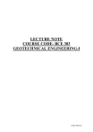 LECTURE NOTE COURSE CODE- BCE 303 GEOTECHNICAL ENGINEERING-I Under Revision SYLLABUS Module –I Introduction: Origin of soils, formation of soils, clay mineralogy and soil structure, basic terminology and their relations, index properties of soils. Soil classification: Particle size distribution, use of particle size distribution curve, Particle size classification, textural classification, HRB classification, Unified classification system, Indian standard soil classification system, Field identification of soils. Soil moisture: Types of soil water, capillary tension, capillary siphoning. Stress conditions in soil: Total stress, pore pressure and effective stress. Module – II Permeability: Darcy’s law, permeability, factors affecting permeability, determination of permeability (laboratory and field methods), permeability of stratified soil deposits. Estimation of yield from wells. Seepage analysis: Seepage pressure, quick condition, laplace equation for two –dimensional flow, flow net, properties and methods of construction of flow net, application of flow net, seepage through anisotropic soil and non-homogenous soil, seepage through earth dam. Module – III Soil compaction: Compaction mechanism, factors affecting compaction, effect of compaction on soil properties, density moisture content relationship in compaction test, standard and modified proctor compaction tests, field compaction methods, relative compaction, compaction control. Soil consolidation: Introduction, spring analogy, one dimensional consolidation, Terzaghi’s theory of one dimensional consolidation, consolidation test, determination of coefficient of consolidation. Module –IV Shear strength of soils: Mohr’s stress circle, theory of failure for soils, determination of shear strength (direct shear test, tri-axial compression test, unconfined compression test, van shear test), shear characteristics of cohesionless soils and cohesive soils. Stabilization of soil: Introduction, mechanical stabilization, cement stabilization, lime stabilization, bituminous stabilization, chemical stabilization, thermal stabilization, electrical stabilization, stabilization by grouting, use of geo-synthetic materials, reinforced earth. Reference Books: 1. Geotechnical Engineering, C. Venkatramaiah, New Age International publishers. 2. Geotechnical Engineering, T.N. Ramamurthy & T.G. Sitharam, S. Chand & Co. 3. Soil Mechanics, T.W. Lambe & Whiteman, Wiley Eastern Ltd, Nw Under Revision LECTURE 1 Introduction: The term "soil" can have different meanings, depending upon the field in which it is considered. To a geologist, it is the material in the relative thin zone of the Earth's surface within which roots occur, and which are formed as the products of past surface processes. The rest of the crust is grouped under the term "rock". To a pedologist, it is the substance existing on the surface, which supports plant life. To an engineer, it is a material that can be: built on: foundations of buildings, bridges built in: basements, culverts, tunnels built with: embankments, roads, dams supported: retaining walls Soil Mechanics is a discipline of Civil Engineering involving the study of soil, its behaviour and application as an engineering material. Soil Mechanics is the application of laws of mechanics and hydraulics to engineering problems dealing with sediments and other unconsolidated accumulations of solid particles, which are produced by the mechanical and chemical disintegration of rocks, regardless of whether or not they contain an admixture of organic constituents. Soil consists of a multiphase aggregation of solid particles, water, and air. This fundamental composition gives rise to unique engineering properties, and the description of its mechanical behavior requires some of the most classic principles of engineering mechanics. Engineers are concerned with soil's mechanical properties: permeability, stiffness, and strength. These depend primarily on the nature of the soil grains, the current stress, the water content and unit weight. Formation of Soils: Soil is formed from rock due to erosion and weathering action. Igneous rock is the basic rock formed from the crystallization of molten magma. This rock is formed either inside the earth or on the surface. These rocks undergo metamorphism under high temperature and pressure to form Metamorphic rocks. Both Igneous and metamorphic rocks are converted in to sedimentary rocks due to transportation to different locations by the agencies such as wind, water etc. Finally, near the surface millions of years of erosion and weathering converts rocks in to soil. Under Revision . Fig. Geologic Cycle of Soil Soils are formed from materials that have resulted from the disintegration of rocks by various processes of physical and chemical weathering. The nature and structure of a given soil depends on the processes and conditions that formed it: Breakdown of parent rock: weathering, decomposition, erosion. Transportation to site of final deposition: gravity, flowing water, ice, wind. Environment of final deposition: flood plain, river terrace, glacial moraine, lacustrine or marine. Subsequent conditions of loading and drainage: little or no surcharge, heavy surcharge due to ice or overlying deposits, change from saline to freshwater, leaching, contamination. All soils originate, directly or indirectly, from different rock types. Weathering: Physical weathering reduces the size of the parent rock material, without any change in the original composition of the parent rock. Physical or mechanical processes taking place on the earth's surface include the actions of water, frost, temperature changes, wind and ice. They cause disintegration and the products are mainly coarse soils. The main processes involved are exfoliation, unloading, erosion, freezing, and thawing. The principal cause is climatic change. In exfoliation, the outer shell separates from the main rock. Heavy rain and wind cause erosio