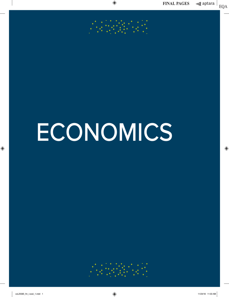 ECONOMICS coL25585_fm_i-xxxii_1.indd 1 11/24/18 11:03 AM The McGraw-Hill Series in Economics EssEntials of Economics Brue, McConnell, and Flynn Essentials of Economics Fourth Edition Mandel Economics: The Basics M: Economics—The Basics Third Edition Schiller Essentials of Economics Tenth Edition PrinciPlEs of Economics Asarta and Butters Connect Master: Economics Second Edition Colander Economics, Microeconomics, and Macroeconomics Eleventh Edition Frank, Bernanke, Antonovics, and Heffetz Principles of Economics, Principles of Microeconomics, and Principles of Macroeconomics Seventh Edition Frank, Bernanke, Antonovics, and Heffetz A Streamlined Approach for: Principles of Economics, Principles of Microeconomics, and Principles of Macroeconomics Third Edition Karlan and Morduch Economics, Microeconomics, and Macroeconomics Second Edition McConnell, Brue, and Flynn Economics, Microeconomics, and ­Macroeconomics Twenty-First Edition McConnell, Brue, and Flynn Brief Editions: Microeconomics and Macroeconomics Third Edition Samuelson and Nordhaus Economics, Microeconomics, and ­Macroeconomics Nineteenth Edition coL25585_fm_i-xxxii_1.indd 2 Schiller The Economy Today, The Micro Economy Today, and The Macro Economy Today Fifteenth Edition Slavin Economics, Microeconomics, and ­Macroeconomics Eleventh Edition Economics of social issuEs Guell Issues in Economics Today Seventh Edition Register and Grimes Economics of Social Issues Twenty-First Edition EconomEtrics and data analytics Frank Microeconomics and Behavior Ninth Edition advancEd Economics Romer Advanced Macroeconomics Fifth Edition monEy and Banking Cecchetti and Schoenholtz Money, Banking, and Financial ­Markets Fifth Edition urBan Economics O’Sullivan Urban Economics Ninth Edition laBor Economics Hilmer and Hilmer Practical Econometrics First Edition Borjas Labor Economics Eighth Edition Prince Predictive Analytics for Business Strategy First Edition McConnell, Brue, and Macpherson Contemporary Labor Economics Eleventh Edition managErial Economics Rosen and Gayer Public Finance Tenth Edition Baye and Prince Managerial Economics and Business Strategy Ninth Edition Brickley, Smith, and Zimmerman Managerial Economics and ­Organizational Architecture Sixth Edition Thomas and Maurice Managerial Economics Twelfth Edition intErmEdiatE Economics Bernheim and Whinston Microeconomics Second Edition PuBlic financE EnvironmEntal Economics Field and Field Environmental Economics: An Introduction Seventh Edition intErnational Economics Appleyard and Field International Economics Ninth Edition Pugel International Economics Seventeenth Edition Dornbusch, Fischer, and Startz Macroeconomics Thirteenth Edition 11/24/18 11:03 AM ELEVENTH EDITION Economics David C. Colander Middlebury College coL25585_fm_i-xxxii_1.indd 3 11/24/18 11:03 AM ECONOMICS, ELEVENTH EDITION Published by McGraw-Hill Education, 2 Penn Plaza, New York, NY 10121. Copyright ©2020 by McGraw-Hill Education. All rights reserved. Printed in the United States of America. Previous editions ©2017, 2013, and 2010. No part of this publication may be reproduced or distributed in any form or by any means, or stored in a database or retrieval system, without the prior written consent of McGraw-Hill Education, including, but not limited to, in any network or other electronic storage or transmission, or broadcast for distance learning. Some ancillaries, including electronic and print components, may not be available to customers outside the United States. This book is printed on acid-free paper. 1 2 3 4 5 6 7 8 9 LWI 21 20 19 ISBN 978-1-260-22558-7 (bound edition) MHID 1-260-22558-5 (bound edition) ISBN 978-1-260-50694-5 (loose-leaf edition) MHID 1-260-50694-0 (loose-leaf edition) Director: Anke Weekes Senior Product Developer: Christina Kouvelis Marketing Manager: Bobby Pearson Lead Content Project Manager, core: Christine Vaughan Senior Content Project Manager, assessment: Bruce Gin Senior Buyer: Laura Fuller Designer: Egzon Shaqiri Content Licensing Specialist: Melissa Homer Cover Image: ©amiak/Shutterstock Compositor: Aptara®, Inc. All credits appearing on page or at the end of the book are considered to be an extension of the copyright page. Library of Congress Cataloging-in-Publication Data Names: Colander, David C., author. Title: Economics / David C. Colander, Middlebury College. Description: Eleventh edition. | New York, NY : McGraw-Hill Education, [2020] Identifiers: LCCN 2018046218 | ISBN 9781260225587 (alk. paper) | ISBN 1260225585 (alk. paper) Subjects: LCSH: Economics. Classification: LCC HB171.5 .C788 2020 | DDC 330—dc23 LC record available at https://lccn.loc.gov/2018046218 The Internet addresses listed in the text were accurate at the time of publication. The inclusion of a website does not indicate an endorsement by the authors or McGraw-Hill Education, and McGraw-Hill Education does not guarantee the accuracy of the information presented at these sites. mheducation.com/highered coL25585_fm_i-xxxii_1.indd 4 11/24/18 11:03 AM About the Author David Colander is Distinguished College Professor at Middlebury College. He has authored, coauthored, or edited over 40 books and over 200 articles on a wide range of economic topics. He earned his BA at Columbia College and his MPhil and PhD at Columbia University. He also studied at the University of Birmingham in England and at Wilhelmsburg Gymnasium in Germany. Professor Colander has taught at Columbia University, Vassar College, the University of Miami, and Princeton Courtesy of David Colander University as the Kelley Professor of Distinguished Teaching. He has also been a consultant to Time-Life Films, a consultant to Congress, a Brookings Policy Fellow, and Visiting Scholar at Nuffield College, Oxford. Professor Colander has been president of both the History of Economic Thought Society and the Eastern Economics Association. He has also served on the editorial boards of The Journal of Economic Perspectives, The Journal of 