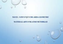 MAVZU. 3-SINF O’QUVCHILARIDA GEOMETRIC MATERIALLARNI O’RGATISH METODIKASI Ma‘lumki oʻquvchilarda matematika darslarida raqamli axborotlardan koʻra tasviriy axborotlar muhim hisoblanadi. Zero matematik bilimlarni (masalan har xil modellar, grafiklar, diagrammalar, grafiklar) va geometrik bilimlar (geometrik figuralarni)ni tasviriy tasvirlarsiz oʻrgatish mumkin emas. axborotlarsiz ya‘ni, Boshlang’ich sinflar dasturida geometriya materiali mustaqil boʻlim sifatida ajratilmagan. Boshlang’ich matematika kursida geometriya elementlarini oʻrganish arifmetikani oʻrganish masalalari bilan uzviy bog’liqdir. Hozir amal qilinayotgan dasturga muvofiq oʻquvchilar matematik ifodalar, sonli tengliklar va tenglamalar haqida boshlang’ich ma‘lumotlar olishlari lozim, harfiy simvolika (belgilash), oʻzgaruvchi bilan tanishishlari, eng sodda tenglama va tengsizliklarni еchishni oʻrganishlari kerak. Boshlang’ich sinflarda oʻquvchilar bilan tenglik, tengsizlik, tenglama kabi matematik ifodalar (sonli ifoda va oʻzgaruvchili ifodalar) haqidagi tushunchalarni shakllantirish boʻyicha rejali ish olib boriladi. Bu tushunchalarning hammasi oʻzaro uzviy bog’langandir. Masalan, harfiy simvolikani kiritish oʻquvchilarga tengsizlik, tenglama va boshqa tushunchalar uchun propedevtik material sifatida tanishtirish imkonini beradi. Harfdan oʻzgaruvchini ifodalovchi simvol sifatida foydalanish boshlang’ich matematika kursida qaraladigan arifmetika nazariyasi masalalarini ongli, chuqur va umumlashgan holda oʻzlashtirish maqsadlariga xizmat qiladi, keyinchalik bolalarni oʻzgaruvchi funksiya tushunchalari bilan tanishtirish uchun yaxshi tayyorgarlik boʻladi. Oʻquvchilarda tenglik va tengsizlik tushunchalarini shakllantirish boʻyicha bajariladigan ishlar tenglamalar еchish va masalalarni tenglama tuzish yoʻli bilan еchishni kiritish uchun tayyorgarlik boʻlib xizmat qiladi. Sonli ifodalarning qiymatini topishga doir misol va masalalar birinchi sinfdan boshlab oʻrganiladi. Abatta sonli ifodalarning qiymatini topish yuzasidan misollar dastlab tasvirlar koʻrinishida tushuntiriladi. Tasvirlarni namoyish qilishda axborot texnologiyalari muhim ahamiyat kasb etadi. 2 + 3 = 5 Shuningdek masalalar еchimini topishga doir syujetli tasvirlar (video roliklar) sonli ifodalarnning qiymatini topishga, shuningdek, harfli ifodalar bilan tanishtirishga ham yordam beradi. «Ifoda», «Ifodaning qiymati» atamalari ikkinchi sinfda kiritiladi. Shu vaqtdan boshlab topshiriqlar ushbu shaklda beriladi: «Ifodani yoz va uning qiymatini hisobla», «Ifodalarni taqqosla», «Ifodani oʻqi», «Berilgan masala boʻyicha ifoda tuz». «Berilgan ifoda boʻyicha masala tuz» va hokazo. Bunday koʻrinishdagi topshiriqlarning bajarilishini jadval koʻrinishida ifodalash mumkin. Masalan, agar s=16, 33, 48, d=14, 15, 8 boʻlsa, s+d va s—d ifodalarning qiymatlarini toping. Daftarda jadval koʻrinishida yoziladi: S 16 33 48 D 14 15 48 s+d 30 48 96 S 16 33 48 D 14 15 48 S-d 2 18 0 Ushbu jadvalni toʻldiring: Birinchi qoʻshiluvchi b bir xil qiymatlarni qabul qilishini aniqlaganlaridan soʻng bolalar b+d yig’indi oʻrniga 37+d ifodani yozib, ikki grafali jadvalga oʻtadilar. D 37+d 10 15 0 Jadvallarni toʻldirish oʻqituvchiga ayirma va boʻlinmaning mavjudlik shartiga bolalarning e‘tiborini qaratish imkonini beradi. Masalan, bunday topshiriq taklif qilinadi: «Ushbu 0, 1, 15, 20, 23, 40, 50 sonlar qatoridan «b» ayiriluvchi uchun yaroqli qiymatlarni tanla va jadvalni 0, 1, 15, 20, 23, 40, 50 toʻldir» B 0 1 15 19-b Topshiriq bajarilganidan soʻng oʻqituvchi soʻraydi:» 20, 23, 40, 50 qiymatlarni nega tanlamadingiz? Jadvalning qolgan kataklarini toʻldirish uchun yana qaysi qiymatlarni qabul kilish mumkin? 19 qiymatni qabul qilish mumkinmi?» 0,1,2,3,4,5,6,7,8,9,10,11,12,13,14,15,16,17,18, 19 19 Umumiy xulosa chiqariladi: «Ayirishda kamayuvchi ayiruvchidan katta yoki unga teng». Harfning matematikada simvol sifatidagi umumlashtiruvchi ahamiyati kelgusida oʻquvchilar kuzatadigan sonli bog’lanishlarni umumlashtirishda harflardan foydalanishga yordam beradi. Oʻqituvchi shu maqsadda topshiriqlarni maxsus tanlaydi. Shunga oʻxshash topshiriqlarni oʻqituvchining oʻzi ham matematika dasturiga amal qilgan holda tuzishi mumkin. Harfiy simvolikadan foydalanish boʻyicha ishni muntazam oʻtkazib borish kerak. U oʻquvchilar bilimlarining umumlashtirish darajasining ortishiga yordam beradi, yuqori sinflarda geometriya kursini oʻrganishga tayyorlaydi. Tengliklar, tengsizliklar va tenglamalar haqidagi tushunchalar oʻzaro bog’lanishda ochib beriladi. Ular ustidagi ish I sinfdan boshlab, arifmetik materialni oʻrganish bilan uzviy qoʻshib olib boriladi. I—II sinflarda sonli tenglama va tengsizlik haqida boshlang’ich tasavvurlar shakllantiriladi. Tenglik va tengsizliklar haqidagi birinchi tasavvurlarni bolalar tayyorgarlik davridayoq oladilar. Ikkita toʻplaorasida oʻzaro bir qiymatli moslik oʻrnatish, bir xil miqdorda boʻlmagan narsalar guruxlarini bir xil miqdordagi narsalar guruhlariga (ikki usul bilan) aylantirish va bir xil miqdordagi narsalar guruhlarini bir xil miqdor boʻlmagan narsalar guruxdariga aylantirish (ikki usul bilan) bilan «katta», «kichik», «kam», «teng» tushunchalari mustahkamlanadi. Ish bunday olib boriladi. Oʻqituvchi katakli taxtachada 5 ta doiracha tayyorlab qoʻyadi. Oʻqituvchi. «Men hozir doirachalar tagiga kvadratchalar qoʻyaman, men kvadratchalardan koʻp qoʻyamanmi yoki kam qoʻyamanmi?» Har bir doirachaning tagiga kvadratchani qoʻyadi. Bolalar koʻzlari bilan har bir kvadratchaga doirachani mos qoʻyadilar va kvadratchalar doirachalardan kam ekanligini aniqlaydilar («Katta», «teng» tushunchalari ham shunga oʻxshash shakllantiriladi). — Doirachalar qancha boʻlsa, kvadratchalar shuncha boʻlishi uchun nima qilish kerak (Birinchi usulni bolalar tez topadilar)? — — Yana kvadratchalar qoʻyish kerak. Har bir doirachaning tagida kvadratcha turibdi, demak,