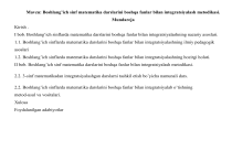 Mavzu: Boshlang’ich sinf matematika darslarini boshqa fanlar bilan integratsiyalash metodikasi. Mundareja Kirish . I bob. Boshlang’ich sinflarda matematika darslarini boshqa fanlar bilan integratsiyalashning nazariy asoslari. 1.1. Boshlang’ich sinflarda matematika darslarini boshqa fanlar bilan integratsiyalashning ilmiy pedagogik asoslari 1.2. Boshlang’ich sinflarda matematika darslarini boshqa fanlar bilan integratsiyalashning hozirgi holati. II bob. Boshlang’ich sinf matematika darslarini boshqa fanlar bilan integratsiyalash metodikasi. 2.2. 3-sinf matematikadan integratsiyalashgan darslarni tashkil etish bo’yicha namunali dars. 2.2. Boshlang’ich sinflarda matematika darslarini boshqa fanlar bilan integratsiyalab o’tishning metod-usul va vositalari. Xulosa Foydalanilgan adabiyotlar Kirish Mavzuning dolzarbligi: Yosh o’rganuvchilar ilk maktab kunlaridanoq matematika bilan tanishishadi. Va shu bilan birga bu fan orqali barcha fanlarga yo’l ochishadi. O’rganilayotgan fanlarning barcha mavzularida matemaikaga murojaat qilamiz. Yosh o’rganuvchilar uchun matematika dunyoning bilim eshiklarini ochadi, hamda o’z o’rganuvchilari uchun deyarli har kuni yangi topshiriq bera oladi. Fanlararo bog’lanishlarni to’g’ri amalga oshirish uchun o’qituvchi buni hisobga olishi juda muhimdir. Boshlang’ich sinflarda predmetlararo bog’lanishlarni amalga oshirish juda oson kechadi. Chunki barcha fanlarni bir o’qituvchi olib boradi va shu sababli uning oldiga fanlararoo bog’lanishlar ochiladi. Boshlang’ich sinflarning o’quv fanlari tevarak atrofdagi voqealar va hodisalar, ularning xossalariga oid aniq tasavvurlar oladilar. Matematikaning faxrlanuvchi xususiyati shundan iboratki, u ob’yektiv borliqni o’rganish bilan bir vaqtda o’rganilayotgan moddiy dunyoning eng umumiy tomonlariga tegishli bo’lmagan, uning miqdoriy tomonlariga hamda fazoviy shakl va munosabatlarga tegishli bo’lmagan hamma narsaga nisbatan abstraksiyalanadi. Ya’ni tushunchalarni abstraksiyaligi va umumiyligini e’tirof etadi. Ular orasida bog’lanishlarni ifoda etadi bunday bog’lanishlarni o`rgatadi umumiy faoliyatlarni son haqidagi, arifmetik amallar haqidagi tasavvurlar va elementar tushunchalar, har xil malaka va ko’nikmalar, faoliyat turlari, o’qitish forma va metodlarga tayanadi. Mamlakatimizda yuz berayotgan ijtimoiy-iqtisodiy munosabatlar, xalq ta’limi tizimda bo’layogan o’zgarishlar ta’lim to’g’risidagi qonunlarda hamda «Kadrlar tayyorlash midlliy dasturi»da ko’rsatib o’tilgandek har bir boshlang’ich sinf o’qituvchisi oldiga muhim vazifa qo’ymoqda. Bu vazifa boshlang’ich ta’lim uchun xos bo’g’inlarni ajratish imkonini beradiki, bu bo’g’inlar xilma-xil o’quv fanlari dasturida, o’quv rejalarida darsliklarda ta’limning joriy etilishi hamda metodik tizimda biror tarmoqni hosil qilish mumkin. Davlat ta’lim standartlari o’quv fani bo’yicha o’quv metodik rejalarni yaratish uchun keng imkoniyatlar ochib beradi. Shuningdek o’quv fanlararo bog’lanish va bilimlarni muvofiqlashtirish tamoyili asosida o’quv fanlarining o’zaro bog’liqligi va fanlararo bog’lanishlarni ta’minlashga xizmat qiladi. Boshlang’ich sinflarda o’qituvchilarning metodik-matematik tayyorgarligi haqida so’z borganda biz uni ilmiy pedagogik va matematik tayyorgarlik bilan uzviy bog’lanishda tayyorgarligini tushunish kerak. Boshlang’ich ta’limda matematika fani alohida o’rin egallaydi, chunki bu fan bolalarni hisoblash qobiliyatlarini shakllantiribgina qolmay ularning dunyoqarashlarini rvojlantirish, hayotda uchraydigan turli-tuman tushunchalar, miqdorlar har xil xossalar bilan tanishtiradilar. Darsliklarda berilgan har qanday misol va masalalarni yechishda fanlar bog’lanishlarni aniqlab ularni hayot bilan bog’laymiz. So’ngi yillarda respublikamiz boshlang’ich sinf maktablarida matematikani o’qitish butun sistemasida o’z ko’lami va ahamiyati jihatidan nihoyatda katta bo’lgan o’zgarishlar amalga oshirilmoqda. Maktab oldiga yangi vazifalarning qo’yilishi matematika o’qitish mazmunini tubdan o’zgarishiga olib keldi. Ma’lumki, boshlang‘ich ta’lim jarayoni juda murakkab jarayondir. Bu jarayonni hozirgi kunda davr talabi asosida tashkil etish, ya’ni uzluksiz ta’lim tizimida uzviylikni ta’minlash boshlang‘ich sinf o‘qituvchilaridan katta mas’uliyat, bilim, mahoratni talab etadi. 1-4-sinflardagi matematika darslari umumiy o‘rta ta’lim maktab matematika fani uchun asos, poydevor ekan, bu sinflarda matematika o‘qitilishini eng zamonaviy talablar darajasiga ko‘tarmoq zamon talabidir. Chunki. bolalarga keyinchalik matematika va boshqa fanlar uchun zarur bo‘lgan elementar, tushunchalar shu sinflarda singdiriladi. Kurs ishining maqsadi: Boshlang’ich sinf o’quvchilariga matematika darslarini o’rgatish jarayonida ularni tejamkorlikga o’rgatish usullari va ularni matematikaga bo’lgan qiziqishlarini uyg’otish. Kurs ishining vazifasi: Matematika darslarida o'quvchilarni tejamkorlikga o'rgatish hamda ularni teran fikrlashga o’rgatish. Kurs ishi obyekti: Kurs ishining muammosiga oid falsafiy, psixologik, pedagogik hamda metodik adabiyotlar ta’lim mazmunini yorituvchi me’yoriy hujjatlar mazmunini o’rganish va tahlil qilish; nazariy- mantiqiy tahlil, ilg’or pedagogik tajribalarni o’rganish, ta’lim jarayonini kuzatish, suhbat, qiyosiy tahlil, pedagogik tajriba-sinov so’rov-anketa, ishlarini tashkil etish, olingan natijalarni tahlil qilish kabi usullardan foydalanildi. Kurs ishining tarkibiy tuzilishi. Ushbu Kurs ishi kirish, asosiy qism, xulosa, foydalanilgan adabiyotlar ro’yxati hamda ilovalardan iborat. O'zbekiston Respublikasi Prezidentining 2022 yil 14-apreldagi “Prezident ta'lim muassasalari agentligi tizimidagi ixtisoslashtirilgan maktablar tarmog'ini kengaytirish to'g'risida” gi Farmonida belgilanganidek“2022 yil 1 sentyabrga qadar iqtidorli bolalar bilan ishlashning 