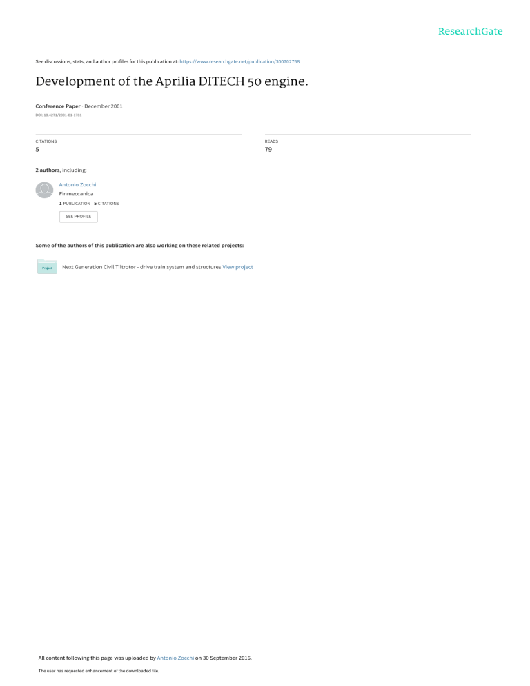 See discussions, stats, and author profiles for this publication at: https://www.researchgate.net/publication/300702768 Development of the Aprilia DITECH 50 engine. Conference Paper · December 2001 DOI: 10.4271/2001-01-1781 CITATIONS READS 5 79 2 authors, including: Antonio Zocchi Finmeccanica 1 PUBLICATION 5 CITATIONS SEE PROFILE Some of the authors of this publication are also working on these related projects: Next Generation Civil Tiltrotor - drive train system and structures View project All content following this page was uploaded by Antonio Zocchi on 30 September 2016. The user has requested enhancement of the downloaded file. View publication stats