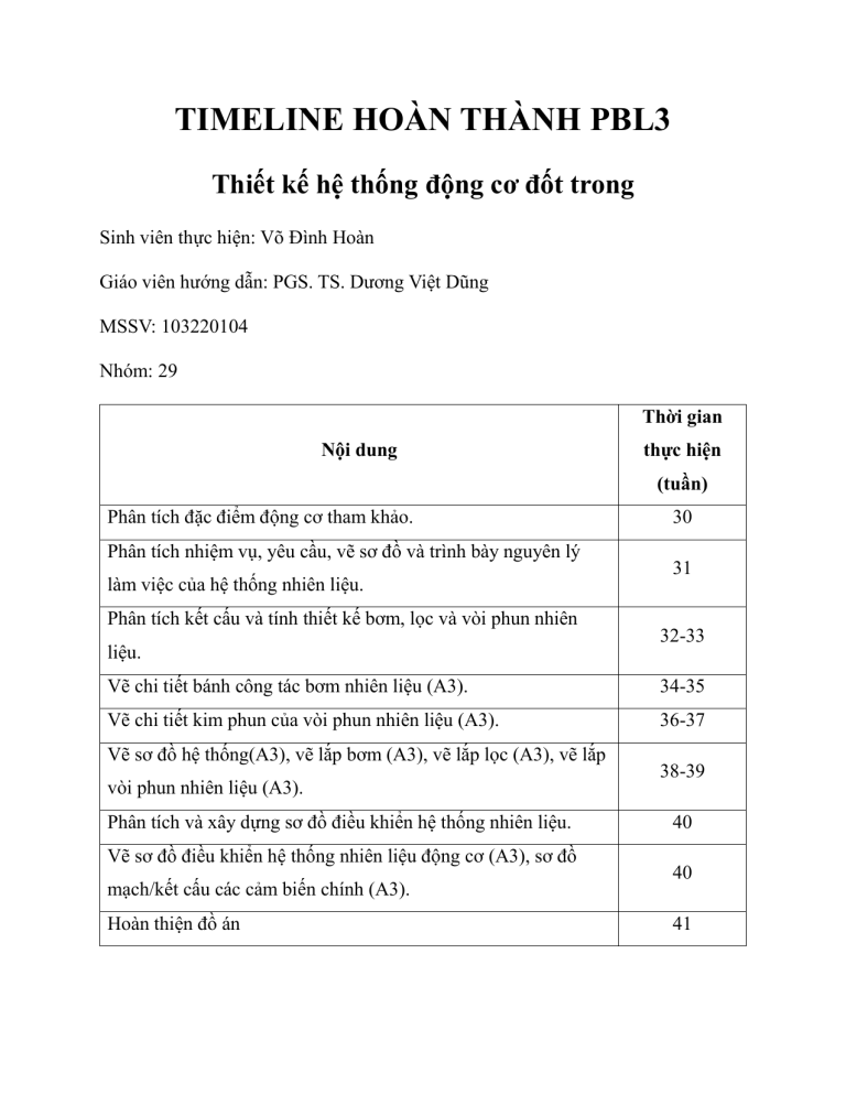 TIMELINE HOÀN THÀNH PBL3 Thiết kế hệ thống động cơ đốt trong Sinh viên thực hiện: Võ Đình Hoàn Giáo viên hướng dẫn: PGS. TS. Dương Việt Dũng MSSV: 103220104 Nhóm: 29 Thời gian Nội dung thực hiện (tuần) Phân tích đặc điểm động cơ tham khảo. Phân tích nhiệm vụ, yêu cầu, vẽ sơ đồ và trình bày nguyên lý làm việc của hệ thống nhiên liệu. Phân tích kết cấu và tính thiết kế bơm, lọc và vòi phun nhiên liệu. 30 31 32-33 Vẽ chi tiết bánh công tác bơm nhiên liệu (A3). 34-35 Vẽ chi tiết kim phun của vòi phun nhiên liệu (A3). 36-37 Vẽ sơ đồ hệ thống(A3), vẽ lắp bơm (A3), vẽ lắp lọc (A3), vẽ lắp vòi phun nhiên liệu (A3). Phân tích và xây dựng sơ đồ điều khiển hệ thống nhiên liệu. Vẽ sơ đồ điều khiển hệ thống nhiên liệu động cơ (A3), sơ đồ mạch/kết cấu các cảm biến chính (A3). Hoàn thiện đồ án 38-39 40 40 41
