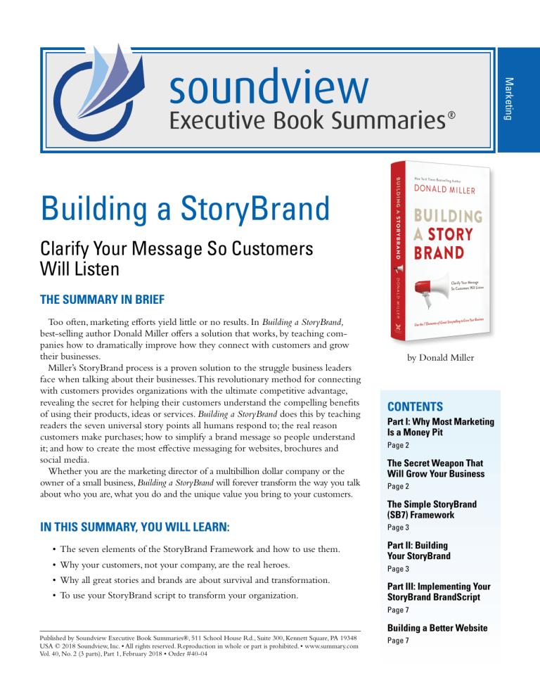 Marketing Building a StoryBrand Clarify Your Message So Customers Will Listen THE SUMMARY IN BRIEF Too often, marketing efforts yield little or no results. In Building a StoryBrand, best-selling author Donald Miller offers a solution that works, by teaching companies how to dramatically improve how they connect with customers and grow their businesses. Miller’s StoryBrand process is a proven solution to the struggle business leaders face when talking about their businesses. This revolutionary method for connecting with customers provides organizations with the ultimate competitive advantage, revealing the secret for helping their customers understand the compelling benefits of using their products, ideas or services. Building a StoryBrand does this by teaching readers the seven universal story points all humans respond to; the real reason customers make purchases; how to simplify a brand message so people understand it; and how to create the most effective messaging for websites, brochures and social media. Whether you are the marketing director of a multibillion dollar company or the owner of a small business, Building a StoryBrand will forever transform the way you talk about who you are, what you do and the unique value you bring to your customers. CONTENTS IN THIS SUMMARY, YOU WILL LEARN: Page 3 • The seven elements of the StoryBrand Framework and how to use them. • Why your customers, not your company, are the real heroes. • Why all great stories and brands are about survival and transformation. • To use your StoryBrand script to transform your organization. by Donald Miller Part I: Why Most Marketing Is a Money Pit Page 2 The Secret Weapon That Will Grow Your Business Page 2 The Simple StoryBrand (SB7) Framework Part II: Building Your StoryBrand Page 3 Part III: Implementing Your StoryBrand BrandScript Page 7 Building a Better Website Published by Soundview Executive Book Summaries®, 511 School House Rd., Suite 300, Kennett Square, PA 19348 USA © 2018 Soundview, Inc. • All rights reserved. Reproduction in whole or part is prohibited. • www.summary.com Vol. 40, No. 2 (3 parts), Part 1, February 2018 • Order #40-04 Page 7 THE COMPLETE SUMMARY: BUILDING A STORYBRAND by Donald Miller The author: Donald Miller is the CEO of StoryBrand, a company dedicated to helping individuals and organizations clarify and simplify their marketing. He has helped more than 3,000 businesses clarify their marketing messages so their companies grow. He is also the cohost of the Building a StoryBrand Podcast and the author of several books, including the best-sellers Blue Like Jazz and A Million Miles in a Thousand Years. Building a StoryBrand: Clarify Your Message So Customers Will Listen by Donald Miller. Copyright © 2017 by Donald Miller. Published by arrangement with HarperCollins Leadership, an imprint of HarperCollins Publishers. 240 pages, $24.99, ISBN 978-0-7180-3332-3. Summary copyright © 2018 by Soundview Executive Book Summaries ® www.summary.com, 1-800-SUMMARY. PART I: WHY MOST MARKETING IS A MONEY PIT The Key to Being Seen, Heard and Understood Most companies waste enormous amounts of money on marketing. We all know how mind-numbing it is to spend precious dollars on a new marketing effort that gets no results. When we see the reports, we wonder what went wrong, or worse, whether our product is really as good as we thought it was. But what if the problem wasn’t the product? What if the problem was the way we talked about the product? The fact is, pretty websites don’t sell things. Words sell things. And if we haven’t clarified our message, our customers won’t listen. The first mistake brands make is they fail to focus on the aspects of their offer that will help people survive and thrive. All great stories are about survival — either physical, emotional, relational or spiritual. This means that if we position our products and services as anything but an aid in helping people survive, thrive, be accepted, find love, achieve an aspirational identity or bond with a tribe that will defend them physically and socially, good luck selling anything to anybody. These are the only things people care about. The second mistake brands make is they cause their customers to burn too many calories in an effort to understand their offer. When having to process too much seemingly random information, people begin to ignore the source of that useless information in an effort to conserve calories. There’s a survival mechanism within our customers’ brain that is designed to tune us out should we ever start confusing them. The most powerful tool we can use to organize information so people don’t have to burn very many calories is story. Story is a sense-making device. It identifies a necessary ambition, defines challenges that are battling to keep us from achieving that ambition and provides a plan to help us conquer those challenges. When we define the elements of a story as it relates to our brand, we create a map customers can follow to engage our products and services. The narrative coming out of a company must be clear. Our customers have questions burning inside them, and if we aren’t answering those questions, they’ll move on to another brand. If we haven’t identified what our customer wants, what problem we are helping them solve and what life will look like after they engage our products and services, for example, we can forget about thriving in the marketplace. To clarify our message we’re going to need a formula. A serious formula. This formula needs to organize our thinking, reduce our marketing effort, obliterate confusion, terrify the competition and finally get our businesses growing again. l The Secret Weapon That Will Grow Your Business To grow your company, you can simplify your message into soundbites that come from seven categories. Once you have these seven messages down, any anxiety you 1-800-SUMMARY Published by Soundview Executive Book Summaries® (