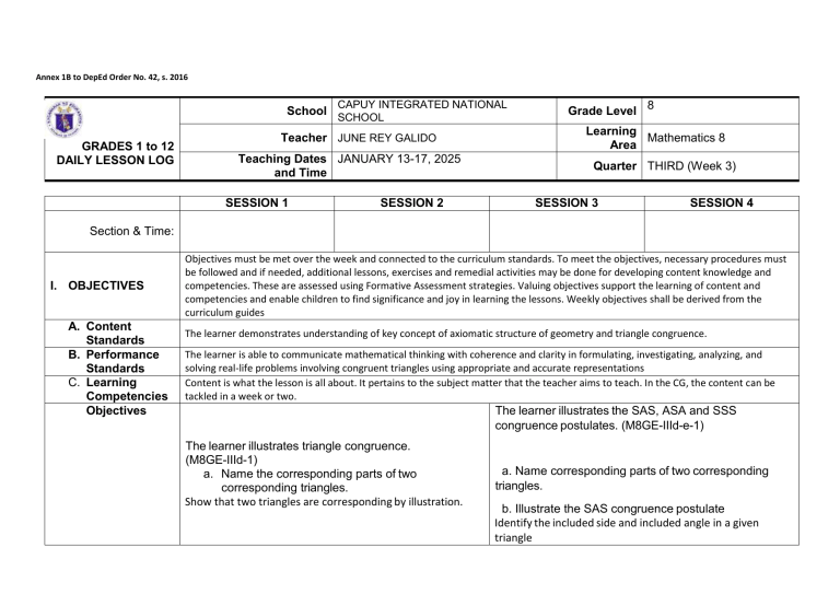 Annex 1B to DepEd Order No. 42, s. 2016 School GRADES 1 to 12 DAILY LESSON LOG CAPUY INTEGRATED NATIONAL SCHOOL Teacher JUNE REY GALIDO Teaching Dates JANUARY 13-17, 2025 and Time SESSION 1 SESSION 2 Grade Level 8 Learning Mathematics 8 Area Quarter THIRD (Week 3) SESSION 3 SESSION 4 Section & Time: I. OBJECTIVES A. Content Standards B. Performance Standards C. Learning Competencies Objectives Objectives must be met over the week and connected to the curriculum standards. To meet the objectives, necessary procedures must be followed and if needed, additional lessons, exercises and remedial activities may be done for developing content knowledge and competencies. These are assessed using Formative Assessment strategies. Valuing objectives support the learning of content and competencies and enable children to find significance and joy in learning the lessons. Weekly objectives shall be derived from the curriculum guides The learner demonstrates understanding of key concept of axiomatic structure of geometry and triangle congruence. The learner is able to communicate mathematical thinking with coherence and clarity in formulating, investigating, analyzing, and solving real-life problems involving congruent triangles using appropriate and accurate representations Content is what the lesson is all about. It pertains to the subject matter that the teacher aims to teach. In the CG, the content can be tackled in a week or two. The learner illustrates the SAS, ASA and SSS congruence postulates. (M8GE-IIId-e-1) The learner illustrates triangle congruence. (M8GE-IIId-1) a. Name the corresponding parts of two corresponding triangles. Show that two triangles are corresponding by illustration. a. Name corresponding parts of two corresponding triangles. b. Illustrate the SAS congruence postulate Identify the included side and included angle in a given triangle II. CONTENT III. LEARNING RESOURCES 1. Teacher’s Guide pages 2. Learner’s Materials pages 3. Textbook pages 4. Additional Materials from Learning Resource (LR) portal B. Other Learning Resources IV. PROCEDURES A. Reviewing previous lesson or presenting the new lesson Triangle Congruence SAS ( Side-Angle-Side ) Congruence Pages 382 - 384 Pages 382 - 384 Pages 382 - 384 Pages 382 - 384 Mathematics Learner’s Module for Grade 8, pages 349-352 Mathematics Learner’s Module for Grade 8, pages 349-352 Learners’ Math Module, pp.354-355 Moving Ahead With Math Learners’ Math Module, pp.354-355 Moving Ahead With Math “WHO’S MY MOM” activity Review: Parts of Triangle Review : Included Side Presentation of Objectives “Loop-Me-In” Activity Presentation of Objectives Presentation of Objectives Presentation of Objectives Presentation of illustrative examples. Presentation of illustrative examples. Activity 1 B. Establishing a purpose for the lesson C. Presenting examples/insta Activity 1 nces of the new lesson D. Discussing new concepts and practicing new skills #1 E. Discussing new concepts and practicing new skills #2 F. Developing mastery (Leads to Formative Assessment 3) G. Finding practical applications of concepts and skills in daily living Think-Pair-Share Activity “Find Your Partner”Activity Guided Practice Let’s Do This Guided Practice (Think-PairShare) Independent Practice I Can Do This “Supportive-CongruentTriangles”Activity Corresponding angles are pairs of angles whose vertices are paired in a H. Making given correspondence generalizations between two triangles. and Corresponding sides are abstractions the pairs of sides whose about the endpoints are the vertices lesson that are paired in a given correspondence between two triangles. Independent Practice “Supportive-CongruentTriangles”Activity Two triangles are congruent if their vertices can be paired so their corresponding sides are congruent and corresponding angles are congruent. Activity 2: Naming corresponding parts of triangles. Guided Practice Independent Practice Activity 2 Guided Practice Independent Practice Activity 3 Activity 3 SAS Congruence Postulate If two sides and the included angle of one triangle are congruent to the corresponding two sides and the included angle of another triangle, then the two triangles are congruent. ASA Congruence Postulate If two angles and the included side of one triangle are congruent to the corresponding two angles and the included side of another triangle, then the two triangles are congruent. I. Evaluating learning Challenge Yourself! Follow-Up J. Additional activities for application or remediation V. REMARKS VI. REFLECTION A. No. of learners who earned 80% in the evaluation B. No. of learners who require additional activities for remediation C. Did the remedial lessons work? No. of learners who have caught up in the lesson D. No. of learners who continue to require remediation E. Which of my teaching strategies worked well? Why did Challenge Yourself! Quiz Journal Writing Follow-Up Quiz these work? F. What difficulties did I encounter which my principal or supervisor can help me solve? G. What innovation or localized materials did I used/discover which I wish to share with other teachers? Prepared by: JUNE REY A. GALIDO Special Science Teacher I Noted by: JENELITA D. HILOT School Principal IV
