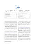 14 plant molecular systematics ACQUISITION OF MOLECULAR DATA . . . . . . . . . . . . . 585 MICROSATELLITE DNA . . . . . . . . . . . . . . . . . . . . . . . . . . . 593 DNA SEQUENCE DATA . . . . . . . . . . . . . . . . . . . . . . . . . . . 585 random amplified polymorphic dna (rapds) . . . . . . . . . . . . . . . . . . . . . . . . . . . . . . . . . . . . . . . . . 596 Polymerase Chain Reaction . . . . . . . . . . . . . . . . . . . . . . . . . . . . . . . 585 DNA Sequencing Reaction . . . . . . . . . . . . . . . . . . . . . . . . . . . . . . . 587 Types of DNA Sequence Data . . . . . . . . . . . . . . . . . . . . . . . . . . . . . 587 Analysis of DNA Sequence Data . . . . . . . . . . . . . . . . . . . . . . . . . . 590 AMPLIFIED FRAGMENT LENGTH POLYMORPHISM (AFLPs) . . . . . . . . . . . . . . . . . . . . . . . 596 REVIEW QUESTIONS . . . . . . . . . . . . . . . . . . . . . . . . . . . . . 600 RESTRICTION SITE ANALYSIS (RFLPs) . . . . . . . . . . . . . . 592 EXERCISES . . . . . . . . . . . . . . . . . . . . . . . . . . . . . . . . . . . . . . 600 ALLOZYMES . . . . . . . . . . . . . . . . . . . . . . . . . . . . . . . . . . . . . 593 REFERENCES FOR FURTHER STUDY . . . . . . . . . . . . . . . . 601 Molecular systematics encompasses a series of approaches in which phylogenetic relationships are inferred using information from macromolecules of the organisms under study. Specifically, the types of molecular data acquired include that from DNA sequences, DNA restriction sites, allozymes, microsatellites, RAPDs, and AFLPs. (The use of data from other, generally smaller molecules, such as secondary compounds in plants, is usually relegated to the field of “chemosystematics” and will not be reviewed here.) A revolution in inferring the phylogenetic relationships of life is occurring with the use of molecular data. The following is a review of the types of data, methods of acquisition, and methods of analysis of molecular systematics. in a container of silica gel. Alternatively, plant samples may be frozen or placed in concentrated extraction buffer. With any of these procedures, DNA is usually preserved intact. Usable DNA is often successfully isolated from dried herbarium sheets, attesting to the “toughness” of the molecule. DNA SEQUENCE DATA ACQUISITION OF MOLECULAR DATA Perhaps the most important method for inferring phylogenetic relationships of life is that of acquiring DNA sequences. DNA sequence data basically refers to the sequence of nucleotides (adenine = A, cytosine = C, guanine = G, or thymine = T; Figure 14.1) in a particular region of the DNA of a given taxon. Comparisons of homologous regions of DNA among the taxa under study yield the characters and character states that are used to infer relationships in phylogenetic analyses. The first step of acquiring DNA sequence data is to identify a particular region of DNA to be compared between species. Much prior research goes into identifying these regions and determining their efficacy in phylogenetic analysis. Plant samples from which DNA is to be isolated may be acquired by various means. It is vital to always collect a proper voucher specimen, properly mounted and accessioned in an accredited herbarium, to serve as documentation for any molecular systematic study (see Chapter 17). Live samples may be collected and immediately subjected to chemical processing, e.g., for allozyme analysis (see later discussion). For many DNA methods, pieces of leaves (from which chloroplast, mitochondrial, and nuclear DNA can be isolated) are removed from the live plant and immediately dried, typically © 2010 Elsevier Inc. All rights reserved. 10.1016/B978-0-12-374380-0.50014-2 POLYMERASE CHAIN REACTION 585 After a gene sequence of interest is identified, the DNA from a given plant sample is first isolated and purified by various 586 CHAPTER 14 Plant molecular systematics NH2 O = CH 3 N NH2 N HN N =O NH HN NH adenine NH HN NH N guanine = NH2 = N O O cytosine thymine Molecular structure of the four DNA nucleotides. Adenine and guanine are chemically similar purines; cytosine and thymine are chemically similar pyrimidines. Figure 14.1 chemical procedures. Following this, the DNA sequences of interest are amplified using the polymerase chain reaction (or PCR). The invention of this technology was crucial to modern DNA sequencing, as it permitted rapid and efficient DNA amplification, the replication of thousands of copies of DNA. The polymerase chain reaction work as follows (see Figure 14.2). Prior research establishes the occurrence of relatively short regions of DNA that flank (occur at each end of) the gene or DNA sequence of interest and that are both unique (not occurring elsewhere in the genome) and conserved (i.e., invariable) in all taxa to be investigated. repeat cycle sample DNA solution heated DNA denatures 3′ 5′ 5′ 3′ temperature lowered 3′ T-A-G-C-C-A-A-T-C-G-C-T ~ ~ T-T-A-A-T-C-G-A-G-G-T-T-A A-A-T-T-A-G-C-T-C-C-A-A-T 5′ A-T-C-G-G-T-T-A-G-C-G-A T-A-G-C-C-A-A-T-C-G-C-T ~ ~ 3′ T-T-A-A-T-C-G-A-G-G-T-T-A A-A-T-T-A-G-C-T-C-C-A-A-T 5′ 5′ A-T-C-G-G-T-T-A-G-C-G-A primers anneal to conserved regions DNA renatures 3′ 5′ A-T-C-G-G-T-T 3′ T-A-G-C-C-A-A-T-C-G-C-T ~ A-A-T-T-A-G-C-T-C-C-A-A-T 5′ A-T-C-G-G-T-T-A-G-C-G-A ~ 3′ T-T-A-A-T-C-G-A-G-G-T-T-A C-T-C-C-A-A-T 5′ 3′ 5′ DNA strands replicated 5′ 5′ A-T-C-G-G-T-T-A-G-C-G-A free nucleotides (catalyzed by DNA polymerase) bind to primers Figure 14.2 3′ T-A-G-C-C-A-A-T-C-G-C-T ~ A-A-T-T-A-G-C-T-C-C-A-A-T 5′ A-T-C-G-G-T-T-A-G-C-G-A ~ 3′ T-T-A-A-T-C-G-A-G-G-T-T-A A-A-T-T-A-G-C-T-C-C-A-A-T 5′ Polymerase chain reaction, using cycle sequencing to produce multiple copies of a stretch of DNA. 5′ Unit III Systematic evidence and descriptive terminology These short, conserved, flanking regions are used as a template for the synthesis of multiple, complementary copies, known as primers. Primers ideally are constructed such that they do not bind with one another. I