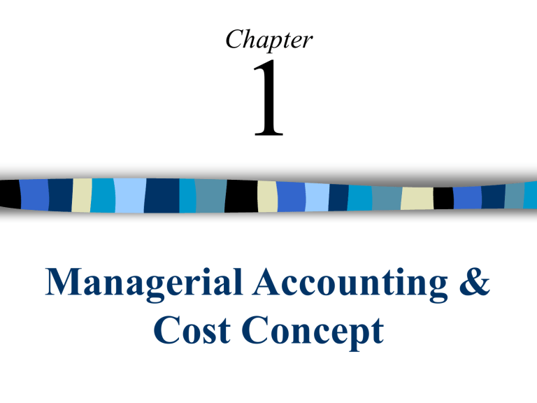 Chapter 1 Managerial Accounting & Cost Concept Managerial Accounting and Financial Accounting Managerial accounting provides information for managers of an organization who direct and control its operations. Irwin/McGraw-Hill 2 Financial accounting provides information to stockholders, creditors and others who are outside the organization. © The McGraw-Hill Companies, Inc., 2002 Work of Management Planning Directing and Motivating Controlling Irwin/McGraw-Hill 3 © The McGraw-Hill Companies, Inc., 2002 Planning and Control Cycle Formulating Long-and Short-Term Plans (Planning) Comparing Actual to Planned Performance (Controlling) Decision Making Begin Implementing the Plans (Directing and Motivating) Measuring Performance (Controlling) Irwin/McGraw-Hill 4 © The McGraw-Hill Companies, Inc., 2002 Differences Between Financial and Managerial Accounting Financial Accounting Managerial Accounting External persons who make financial decisions Managers who plan for and control an organization Historical perspective Future emphasis 3. Verifiability versus relevance Emphasis on verifiability Emphasis on relevance for planning and control 4. Precision versus timeliness Emphasis on precision Emphasis on timeliness 5. Subject Primary focus is on the whole organization Focuses on segments of an organization 6. Requirements Must follow GAAP and prescribed formats Need not follow GAAP or any prescribed format 1. Users 2. Time focus Irwin/McGraw-Hill 5 © The McGraw-Hill Companies, Inc., 2002 Cost Classifications Irwin/McGraw-Hill 6 © The McGraw-Hill Companies, Inc., 2002 Cost Classifications for Assigning Costs to Cost Objects DIRECT COST INDIRECT COST A cost that can be easily and A cost that cannot be easily and conveniently traced to a specified cost object. conveniently traced to a specified cost object. Examples: direct material and direct labor Example: manufacturing overhead If Adidas is assigning costs to its a Campbell Soup factory may various regional and national sales offices, then the salary of the sales manager in its Tokyo office would be a direct cost of that office. produce dozens of varieties of canned soups. The factory manager’s salary would be an indirect cost of a particular variety such as chicken noodle soup. Irwin/McGraw-Hill 7 © The McGraw-Hill Companies, Inc., 2002 Comparing Merchandising and Manufacturing Activities Merchandisers . . . Manufacturers . . . Buy finished goods. Buy raw materials. Sell finished goods. Produce and sell finished goods. MegaLoMart Irwin/McGraw-Hill 8 © The McGraw-Hill Companies, Inc., 2002 Cost Classifications for Manufacturing Companies Direct Materials Direct Labor Manufacturing Overhead The Product Irwin/McGraw-Hill 9 © The McGraw-Hill Companies, Inc., 2002 Direct Materials Those materials that become an integral part of the product and that can be conveniently traced directly to it. Example: An Airbag installed in an automobile Irwin/McGraw-Hill 10 © The McGraw-Hill Companies, Inc., 2002 Direct Labor Those labor costs that can be easily traced to individual units of product. Example: Wages paid to automobile assembly workers Irwin/McGraw-Hill 11 © The McGraw-Hill Companies, Inc., 2002 Manufacturing Overhead Manufacturing costs that cannot be traced directly to specific units produced. Examples: Indirect labor and indirect materials Wages paid to employees who are not directly involved in production work. Examples: maintenance workers, janitors and security guards. Irwin/McGraw-Hill 12 Materials used to support the production process. Examples: lubricants and cleaning supplies used in the automobile assembly plant. © The McGraw-Hill Companies, Inc., 2002 Classifications of Costs Manufacturing costs are often classified as follows: Direct Material Direct Labor Prime Cost Irwin/McGraw-Hill Manufacturing Overhead Conversion Cost 13 © The McGraw-Hill Companies, Inc., 2002 Nonmanufacturing Costs Marketing and selling costs . . . Costs necessary to get the order and deliver the product. Administrative costs . . . All executive, organizational, and clerical costs. Irwin/McGraw-Hill 14 © The McGraw-Hill Companies, Inc., 2002 Quick Check Which of the following costs would be considered manufacturing overhead at Boeing? (More than one answer may be correct.) A. Depreciation on factory forklift trucks. B. Sales commissions. C. The cost of a flight recorder in a Boeing 767. D. The wages of a production shift supervisor. Irwin/McGraw-Hill 15 © The McGraw-Hill Companies, Inc., 2002 Cost Classifications for Preparing Financial Statements Product costs include direct materials, direct labor, and manufacturing overhead. Inventory Period costs are not included in product costs. Such as advertising, rental cost, etc. They are expensed on the income statement. Cost of Good Sold Expense Income Statement Income Statement Sale Balance Sheet Irwin/McGraw-Hill 17 © The McGraw-Hill Companies, Inc., 2002 Quick Check Which of the following costs would be considered a period rather than a product cost in a manufacturing company? A. Manufacturing equipment depreciation. B. Property taxes on corporate headquarters. C. Direct materials costs. D. Electrical costs to light the production facility. Irwin/McGraw-Hill 18 © The McGraw-Hill Companies, Inc., 2002 Balance Sheet Merchandiser Manufacturer Current assets Current Assets Cash Cash Receivables Receivables Prepaid expenses Prepaid Expenses Merchandise inventory Inventories Raw Materials Work in Process Finished Goods Irwin/McGraw-Hill 20 © The McGraw-Hill Companies, Inc., 2002 Balance Sheet Merchandiser Manufacturer Current assets Current Assets Cash Cash Receivables Receivables Materials waiting to Prepaid expenses be processed. Prepaid Expenses Merchandise inventory Partially complete Inventories Raw Materials Work in Process Finished Goods products – some material, labor, or overhead has been added. Completed products awaiting sale. Irwin/McGraw-Hill 21 © The McGraw-Hill Companies, Inc., 2002 The Income