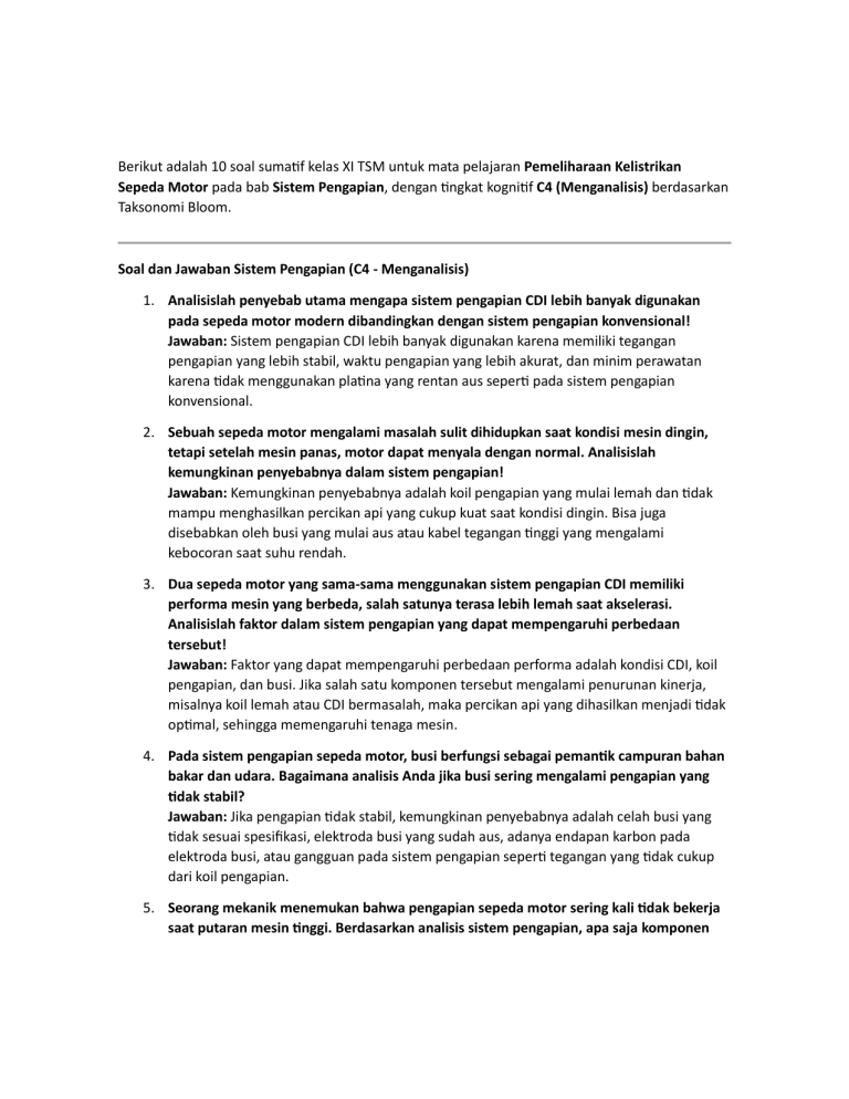 Berikut adalah 10 soal sumatif kelas XI TSM untuk mata pelajaran Pemeliharaan Kelistrikan Sepeda Motor pada bab Sistem Pengapian, dengan tingkat kognitif C4 (Menganalisis) berdasarkan Taksonomi Bloom. Soal dan Jawaban Sistem Pengapian (C4 - Menganalisis) 1. Analisislah penyebab utama mengapa sistem pengapian CDI lebih banyak digunakan pada sepeda motor modern dibandingkan dengan sistem pengapian konvensional! Jawaban: Sistem pengapian CDI lebih banyak digunakan karena memiliki tegangan pengapian yang lebih stabil, waktu pengapian yang lebih akurat, dan minim perawatan karena tidak menggunakan platina yang rentan aus seperti pada sistem pengapian konvensional. 2. Sebuah sepeda motor mengalami masalah sulit dihidupkan saat kondisi mesin dingin, tetapi setelah mesin panas, motor dapat menyala dengan normal. Analisislah kemungkinan penyebabnya dalam sistem pengapian! Jawaban: Kemungkinan penyebabnya adalah koil pengapian yang mulai lemah dan tidak mampu menghasilkan percikan api yang cukup kuat saat kondisi dingin. Bisa juga disebabkan oleh busi yang mulai aus atau kabel tegangan tinggi yang mengalami kebocoran saat suhu rendah. 3. Dua sepeda motor yang sama-sama menggunakan sistem pengapian CDI memiliki performa mesin yang berbeda, salah satunya terasa lebih lemah saat akselerasi. Analisislah faktor dalam sistem pengapian yang dapat mempengaruhi perbedaan tersebut! Jawaban: Faktor yang dapat mempengaruhi perbedaan performa adalah kondisi CDI, koil pengapian, dan busi. Jika salah satu komponen tersebut mengalami penurunan kinerja, misalnya koil lemah atau CDI bermasalah, maka percikan api yang dihasilkan menjadi tidak optimal, sehingga memengaruhi tenaga mesin. 4. Pada sistem pengapian sepeda motor, busi berfungsi sebagai pemantik campuran bahan bakar dan udara. Bagaimana analisis Anda jika busi sering mengalami pengapian yang tidak stabil? Jawaban: Jika pengapian tidak stabil, kemungkinan penyebabnya adalah celah busi yang tidak sesuai spesifikasi, elektroda busi yang sudah aus, adanya endapan karbon pada elektroda busi, atau gangguan pada sistem pengapian seperti tegangan yang tidak cukup dari koil pengapian. 5. Seorang mekanik menemukan bahwa pengapian sepeda motor sering kali tidak bekerja saat putaran mesin tinggi. Berdasarkan analisis sistem pengapian, apa saja komponen yang harus diperiksa? Jawaban: Komponen yang harus diperiksa meliputi CDI (kemungkinan ada gangguan pada kapasitor atau rangkaian elektroniknya), koil pengapian (kemungkinan lemah saat suhu tinggi), serta pick-up coil (kemungkinan sinyal ke CDI tidak stabil). 6. Ketika mesin sepeda motor hidup, tetapi terjadi misfire atau mesin terasa tersendatsendat saat akselerasi, bagaimana analisis Anda mengenai penyebab dari sistem pengapian? Jawaban: Penyebab misfire bisa berasal dari busi yang kotor atau aus, kabel tegangan tinggi yang bocor, koil pengapian yang lemah, atau pengaturan timing pengapian yang tidak tepat akibat sensor pick-up coil yang bermasalah. 7. Seorang pengguna sepeda motor mengalami konsumsi bahan bakar yang boros dan tenaga mesin terasa kurang. Jika dikaitkan dengan sistem pengapian, analisislah kemungkinan penyebabnya! Jawaban: Kemungkinan penyebabnya adalah busi yang sudah lemah atau kotor sehingga tidak dapat membakar campuran udara dan bahan bakar secara optimal, atau timing pengapian yang tidak sesuai sehingga pembakaran terjadi terlalu awal atau terlalu lambat, menyebabkan efisiensi bahan bakar menurun. 8. Sebuah sepeda motor yang menggunakan pengapian konvensional sering mengalami kendala mati mendadak setelah berjalan beberapa kilometer. Analisislah komponen mana yang kemungkinan menjadi penyebabnya! Jawaban: Penyebab utama bisa berasal dari platina yang sudah aus atau mengalami perubahan celah sehingga percikan api menjadi lemah, kondensor yang lemah sehingga pengapian tidak stabil, atau koil pengapian yang mengalami overheat. 9. Sistem pengapian CDI memiliki dua jenis, yaitu AC-CDI dan DC-CDI. Bagaimana analisis Anda dalam menentukan jenis CDI yang digunakan pada sepeda motor tertentu? Jawaban: AC-CDI menggunakan arus langsung dari spul, sementara DC-CDI mendapatkan arus dari aki. Untuk mengetahui jenis CDI yang digunakan, dapat dilihat dari sumber arus yang masuk ke CDI. Jika mesin bisa hidup tanpa aki, kemungkinan besar menggunakan ACCDI. Jika aki lemah dan motor tidak bisa hidup, kemungkinan menggunakan DC-CDI. 10. Seorang teknisi ingin meningkatkan performa sepeda motor dengan memodifikasi sistem pengapian. Analisislah langkah-langkah apa saja yang dapat dilakukan agar hasilnya optimal tanpa merusak komponen mesin lainnya! Jawaban: Langkah yang bisa dilakukan antara lain menggunakan busi dengan spesifikasi lebih tinggi, mengganti koil pengapian dengan yang memiliki output tegangan lebih besar, menggunakan CDI racing yang memiliki kurva pengapian lebih optimal, serta memastikan kabel tegangan tinggi dalam kondisi baik untuk menghindari kebocoran arus. Soal-soal ini dirancang agar siswa mampu menganalisis masalah dan mencari solusi yang berkaitan dengan sistem pengapian sepeda motor, sesuai dengan level C4 (Menganalisis) dalam Taksonomi Bloom. Semoga bermanfaat! 🚀