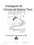 Investigación de Ciencias del Sistema Tierra Una Investigación de Aprendizaje GLOBE GLOBE® 2005 Bienvenida 1 ® Ciencias del Sistema Tierra Investigación de Ciencias del Sistema Tierra Protocolos Mediciones Estacionales Periódicas Básicas Apertura de las Yemas Mediciones Estacionales Bisemanales Básicas Foliación Senescencia de las Hojas Mediciones Opcionales Colibríes de Garganta Rubí (Diario o Bisemanal) Jardines Fenológicos (Diario o Bisemanal) Secuencia de Actividades Sugeridas • Leer la Introducción para familiarizarse con las estaciones, la fenología y el estudio de Ciencias del Sistema Tierra , en sus diferentes espacios y escalas de tiempo. • Con respecto al Protocolo de Jardines Fenológicos, la mejor época para sembrar su jardin es primavera u otoño. Debe esperar un año para recoger los datos. • Las actividades de aprendizaje Qué Podemos Aprender Acerca de Nuestras Estaciones, Cuáles son los Factores que Afectan los Patrones Estacionales, Cómo Varian los Patrones de Temperatura Estacionales entre Diferentes Regiones del Mundo, muestran a los estudiantes las características y los patrones de las estaciones. • Las actividades de Aprendizaje Cartas Indicadoras de la Foliación, Un Vistazo Preliminar a la Apertura de las Yemas, y Un Primer Vistazo a la Fenología, preparan el escenario para realizar mediciones de fenología. • Elegir uno de los Protocolos de Fenología (Senescencia de las Hojas o Colibríes en otoño; Apertura de las Yemas, Foliación, o Colibríes para la primavera; Jardines Fenológicos durante todo el año. • Las actividades de Aprendizaje Introducción a la Fotosíntesis e Investigación de los Pigmentos de las Hojas ayudan a los estudiantes a tener una mayor comprensión acerca del proceso de fotosíntesis. • Patrones Globales en La Foliación y en la Senescencia de las Hojas , y Factores Restrictivo en los Ecosistemas, permiten a los estudiantes explorar tendencias globales en la Folaición y en la Senescencia de las Hojas , y examinar por qué estos patrones se dan en diferentes ecosistemas. •Las actividades de aprendizaje Interpretando las Razones para el Cambio Estacional y Cambio Estacional sobre la Tierra y el Agua, ayudan a los estudiantes a entender los factores que originan los patrones estacionales • Las actividades de aprendizaje, Relacionando las Partes del Sitio de Estudio, Representación del Sitio de Estudio en un Diagrama, Utilización de Gráficos para Mostrar Conexiones s, Diagramando el l Sitio de Estudio para Otros,y Comparación de los Sitios de Estudio en Diferente Regiones , permiten a los estudiantes examinar las relaciones del sistema terrestre a escala local. • Las actividades de aprendizaje Definiendo los Límites Regionales y Efectos de los Aportes y de las Pérdidas en una Región, permiten a los estudiantes investigar las relaciones del sistema terrestre a escala regional • Las actividades de aprendizaje De Relaciones Regionales a s Relaciones Globales y Los Componentes del Sistema Terrestre Trabajando Juntos, permiten a los estudiantes investigar las relaciones del sistema terrestre a escala global GLOBE® 2005 Bienvenida – 2 Ciencias del Sistema Tierra Tabla de Contenidos Introducción* ¿Por qué estudiar las Ciencias de la Tierra?................................ Introducción 1 La Gran Imagen* ....................................................................... Introducción 2 La Tierra como Sistema*............................................................. Introduction 9 El Ciclo Estacional ................................................................ Introduction 9 El Sistema Tierra a Través del Ciclo Estacional*.......................... Introduction 17 El Sistema Tierra a Diferentes Escalas Espaciales……................. Introduction 28 . Protocolos de Fenología Introducción Protocolo de Apertura de Yemas Protocolo de Foliación Protocolo de Senescencia Foliar Protocolo del Colibrí de Garganta Rubí** Protocolo de Fenología de Lilas * Protocolo de Jardines Fenológicos** Protocolo de Fenología de Reproducción de las Algas* Protocolo de Observación de la Migración de las Aves del Artico. Actividades de Aprendizaje: Estaciones y Fenología* Introducción* Estaciones* Introducción a las Estaciones y a la Fenología* S1: ¿Qué Podemos Aprender sobre Nuestras Estaciones?* S2: ¿Cuáles son Algunos de los Factores que Afectan los patrones Estacionales? S3: ¿Cómo Varían los Patrones Estacionales de Temperatura entre las Diferentes Regiones del Mundo? S4: Interpretando las Razones para el Cambio Estacional S5: Cambio Estacional sobre la Tierra y el Agua * Fenología* P1: Cartas Indicadoras de la Foliación* P2: Vistazo Preliminar a la Apertura de las Yemas* P3: Un Primer Vistazo a la Fenología * P4: Introducción a la Fotosíntesis* P5: Investigación de los Pigmentos de las Hojas * P6: Patrones Globales en la Foliación y la Senescencia de las Hojas * P7: Factores restrictivos en los ecosistemas * * Vease la version electrónica completa de la Guía del Profesor, disponible en la Web de GLOBE y CD-ROM. ** Versión impresa disponible bajo petición de los centros escolares, en las áreas donde estos protocolos se pueden llevar a cabo. El protocolo y todo el material relacionado, están disponibles en la versión electrónica de la Guía del Profesor, en Web de GLOBE y en CD-ROM. GLOBE® 2005 Bienvenida – 3 Ciencias del Sistema Tierra Actividades de Aprendizaje: Investigando las Relaciones* Introducción* Relaciones Locales* LC1: Relacionando las Partes del Sitio de Estudio* LC2: Repesentando el Sitio de Estudio en un Diagrama* LC3: Utilizando Gráficos para Mostrar Relaciones* LC4: Realizando Diagramas del Sitio de Estudio para Otros* LC4: Comparando el Sitio de Estudio con Uno de otra Region * Relaciones Regionales* RC1: Definiendo Límites Regionales* RC2: Efectos de los Aportes y las Pérdidas de una Región * Relaciones Globales* GC1: La Relación Regiona