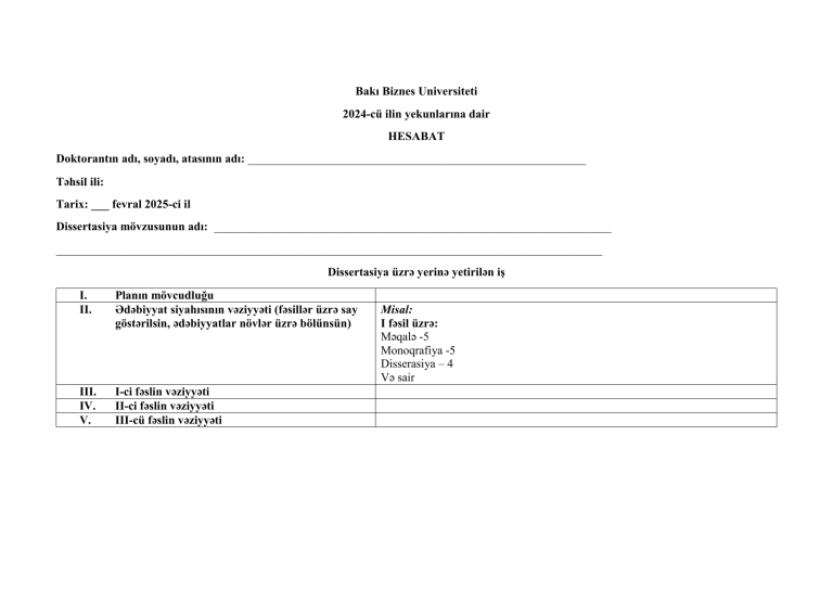 Bakı Biznes Universiteti 2024-cü ilin yekunlarına dair HESABAT Doktorantın adı, soyadı, atasının adı: _________________________________________________________ Təhsil ili: Tarix: ___ fevral 2025-ci il Dissertasiya mövzusunun adı: ___________________________________________________________________ ____________________________________________________________________________________________ Dissertasiya üzrə yerinə yetirilən iş I. II. Planın mövcudluğu Ədəbiyyat siyahısının vəziyyəti (fəsillər üzrə say göstərilsin, ədəbiyyatlar növlər üzrə bölünsün) III. IV. V. I-ci fəslin vəziyyəti II-ci fəslin vəziyyəti III-cü fəslin vəziyyəti Misal: I fəsil üzrə: Məqalə -5 Monoqrafiya -5 Disserasiya – 4 Və sair Məqalə və tezislər № Məqalənin adı Ölkədaxilində nəşr edilmiş məqalələr Nəşr olunduğu mənbə Link Xaricdə nəşr edilmiş məqalələr № Məqalənin adı Nəşr olunduğu mənbə Link Ölkədaxilində nəşr edilmiş tezislər № Məqalənin adı Nəşr olunduğu mənbə Link Xaricdə nəşr edilmiş tezislər № Məqalənin adı Nəşr olunduğu mənbə Link Minimum imtahanları barədə məlumat İmtahanın adı İmtahanın tarixi Doktorantın imzası: A.S.A. ______________________________________ İmza: _______________________________________ Elmi rəhbərin (elmi məsləhətçinin imzası): A.S.A. ______________________________________ İmza: _______________________________________ QEYD: materialları çap edilmiş formada təqdim edin hesabata əlavə edərək (plan, dissertasiya, məqalə və tezislər jurnallardan kseroks).