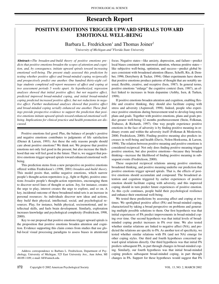 PSYCHOLOGICAL SCIENCE Research Report POSITIVE EMOTIONS TRIGGER UPWARD SPIRALS TOWARD EMOTIONAL WELL-BEING Barbara L. Fredrickson1 and Thomas Joiner2 1 University of Michigan and 2Florida State University Abstract—The broaden-and-build theory of positive emotions predicts that positive emotions broaden the scopes of attention and cognition, and, by consequence, initiate upward spirals toward increasing emotional well-being. The present study assessed this prediction by testing whether positive affect and broad-minded coping reciprocally and prospectively predict one another. One hundred thirty-eight college students completed self-report measures of affect and coping at two assessment periods 5 weeks apart. As hypothesized, regression analyses showed that initial positive affect, but not negative affect, predicted improved broad-minded coping, and initial broad-minded coping predicted increased positive affect, but not reductions in negative affect. Further mediational analyses showed that positive affect and broad-minded coping serially enhanced one another. These findings provide prospective evidence to support the prediction that positive emotions initiate upward spirals toward enhanced emotional wellbeing. Implications for clinical practice and health promotion are discussed. Positive emotions feel good. Plus, the balance of people’s positive and negative emotions contributes to judgments of life satisfaction (Diener & Larsen, 1993). Are these the only reasons people should care about positive emotions? We think not. We propose that positive emotions not only feel good in the present, but also increase the likelihood that one will feel good in the future. That is, we suggest that positive emotions trigger upward spirals toward enhanced emotional wellbeing. This prediction stems from a new perspective on positive emotions offered within Fredrickson’s (1998, 2001) broaden-and-build theory. This model posits that, unlike negative emotions, which narrow people’s thought-action repertoires (e.g., fight or flight), positive emotions broaden people’s thought-action repertoires, encouraging them to discover novel lines of thought or action. Joy, for instance, creates the urge to play, interest creates the urge to explore, and so on. A key, incidental outcome of these broadened mind-sets is an increase in personal resources: As individuals discover new ideas and actions, they build their physical, intellectual, social, and psychological resources. Play, for instance, builds physical, socioemotional, and intellectual skills, and fuels brain development. Similarly, exploration increases knowledge and psychological complexity (Fredrickson, 1998, 2000). Key to our proposal that positive emotions trigger upward spirals is the proposition that positive emotions broaden attention and cognition. Evidence supporting this claim comes from studies that use global-local visual processing paradigms to assess biases in attentional Address correspondence to Barbara L. Fredrickson, Department of Psychology, University of Michigan, 525 East University Ave., Ann Arbor, MI 48109-1109; e-mail: blf@umich.edu. 172 Copyright © 2002 American Psychological Society focus. Negative states—like anxiety, depression, and failure—predict local biases consistent with narrowed attention, whereas positive states— like subjective well-being, optimism, and success—predict global biases consistent with broadened attention (Basso, Schefft, Ris, & Dember, 1996; Derryberry & Tucker, 1994). Other experiments have shown that positive emotions produce patterns of thought that are notably unusual, flexible, creative, and receptive (Isen, 1987). In general terms, positive emotions “enlarge” the cognitive context (Isen, 1987), an effect linked to increases in brain dopamine (Ashby, Isen, & Turken, 1999). If positive emotions broaden attention and cognition, enabling flexible and creative thinking, they should also facilitate coping with stress and adversity (Aspinwall, 1998). Indeed, people who experience positive emotions during bereavement tend to develop long-term plans and goals. Together with positive emotions, plans and goals predict greater well-being 12 months postbereavement (Stein, Folkman, Trabasso, & Richards, 1997). One way people experience positive emotions in the face of adversity is by finding positive meaning in ordinary events and within the adversity itself (Folkman & Moskowitz, 2000; Fredrickson, 2000). Finding positive meaning also predicts increases in well-being and health (Davis, Nolen-Hoeksema, & Larson, 1998). The relation between positive meaning and positive emotions is considered reciprocal: Not only does finding positive meaning trigger positive emotion, but also positive emotions—because they broaden thinking—increase the likelihood of finding positive meaning in subsequent events (Fredrickson, 2000). These suspected reciprocal relations among positive emotions, broadened thinking, and positive meaning underlie our prediction that positive emotions trigger upward spirals. That is, the effects of positive emotions should accumulate and compound: The broadened attention and cognition triggered by earlier experiences of positive emotion should facilitate coping with adversity, and this improved coping should in turn predict future experiences of positive emotion. As this cycle continues, people build their psychological resilience and enhance their emotional well-being. We tested these predictions by assessing affect and coping at two times. We spotlighted positive affect (PA) and broad-minded coping, characterized by taking a broad perspective on problems and generating multiple possible solutions to them. Our first hypothesis was that initial experiences of PA predict improvements in broad-minded coping over time. Our second hypothesis was that initial levels of broadminded coping predict increases in PA over time. We also tested whether similar relations are linked to negative af
