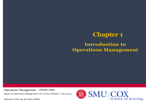 Introduction to Operations Management Operations Management – ITOM 3306 Based on Operations Management (14th ed.) by William J. Stevenson Instructor: Nils Van den Steen (PhD) 1-1 Introduction Transformational process Supply chain management Why study OM? What does an OM do? Processes Systems Tools for decision making Introduction What is operations? The part of a business organization that is responsible for creating goods or providing services How to define operations management? The management of processes or systems that create goods and/or provide services Introduction Good – A physical* item that includes raw materials, parts, subassemblies, and final products. Examples include cars, 3D printers, cornflakes, gym equipment… Service – An activity that delivers value in terms of location, time, transformation or phycological impact. Examples include hairdressing, financial advisory, cleaning,… Good Service Characteristic Goods Services Scalability Easier More difficult Typically, yes Typically, no Usable over a long time Consumed at point of delivery Easy Difficult Ownership Transferrable Not transferrable Location Can be produced and sold at different locations Production and consumption at the same place Degree of customer contact Low High Uniformity of input High Low Measurement of productivity Easy Difficult Ability to store in inventory High Low Ability to patent High Low Returns & Warranty Durability Correct problems before delivery Good Service Products are typically neither purely service- or purely goods Goods Services Surgery, Teaching Songwriting, Software Development Computer Repair, Restaurant Meal Home Remodeling, Retail Sales Automobile Assembly, Steelmaking Good Service Servitization – The transformation of a company's strategy from selling products to offering integrated product and service solutions, enhancing value and customer relationships. Product as a Service (PaaS) – A business model where products are provided as services, involving subscriptions or leases, emphasizing longterm customer engagement and often also environmental sustainability. Everything as a service (XaaS) – Delivering various products and services over the internet, transforming traditional business models to subscriptionbased, on-demand solutions, enhancing flexibility and scalability. Transformation Process Outputs •Goods •Services Transformation Process Value-Added Inputs •Land / Resources •Labor •Capital •Information Transformation/ Conversion Process Outputs •Goods •Services Measurement and Feedback Measurement and Feedback Control Measurement and Feedback Feedback = Measurements taken at various points in the transformation process Control = The comparison of feedback against previously established standards to determine if corrective action is needed Supply Chain Management Supply Chain Management A sequence of activities and organizations involved in producing and delivering a good or service Suppliers’ suppliers Direct suppliers Producer Distributor Final customers Supply Chain Management A firm that does not adequately manage its supply chain can experience issues such as Oscillating inventory levels Inventory stockouts Late deliveries Quality problems Operations Management What is operations? The part of a business organization that is responsible for producing goods or services What is operations management? The management of processes or systems that create goods and/or provide services Introduction Transformational process Supply chain management Why study OM? What does an OM do? Processes Systems Tools for decision making Functional Departments Organization Marketing and sales Operations Finance Functional Departments Functional Departments Finance & operations Budgeting Economic analysis of investment proposals Provision/distribution of funds Marketing & operations Demand data Product and service design Competitor analysis Lead time data Functional Departments Accounting & operations Costing and pricing strategies: applying knowledge of operations to develop precise costing methods and pricing strategies that reflect the true cost of production, leading to better financial planning and profitability analysis.. Inventory Management: Gaining insights into inventory management practices to accurately account for inventory levels, reduce holding costs, and minimize obsolescence, which impacts the financial health of the company. Real estate & operations Operational due diligence: Evaluating the feasibility of construction projects by understanding operational requirements, ensuring that the projects are viable and sustainable from both a financial and logistical perspective.. Efficient property maintenance: Utilizing operations management principles to streamline maintenance processes, reduce costs, and enhance the longevity and value of properties. Optimizing the use of space: Applying operations management techniques to maximize the efficient use of space in real estate developments, leading to better-designed, more functional, and profitable properties. Investment banking & operations Operational due diligence during mergers and acquisitions OM knowledge can help to assess the efficiency and sustainability of a target company's operations. This helps in identifying potential risks and synergies. Valuation accuracy: understanding the operational metrics that drive a company's performance, such as production capacity, supply chain efficiency, and inventory management, leads to more accurate company valuations and investment decisions. Functional Departments Lawyers & operations Enhanced legal council: Knowledge of operations management will help with advising clients on the practical impact of legal contracts and agreements, ensuring that these documents are realistic and enforceable. Regulatory compliance: A solid understanding of how operational processes can be brought in alignment with legal standards and regulations will help guide businesses 