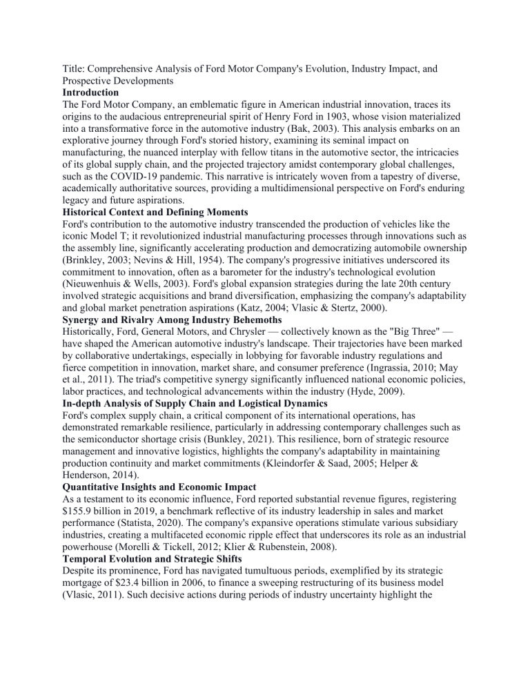 Title: Comprehensive Analysis of Ford Motor Company's Evolution, Industry Impact, and Prospective Developments Introduction The Ford Motor Company, an emblematic figure in American industrial innovation, traces its origins to the audacious entrepreneurial spirit of Henry Ford in 1903, whose vision materialized into a transformative force in the automotive industry (Bak, 2003). This analysis embarks on an explorative journey through Ford's storied history, examining its seminal impact on manufacturing, the nuanced interplay with fellow titans in the automotive sector, the intricacies of its global supply chain, and the projected trajectory amidst contemporary global challenges, such as the COVID-19 pandemic. This narrative is intricately woven from a tapestry of diverse, academically authoritative sources, providing a multidimensional perspective on Ford's enduring legacy and future aspirations. Historical Context and Defining Moments Ford's contribution to the automotive industry transcended the production of vehicles like the iconic Model T; it revolutionized industrial manufacturing processes through innovations such as the assembly line, significantly accelerating production and democratizing automobile ownership (Brinkley, 2003; Nevins & Hill, 1954). The company's progressive initiatives underscored its commitment to innovation, often as a barometer for the industry's technological evolution (Nieuwenhuis & Wells, 2003). Ford's global expansion strategies during the late 20th century involved strategic acquisitions and brand diversification, emphasizing the company's adaptability and global market penetration aspirations (Katz, 2004; Vlasic & Stertz, 2000). Synergy and Rivalry Among Industry Behemoths Historically, Ford, General Motors, and Chrysler — collectively known as the "Big Three" — have shaped the American automotive industry's landscape. Their trajectories have been marked by collaborative undertakings, especially in lobbying for favorable industry regulations and fierce competition in innovation, market share, and consumer preference (Ingrassia, 2010; May et al., 2011). The triad's competitive synergy significantly influenced national economic policies, labor practices, and technological advancements within the industry (Hyde, 2009). In-depth Analysis of Supply Chain and Logistical Dynamics Ford's complex supply chain, a critical component of its international operations, has demonstrated remarkable resilience, particularly in addressing contemporary challenges such as the semiconductor shortage crisis (Bunkley, 2021). This resilience, born of strategic resource management and innovative logistics, highlights the company's adaptability in maintaining production continuity and market commitments (Kleindorfer & Saad, 2005; Helper & Henderson, 2014). Quantitative Insights and Economic Impact As a testament to its economic influence, Ford reported substantial revenue figures, registering $155.9 billion in 2019, a benchmark reflective of its industry leadership in sales and market performance (Statista, 2020). The company's expansive operations stimulate various subsidiary industries, creating a multifaceted economic ripple effect that underscores its role as an industrial powerhouse (Morelli & Tickell, 2012; Klier & Rubenstein, 2008). Temporal Evolution and Strategic Shifts Despite its prominence, Ford has navigated tumultuous periods, exemplified by its strategic mortgage of $23.4 billion in 2006, to finance a sweeping restructuring of its business model (Vlasic, 2011). Such decisive actions during periods of industry uncertainty highlight the dynamic nature of market forces and the necessity for corporate agility and strategic foresight (Gartman, 1994; Maxwell & Rothenberg, 1993). Anticipating the Horizon: Innovations and Challenges In anticipation of a paradigm shift, Ford commits to an electrified future, with a pledge of $11 billion to pioneer new electric and hybrid models, further cementing its dedication to innovation and environmental stewardship (Dawson, 2019; Westbrook, 2017). This transformative vision aligns with global environmental imperatives and consumer trends, illustrating Ford's responsiveness to macroeconomic and social exigencies (Sierzchula et al., 2014). The COVID-19 pandemic, a global crisis, precipitated unprecedented operational and supply chain disruptions, necessitating innovative approaches to business continuity, such as digital showrooms and enhanced remote work policies (Taub, 2020; Nagy et al., 2021). Industry experts posit that Ford's strategic alliance with tech giants, evidenced by its collaboration with Google, heralds an era where automotive ingenuity converges with advanced technology, potentially redefining mobility (Naughton, 2021; Hackett, 2020). Conclusion Ford Motor Company's epic journey from its inception to its current status as an industry stalwart is a compelling narrative of innovation, resilience, and strategic evolution. Its historical milestones, economic impact, and visionary leadership have influenced the automotive industry's contours. Facing contemporary global challenges and the industry's technological renaissance, Ford's pivot towards electrification, digital transformation, and strategic alliances positions it as a pioneering architect of the automotive future. Its legacy and future endeavors offer invaluable insights into the dynamics of maintaining industrial preeminence within a perpetually evolving global landscape. References 1. Bak, R. (2003). Henry and Edsel: The Creation of the Ford Empire. Wiley. 2. Brinkley, D. (2003). Wheels for the World: Henry Ford, His Company, and a Century of Progress. Penguin. 3. Bunkley, N. (2021). Chip shortage forces more cuts. Automotive News. 4. Dawson, C. (2019). Ford accelerates electric vehicle plan—the Wall Street Journal. 5. Gartman, D. (1994). Auto Slavery: The Labor Process in the American Automobile Industry, 1897-1950. Rutgers University Press. 6. Hackett, J. (202