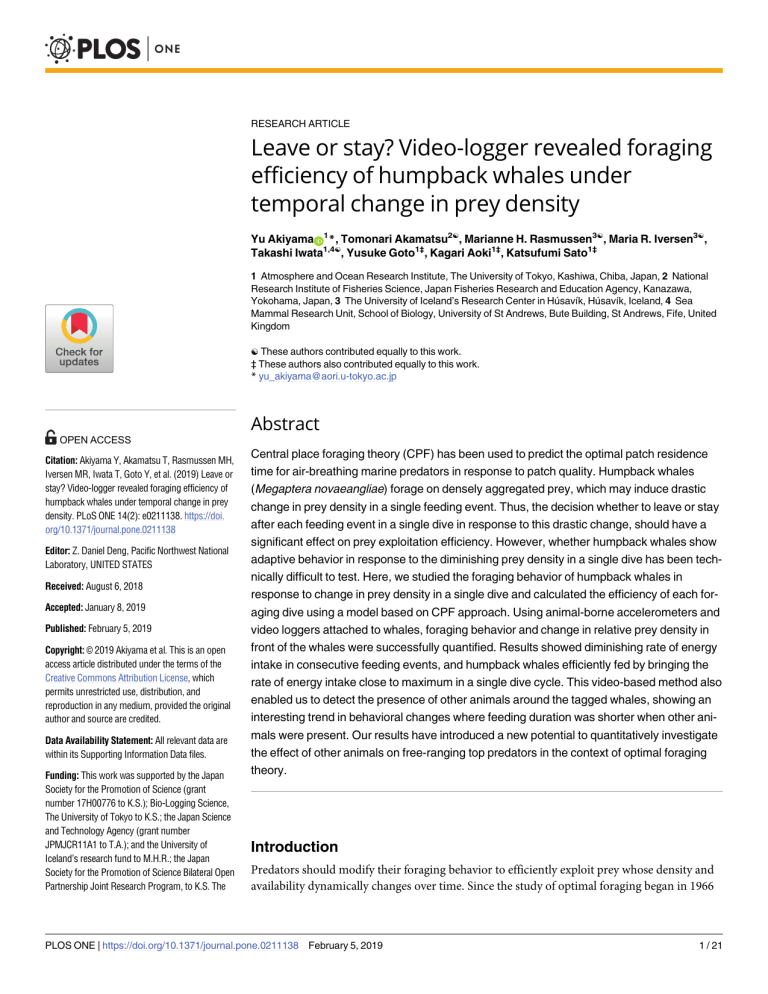 RESEARCH ARTICLE Leave or stay? Video-logger revealed foraging efficiency of humpback whales under temporal change in prey density Yu Akiyama ID1*, Tomonari Akamatsu2☯, Marianne H. Rasmussen3☯, Maria R. Iversen3☯, Takashi Iwata1,4☯, Yusuke Goto1‡, Kagari Aoki1‡, Katsufumi Sato1‡ a1111111111 a1111111111 a1111111111 a1111111111 a1111111111 1 Atmosphere and Ocean Research Institute, The University of Tokyo, Kashiwa, Chiba, Japan, 2 National Research Institute of Fisheries Science, Japan Fisheries Research and Education Agency, Kanazawa, Yokohama, Japan, 3 The University of Iceland’s Research Center in Húsavı́k, Húsavı́k, Iceland, 4 Sea Mammal Research Unit, School of Biology, University of St Andrews, Bute Building, St Andrews, Fife, United Kingdom ☯ These authors contributed equally to this work. ‡ These authors also contributed equally to this work. * yu_akiyama@aori.u-tokyo.ac.jp Abstract OPEN ACCESS Citation: Akiyama Y, Akamatsu T, Rasmussen MH, Iversen MR, Iwata T, Goto Y, et al. (2019) Leave or stay? Video-logger revealed foraging efficiency of humpback whales under temporal change in prey density. PLoS ONE 14(2): e0211138. https://doi. org/10.1371/journal.pone.0211138 Editor: Z. Daniel Deng, Pacific Northwest National Laboratory, UNITED STATES Received: August 6, 2018 Accepted: January 8, 2019 Published: February 5, 2019 Copyright: © 2019 Akiyama et al. This is an open access article distributed under the terms of the Creative Commons Attribution License, which permits unrestricted use, distribution, and reproduction in any medium, provided the original author and source are credited. Data Availability Statement: All relevant data are within its Supporting Information Data files. Funding: This work was supported by the Japan Society for the Promotion of Science (grant number 17H00776 to K.S.); Bio-Logging Science, The University of Tokyo to K.S.; the Japan Science and Technology Agency (grant number JPMJCR11A1 to T.A.); and the University of Iceland’s research fund to M.H.R.; the Japan Society for the Promotion of Science Bilateral Open Partnership Joint Research Program, to K.S. The Central place foraging theory (CPF) has been used to predict the optimal patch residence time for air-breathing marine predators in response to patch quality. Humpback whales (Megaptera novaeangliae) forage on densely aggregated prey, which may induce drastic change in prey density in a single feeding event. Thus, the decision whether to leave or stay after each feeding event in a single dive in response to this drastic change, should have a significant effect on prey exploitation efficiency. However, whether humpback whales show adaptive behavior in response to the diminishing prey density in a single dive has been technically difficult to test. Here, we studied the foraging behavior of humpback whales in response to change in prey density in a single dive and calculated the efficiency of each foraging dive using a model based on CPF approach. Using animal-borne accelerometers and video loggers attached to whales, foraging behavior and change in relative prey density in front of the whales were successfully quantified. Results showed diminishing rate of energy intake in consecutive feeding events, and humpback whales efficiently fed by bringing the rate of energy intake close to maximum in a single dive cycle. This video-based method also enabled us to detect the presence of other animals around the tagged whales, showing an interesting trend in behavioral changes where feeding duration was shorter when other animals were present. Our results have introduced a new potential to quantitatively investigate the effect of other animals on free-ranging top predators in the context of optimal foraging theory. Introduction Predators should modify their foraging behavior to efficiently exploit prey whose density and availability dynamically changes over time. Since the study of optimal foraging began in 1966 PLOS ONE | https://doi.org/10.1371/journal.pone.0211138 February 5, 2019 1 / 21 Leave or stay? Foraging efficiency of humpback whales under temporal change in prey density funders had no role in study design, data collection and analysis, decision to publish, or preparation of the manuscript. Competing interests: The authors have declared that no competing interests exist. [1, 2], various theories have been developed to predict the foraging decision of animals. These theories in general assumes that, as animal forage in a small-scale patch, the density of prey in the patch decreases over time, thus the rate of energy intake diminishes (diminishing return). Under this assumption, the optimal forging theory predicts the timing when the animal should stop feeding and leave the patch to maximize the energy intake (or certain currency) per unit time with minimum cost [3–5]. While many empirical tests in laboratories or carefully controlled field experiments have been performed supporting these theories [6], such studies were mostly restricted to terrestrial or captive animals that move in a relatively small area where visual observation can be conducted. Great progress has been made over the last couple of years, with respect to the development of methods using electronic tags, that has enabled us to observe the behavior of predators and detect prey capture events using animal-borne accelerometer data, together with a camera or a video logger [7, 8], or an accelerometer data attached to the jaw or the head of a predator [9]. These developments have introduced a new era in the field of animal foraging studies, by enabling detailed tests for predictions of foraging theories in various free-ranging animals, especially air-breathing marine predators that are nearly impossible to directly observe [10– 14]. Air-breathing marine predators, such as seabirds, marine turtles, and marine mammals, are considered “central place foragers,” [15] due to their need to surface (central place) b