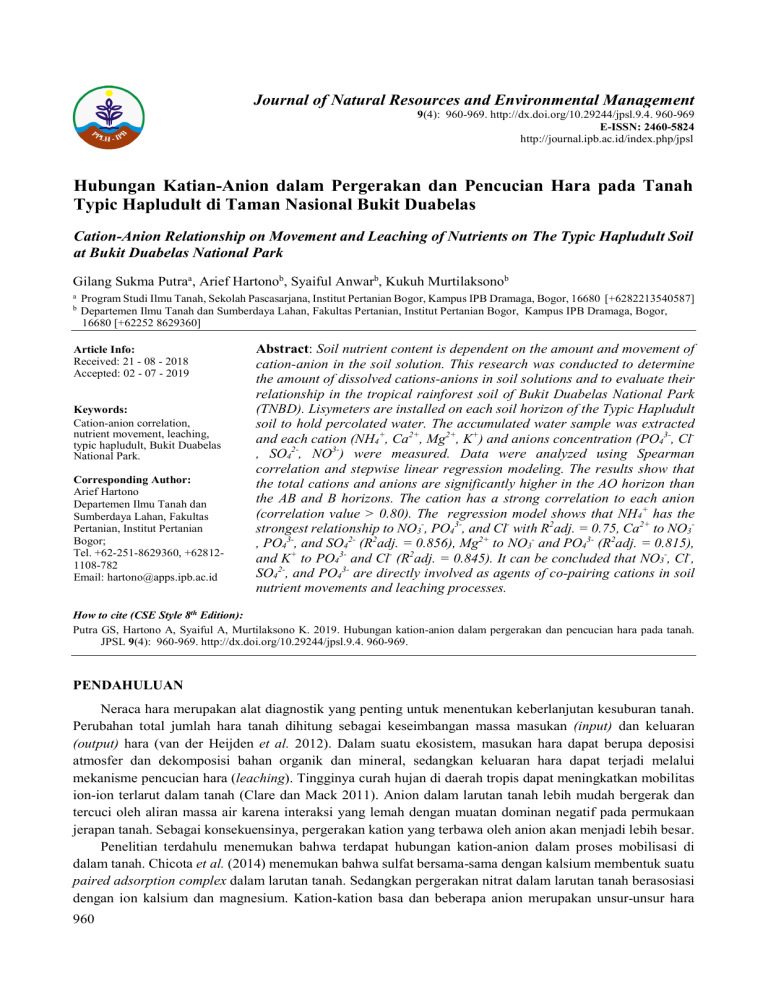 Journal of Natural Resources and Environmental Management 9(4): 960-969. http://dx.doi.org/10.29244/jpsl.9.4. 960-969 E-ISSN: 2460-5824 http://journal.ipb.ac.id/index.php/jpsl Hubungan Katian-Anion dalam Pergerakan dan Pencucian Hara pada Tanah Typic Hapludult di Taman Nasional Bukit Duabelas Cation-Anion Relationship on Movement and Leaching of Nutrients on The Typic Hapludult Soil at Bukit Duabelas National Park Gilang Sukma Putraa, Arief Hartonob, Syaiful Anwarb, Kukuh Murtilaksonob a Program Studi Ilmu Tanah, Sekolah Pascasarjana, Institut Pertanian Bogor, Kampus IPB Dramaga, Bogor, 16680 [+6282213540587] b Departemen Ilmu Tanah dan Sumberdaya Lahan, Fakultas Pertanian, Institut Pertanian Bogor, Kampus IPB Dramaga, Bogor, 16680 [+62252 8629360] Article Info: Received: 21 - 08 - 2018 Accepted: 02 - 07 - 2019 Keywords: Cation-anion correlation, nutrient movement, leaching, typic hapludult, Bukit Duabelas National Park. Corresponding Author: Arief Hartono Departemen Ilmu Tanah dan Sumberdaya Lahan, Fakultas Pertanian, Institut Pertanian Bogor; Tel. +62-251-8629360, +628121108-782 Email: hartono@apps.ipb.ac.id Abstract: Soil nutrient content is dependent on the amount and movement of cation-anion in the soil solution. This research was conducted to determine the amount of dissolved cations-anions in soil solutions and to evaluate their relationship in the tropical rainforest soil of Bukit Duabelas National Park (TNBD). Lisymeters are installed on each soil horizon of the Typic Hapludult soil to hold percolated water. The accumulated water sample was extracted and each cation (NH4+, Ca2+, Mg2+, K+) and anions concentration (PO43-, Cl, SO42-, NO3-) were measured. Data were analyzed using Spearman correlation and stepwise linear regression modeling. The results show that the total cations and anions are significantly higher in the AO horizon than the AB and B horizons. The cation has a strong correlation to each anion (correlation value > 0.80). The regression model shows that NH4+ has the strongest relationship to NO3-, PO43-, and Cl- with R2adj. = 0.75, Ca2+ to NO3, PO43-, and SO42- (R2adj. = 0.856), Mg2+ to NO3- and PO43- (R2adj. = 0.815), and K+ to PO43- and Cl- (R2adj. = 0.845). It can be concluded that NO3-, Cl-, SO42-, and PO43- are directly involved as agents of co-pairing cations in soil nutrient movements and leaching processes. How to cite (CSE Style 8th Edition): Putra GS, Hartono A, Syaiful A, Murtilaksono K. 2019. Hubungan kation-anion dalam pergerakan dan pencucian hara pada tanah. JPSL 9(4): 960-969. http://dx.doi.org/10.29244/jpsl.9.4. 960-969. PENDAHULUAN Neraca hara merupakan alat diagnostik yang penting untuk menentukan keberlanjutan kesuburan tanah. Perubahan total jumlah hara tanah dihitung sebagai keseimbangan massa masukan (input) dan keluaran (output) hara (van der Heijden et al. 2012). Dalam suatu ekosistem, masukan hara dapat berupa deposisi atmosfer dan dekomposisi bahan organik dan mineral, sedangkan keluaran hara dapat terjadi melalui mekanisme pencucian hara (leaching). Tingginya curah hujan di daerah tropis dapat meningkatkan mobilitas ion-ion terlarut dalam tanah (Clare dan Mack 2011). Anion dalam larutan tanah lebih mudah bergerak dan tercuci oleh aliran massa air karena interaksi yang lemah dengan muatan dominan negatif pada permukaan jerapan tanah. Sebagai konsekuensinya, pergerakan kation yang terbawa oleh anion akan menjadi lebih besar. Penelitian terdahulu menemukan bahwa terdapat hubungan kation-anion dalam proses mobilisasi di dalam tanah. Chicota et al. (2014) menemukan bahwa sulfat bersama-sama dengan kalsium membentuk suatu paired adsorption complex dalam larutan tanah. Sedangkan pergerakan nitrat dalam larutan tanah berasosiasi dengan ion kalsium dan magnesium. Kation-kation basa dan beberapa anion merupakan unsur-unsur hara 960 Jurnal Pengelolaan Sumber Daya Alam dan Lingkungan 9(4): 960-969 esensial bagi tanaman. Ketersediannya dalam tanah sangat dibutuhkan. Namun ketika sebagian besar hara tidak dijerap tanah dan diserap tanaman, maka jumlahnya dalam ekosistem tanah akan berkurang dan berpotensi tercuci. Pencucian sejumlah hara akan menimbulkan berbagai masalah lingkungan seperti eutrofikasi (Thorburn et al. 2013), pencucian SO42- (sulfat) yang dapat meningkatkan ketersedian ion asam H+ dan Al3+ dalam larutan tanah (Garg et al. 2015), juga kehilangan kalsium dan magnesium dari ekosistem tanah yang dapat menurunkan kesuburan tanah (Hartemink 2008). Mobilitas unsur-unsur hara beragam dari tanah satu ke tanah lainnya, tergantung pada jenis vegetasi dan bahan induk serta karakteristik pencucian unsur-unsur hara yang khas menurut lokasinya. Penelitian tentang pergerakan unsur-unsur hara pada daerah tropis masih terbatas. Informasi mengenai besaran jumlah massa ionion hara dalam tanah sangat diperlukan. Oleh karena itu, kajian dasar mengenai jumlah kation dan anion dalam larutan tanah perlu dilakukan untuk menduga status kesuburan tanah dan ketersediannya terhadap tanaman. Lebih lanjut, perlu dilakukan evaluasi terhadap hubungan kation dan anion pada ekosistem tanah. Penelitian ini bertujuan untuk memberikan informasi besaran jumlah kation-anion dalam larutan tanah dan mengevaluasi hubungan pergerakan kation-anion dalam larutan tanah. METODE Lokasi dan Waktu Penelitian Penelitian ini dilakukan di hutan hujan tropis Taman Nasional Bukit Duabelas, Kabupaten Sarolangun, Provinsi Jambi dengan koordinat lokasi 02o 00’ 13.9” LS dan 102o 45’ 13.2” BT. Pengambilan sampel dilakukan pada tanah typic hapludut, yang termasuk ordo Ultisol, dan merupakan tanah yang memiliki keterbatasan sifat fisik dan kimia yang dapat menjadi masalah dalam membangun suatu tegakan. Penelitian dilakukan mulai dari bulan April hingga September 2015. Ekstraksi sampel air dilakukan di Laboraturium Kimia dan Kesuburan Tanah, Departemen Ilmu Tanah dan Sumberdaya Lahan, Fakultas Pertanian, Institut Pertanian Bogor. Sedangkan pengukuran kation dan anion terlarut (NH4+, Ca2+, Mg2+