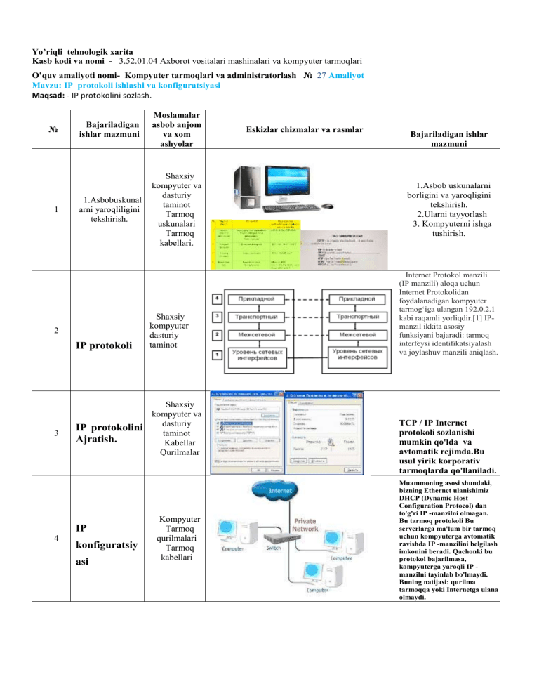 Yo’riqli tehnologik xarita Kasb kodi va nomi - 3.52.01.04 Axborot vositalari mashinalari va kompyuter tarmoqlari O’quv amaliyoti nomi- Kompyuter tarmoqlari va administratorlash № 27 Amaliyot Mavzu: IP protokoli ishlashi va konfiguratsiyasi Maqsad: - IP protokolini sozlash. № 1 Bajariladigan ishlar mazmuni Moslamalar asbob anjom va xom ashyolar 1.Asbobuskunal arni yaroqliligini tekshirish. Shaxsiy kompyuter va dasturiy taminot Tarmoq uskunalari Tarmoq kabellari. 2 IP protokoli 3 IP protokolini Ajratish. IP 4 konfiguratsiy asi Shaxsiy kompyuter dasturiy taminot Shaxsiy kompyuter va dasturiy taminot Kabellar Qurilmalar Kompyuter Tarmoq qurilmalari Tarmoq kabellari Eskizlar chizmalar va rasmlar Bajariladigan ishlar mazmuni 1.Asbob uskunalarni borligini va yaroqligini tekshirish. 2.Ularni tayyorlash 3. Kompyuterni ishga tushirish. Internet Protokol manzili (IP manzili) aloqa uchun Internet Protokolidan foydalanadigan kompyuter tarmogʻiga ulangan 192.0.2.1 kabi raqamli yorliqdir.[1] IPmanzil ikkita asosiy funksiyani bajaradi: tarmoq interfeysi identifikatsiyalash va joylashuv manzili aniqlash. TCP / IP Internet protokoli sozlanishi mumkin qo'lda va avtomatik rejimda.Bu usul yirik korporativ tarmoqlarda qo'llaniladi. Muammoning asosi shundaki, bizning Ethernet ulanishimiz DHCP (Dynamic Host Configuration Protocol) dan to'g'ri IP -manzilni olmagan. Bu tarmoq protokoli Bu serverlarga ma'lum bir tarmoq uchun kompyuterga avtomatik ravishda IP -manzilini belgilash imkonini beradi. Qachonki bu protokol bajarilmasa, kompyuterga yaroqli IP manzilni tayinlab bo'lmaydi. Buning natijasi: qurilma tarmoqqa yoki Internetga ulana olmaydi. Yo’riqli tehnologik xarita Kasb kodi va nomi - 3.52.01.04 Axborot vositalari mashinalari va kompyuter tarmoqlari O’quv amaliyoti nomi- Kompyuter tarmoqlari va administratorlash № 28 Mavzu:IP tarmoq protokolini sozlash Maqsad: - IP protokolini sozlashni o’rganish. № 1 Bajariladigan ishlar mazmuni Moslamalar asbob anjom va xom ashyolar IP manzil nima? Shaxsiy kompyuter va dasturiy taminot Tarmoq uskunalari Tarmoq kabellari. 2 IP protokoli 3 IP protokolini sozlash. IP 4 konfiguratsiy asi Shaxsiy kompyuter dasturiy taminot Shaxsiy kompyuter va dasturiy taminot Kabellar Qurilmalar Kompyuter Tarmoq qurilmalari Tarmoq kabellari Amaliyot Eskizlar chizmalar va rasmlar Bajariladigan ishlar mazmuni IP manzil (o'qilishi (ay-pi adres) ingilizcha Internet Protocol)- Qurilmaning tarmoqdagi takrorlanmas virtual adresidir. Internet Protokol manzili (IP manzili) aloqa uchun Internet Protokolidan foydalanadigan kompyuter tarmogʻiga ulangan 192.0.2.1 kabi raqamli yorliqdir.[1] IPmanzil ikkita asosiy funksiyani bajaradi: tarmoq interfeysi identifikatsiyalash va joylashuv manzili aniqlash. TCP / IP Internet protokoli sozlanishi mumkin qo'lda va avtomatik rejimda.Bu usul yirik korporativ tarmoqlarda qo'llaniladi. Muammoning asosi shundaki, bizning Ethernet ulanishimiz DHCP (Dynamic Host Configuration Protocol) dan to'g'ri IP -manzilni olmagan. Bu tarmoq protokoli Bu serverlarga ma'lum bir tarmoq uchun kompyuterga avtomatik ravishda IP -manzilini belgilash imkonini beradi. Qachonki bu protokol bajarilmasa, kompyuterga yaroqli IP manzilni tayinlab bo'lmaydi. Buning natijasi: qurilma tarmoqqa yoki Internetga ulana olmaydi. Yo’riqli tehnologik xarita Kasb kodi va nomi - 3.52.01.04 Axborot vositalari mashinalari va kompyuter tarmoqlari O’quv amaliyoti nomi- Kompyuter tarmoqlari va administratorlash № 29 Amaliyot Mavzu: Internet protokoli IP haqida ma’lumot. Maqsad: - IP protokolini sozlashni o’rganish. № 1 Bajariladigan ishlar mazmuni Moslamalar asbob anjom va xom ashyolar IP manzil nima? Shaxsiy kompyuter va dasturiy taminot Tarmoq uskunalari Tarmoq kabellari. 2 IP protokoli 3 IP protokolini sozlash. IP 4 konfiguratsiy asi Shaxsiy kompyuter dasturiy taminot Shaxsiy kompyuter va dasturiy taminot Kabellar Qurilmalar Kompyuter Tarmoq qurilmalari Tarmoq kabellari Eskizlar chizmalar va rasmlar Bajariladigan ishlar mazmuni IP manzil (o'qilishi (ay-pi adres) ingilizcha Internet Protocol)- Qurilmaning tarmoqdagi takrorlanmas virtual adresidir. Internet Protokol manzili (IP manzili) aloqa uchun Internet Protokolidan foydalanadigan kompyuter tarmogʻiga ulangan 192.0.2.1 kabi raqamli yorliqdir.[1] IPmanzil ikkita asosiy funksiyani bajaradi: tarmoq interfeysi identifikatsiyalash va joylashuv manzili aniqlash. TCP / IP Internet protokoli sozlanishi mumkin qo'lda va avtomatik rejimda.Bu usul yirik korporativ tarmoqlarda qo'llaniladi. Muammoning asosi shundaki, bizning Ethernet ulanishimiz DHCP (Dynamic Host Configuration Protocol) dan to'g'ri IP -manzilni olmagan. Bu tarmoq protokoli Bu serverlarga ma'lum bir tarmoq uchun kompyuterga avtomatik ravishda IP -manzilini belgilash imkonini beradi. Qachonki bu protokol bajarilmasa, kompyuterga yaroqli IP manzilni tayinlab bo'lmaydi. Buning natijasi: qurilma tarmoqqa yoki Internetga ulana olmaydi. Yo’riqli tehnologik xarita Kasb kodi va nomi - 3.52.01.04 Axborot vositalari mashinalari va kompyuter tarmoqlari O’quv amaliyoti nomi- Kompyuter tarmoqlari va administratorlash № 32 Amaliyot Mavzu: IPv4 tuzilishi. Sinflar printsipi. Maqsad: - IP protokolini sozlashni o’rganish. № 1 Bajariladi gan ishlar mazmuni Shaxsiy kompyuter va dasturiy taminot IPv4 Tarmoq manzil nima? uskunalari Tarmoq kabellari. 2 IP protokoli 3 4 Moslamalar asbob anjom va xom ashyolar Shaxsiy kompyuter dasturiy taminot Shaxsiy Maxfiy IPv4 kompyuter va dasturiy taminot tarmoq Kabellar diapazonlari Qurilmalar Xususiy tarmoqlar Kompyuter Tarmoq qurilmalari Tarmoq kabellari Eskizlar chizmalar va rasmlar Bajariladigan ishlar mazmuni To'rt nuqtali IPv4 manzilini uning dekompozitsiyasi ikkilik qiymat IPv4-da cheklovlarni cheklaydigan 32bitli manzillar ishlatiladi manzil maydoni ga 4294967296 (232) manzillar. IPv4 uchun maxsus manzil bloklari zaxiralangan xususiy tarmoqlar (~ 18 million manzil) va multicast manzillar (~ 270 million manzil). IPv4 manzillari 32-bitli tamsa