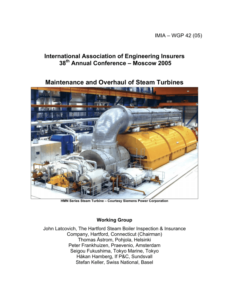 IMIA – WGP 42 (05) International Association of Engineering Insurers 38th Annual Conference – Moscow 2005 Maintenance and Overhaul of Steam Turbines HMN Series Steam Turbine – Courtesy Siemens Power Corporation Working Group John Latcovich, The Hartford Steam Boiler Inspection & Insurance Company, Hartford, Connecticut (Chairman) Thomas Åstrom, Pohjola, Helsinki Peter Frankhuizen, Praevenio, Amsterdam Seigou Fukushima, Tokyo Marine, Tokyo Håkan Hamberg, If P&C, Sundsvall Stefan Keller, Swiss National, Basel IMIA – WGP 42 (05) Maintenance and Overhaul of Steam Turbines Table of Contents Section Title Page Table of Contents 2 Executive Summary 4 1. Introduction 5 2. Steam Turbine Component Characteristics, Failure Mechanisms, Arrangements and Applications 6 A. Turbine Component Characteristics and Failure Mechanisms 6 A.1 A.2 A.3 A.4 A.5 A.6 A.7 A.8 A.9 A.10 Steam Turbine Blading Discs, Rotors, Shafts, Blade Rings, Shells, and Diaphragms Rotor Forgings with Center Bores Bearings and Lubrication Systems Steam and Oil Seals Stop, Trip & Throttle, and Intercept Valves Governor/Control Valves Admission, Extraction, and Non-Return Valves (NRV) Steam Line Connections and Drains Turbine Overspeed Protection and Trip Logic 6 7 8 8 9 9 10 10 11 11 B. Steam Turbine Arrangements and Applications 12 B.1 B.2 B.3 B.4 B.5 B.6 B.7 B.8 B.9 Type of Steam Exhaust System Configuration Grouping and Number of Turbine Stages Turbine Arrangements Single Stage Small Steam Turbines Multistage Medium Size Steam Turbines Single Casing Admission/Extraction Multistage Steam Turbines Single Casing Non-Reheat Multiple Stage Steam Turbines Single Casing Reheat Multiple Stage Combined Cycle Steam Turbines B.10 Multiple Casing Multiple Stage Reheat Steam Turbines 2 12 13 14 15 16 16 17 18 18 19 IMIA – WGP 42 (05) Table of Contents (Continued) Section Title Page 3. Monitoring, Operations, Maintenance, and Training Infrastructure 20 A. Monitoring 20 A.1 A.2 A.3 A.4 Equipment Monitoring Water and Steam Purity Monitoring Water Induction Monitoring Condition Monitoring 20 22 22 23 B. Operations, Maintenance, and Training Infrastructure 24 B.1 B.2 B.3 Operations Maintenance Management Training 24 25 25 4. Steam Turbine Availability and Failure Experience 27 5. Scheduled Maintenance and Overhaul Practices 30 A. B. C. 30 32 34 6. U.S. Maintenance Practices European Maintenance Practices Japanese Maintenance Practices Approaches/Methodologies/Criteria for Establishing Longer Time Intervals between Major Overhauls 37 A. B. C. D. E. F. G. Management Directed Interval Process and Criticality Driven Intervals Turbine Manufacturer’s Intervals Electric Power Research Institute (EPRI) VGB Standards Risk-Based Methodologies Reliability Centered or Condition Based Maintenance (RCM or CBM) 37 37 38 38 39 39 41 7. Issues with New Steam Turbine Technologies and Applications 43 8. Conclusions 46 3 IMIA – WGP 42 (05) Executive Summary Steam turbines provide a means of converting saturated, superheated, or supercritical steam from boilers or heat recovery steam generators (HRSG) into rotational torque and power. Consequently steam turbines are utilized to drive a variety of equipment types of numerous sizes and speeds in just about every industry segment including power generation, pulp and paper, iron and steel, combined heat and power, and chemical, oil and gas industries. While there are substantial differences in the design, complexity, application, steam conditions, and size of steam turbines, they all are fundamentally the same. They perform the same function, utilize similar major components and supporting systems, and are subjected to the same failure mechanisms. To support reliable turbine operation, there needs to be an effective infrastructure in place for monitoring the operating conditions, water/steam quality, and health of the steam turbine, for having and using written operating/maintenance procedures, for utilizing a maintenance management system to schedule/track maintenance, and for conducting training for personnel on an ongoing basis. There have been numerous causes of steam turbine failures worldwide. The highest frequency events have been loss of lube oil incidents while the highest severity events have been overspeed events. Typically, higher frequency and higher severity events have been blade/bucket failures, particularly in the low pressure (LP) section of the turbine where the blading experienced a number of failure mechanisms (stress corrosion cracking (SCC), erosion, foreign object damage (FOD)) which ultimately led to failure. With regards to maintenance practices in North America and Europe, there are no regulatory maintenance practices or intervals specified for non-nuclear steam turbines regardless of the industry or application. As such, the frequencies and tasks are defined by the turbine manufacturers, consultants, industry organizations, plant personnel, plant process requirements, or insurers based on past experience. In Japan, however, there are regulatory requirements for periodic maintenance. However, regardless of the area of the world, the recommended scheduled maintenance requirements for steam turbines are quite similar. For establishing longer time intervals between major overhaul outages, there are a number of different approaches which are utilized today worldwide. Regardless of the approach, it is important that the methodologies effectively establish the overhaul intervals based on the highest risk portions of the steam turbine. The technologies being incorporated into new steam turbines are more sophisticated, require operation at higher pressures and temperatures, and generally have smaller clearances to improve efficiency. While these technologies have not caused any large losses, the inherent risk exposures are increasing and the in-service experience with these technologies needs to be monitored. In summary, maintenance tasks and frequencies should be prioritized towards the p