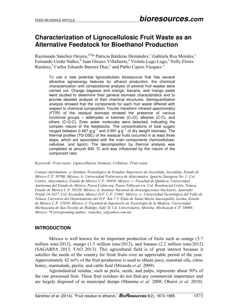 PEER-REVIEWED ARTICLE bioresources.com Characterization of Lignocellulosic Fruit Waste as an Alternative Feedstock for Bioethanol Production Raymundo Sánchez Orozco,a,b* Patricia Balderas Hernández,c Gabriela Roa Morales,c Fernando Ureña Núñez,d Juan Orozco Villafuerte,c Violeta Lugo Lugo,e Nelly Flores Ramírez,f Carlos Eduardo Barrera Díaz,c and Pablo Cajero Vázquez a To use a new potential lignocellulosic bioresource that has several attractive agroenergy features for ethanol production, the chemical characterization and compositional analysis of several fruit wastes were carried out. Orange bagasse and orange, banana, and mango peels were studied to determine their general biomass characteristics and to provide detailed analysis of their chemical structures. Semiquantitative analysis showed that the components for each fruit waste differed with respect to chemical composition. Fourier transform infrared spectrometry (FTIR) of the residual biomass showed the presence of various functional groups – aldehydes or ketones (C=O), alkanes (C-C), and ethers (C-O-C). Even water molecules were detected, indicating the complex nature of the feedstocks. The concentrations of total sugars −1 −1 ranged between 0.487 g∙g and 0.591 g∙g of dry weight biomass. The thermal profiles (TG-DSC) of the residual fruits occurred in at least three steps, which are associated with the main components (hemicellulose, cellulose, and lignin). The decomposition by thermal analysis was completed at around 600 °C and was influenced by the nature of the component ratio. Keywords: Fruit waste; Lignocellulosic biomass; Cellulose; Fruit waste Contact information: a: Instituto Tecnológico de Estudios Superiores de Jocotitlán, Jocotitlán, Estado de México C.P. 50700, México; b: Universidad Politécnica de Atlacomulco, Ignacio Zaragoza No. 1, Col. Centro, Atlacomulco, Estado de México C.P. 50450, México; c: Facultad de Química, Universidad Autónoma del Estado de México, Paseo Colón esq. Paseo Tollocan s/n, Col. Residencial Colón, Toluca, Estado de México C.P. 50120, México; d: Instituto Nacional de Investigaciones Nucleares, Apartado Postal 18-1027, Col. Escandón, México D.F. C.P. 11801, México; e: Universidad Tecnológica del Valle de Toluca, Carretera del Departamento del D.F. Km 7.5, Ejido de Santa María Atarasquillo, Lerma, Estado de México C.P. 52050, México; f: Facultad de Ingeniería en Tecnología de la Madera, Universidad Michoacana de San Nicolás de Hidalgo, Edif. D, Cd. Universitaria, Morelia, Michoacán C.P. 58060, México; *Corresponding author: rsanchez_o@yahoo.com.mx INTRODUCTION México is well known for its important production of fruits such as orange (3.7 million tons/2012), mango (1.5 million tons/2012), and banana (2.2 million tons/2012) (SAGARPA 2013; FAO 2013). This agricultural field is of great interest because it satisfies the needs of the country for fresh fruits over an appreciable period of the year. Approximately 42 wt% of the fruit production is used to obtain juice, essential oils, citrus honey, marmalade, pectin, and cattle feed (Miranda et al. 2009). Agroindustrial residue, such as peels, seeds, and pulps, represents about 50% of the raw processed fruit. These fruit residues do not find any commercial importance and are largely disposed of in municipal dumps (Mamma et al. 2008; Oberoi et al. 2010). Sánchez et al. (2014). “Fruit residue to ethanol,” BioResources 9(2), 1873-1885. 1873 PEER-REVIEWED ARTICLE bioresources.com Fruit peels represent an important source of sugars, which makes them an interesting choice for the production of chemicals such as ethanol (Sánchez-Orozco et al. 2012). Due to their abundance and renewability, these wastes are being considered as raw materials for the production of competitive bioethanol in the open market (Mtui 2009). Thus, bioethanol production from these fruit residues could be an attractive alternative for disposal of these residues. Lignocellulosic feedstock such as fruit peels are primarily composed of pectin, cellulose, hemicellulose, and small amounts of lignin (Oberoi et al. 2010). Orange peel and bagasse waste are a potential feedstock for bioethanol production due to their high carbohydrate content, which is similar to other studied feedstocks (Boluda-Aguilar et al. 2010; Wilkins 2009). However, and despite the importance of orange peel waste volume, no published research work has studied the possibility of its use in ethanol production, although there are studies about other uses: for essential oils recovery (Rezzoug and Louka 2009; Neng-Guo et al. 2009), as a fermentation substrate for the production of multienzyme preparations (Wilkins et el. 2007), and for pectin extraction (Liu et al. 2006). The agroindustry has experienced increasing costs for its waste treatment. While a number of investigations have been conducted concerning the composition and possible utilization of banana pulp (Li et al. 2010; Happi Emaga et al. 2008), studies on banana by-products are focused on pectin extraction, phenolic compounds, flavonoids, and ethanol production (Velásquez-Arredondo et al. 2009; Brooks 2008; García et al. 2012). The results of other studies have demonstrated the high cellulose content in banana, a promising potential source of polysaccharides because it is rich in sugars such as sucrose, glucose, and fructose (Manikandan et al. 2007). In the same way, the utilization of mango kernels as a source of fat, natural antioxidants, starch, flour, and feed has been investigated (Readdy and Sarathi 2007; Berardini et al. 2005). The edible pulp makes up 33 to 85% of the fresh fruit, while the peel and the kernel comprise 7 to 24% and 9 to 40%, respectively. On the other hand, by-products of industrial mango processing may comprise 35 to 60% of the total fruit weight (Kaur et al. 2004), although studies on peels are limited. In the present paper, therefore, four biomasses with potential interest for bioethano