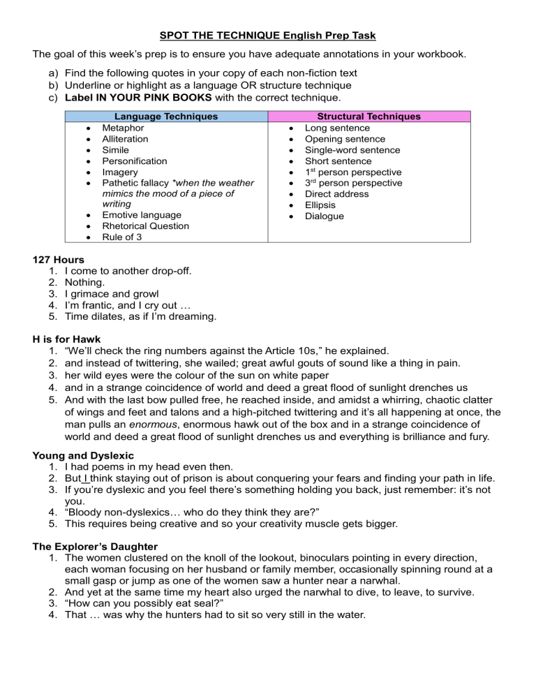 SPOT THE TECHNIQUE English Prep Task The goal of this week’s prep is to ensure you have adequate annotations in your workbook. a) Find the following quotes in your copy of each non-fiction text b) Underline or highlight as a language OR structure technique c) Label IN YOUR PINK BOOKS with the correct technique. Language Techniques Metaphor Alliteration Simile Personification Imagery Pathetic fallacy *when the weather mimics the mood of a piece of writing Emotive language Rhetorical Question Rule of 3 Structural Techniques Long sentence Opening sentence Single-word sentence Short sentence 1st person perspective 3rd person perspective Direct address Ellipsis Dialogue 127 Hours 1. I come to another drop-off. 2. Nothing. 3. I grimace and growl 4. I’m frantic, and I cry out … 5. Time dilates, as if I’m dreaming. H is for Hawk 1. “We’ll check the ring numbers against the Article 10s,” he explained. 2. and instead of twittering, she wailed; great awful gouts of sound like a thing in pain. 3. her wild eyes were the colour of the sun on white paper 4. and in a strange coincidence of world and deed a great flood of sunlight drenches us 5. And with the last bow pulled free, he reached inside, and amidst a whirring, chaotic clatter of wings and feet and talons and a high-pitched twittering and it’s all happening at once, the man pulls an enormous, enormous hawk out of the box and in a strange coincidence of world and deed a great flood of sunlight drenches us and everything is brilliance and fury. Young and Dyslexic 1. I had poems in my head even then. 2. But I think staying out of prison is about conquering your fears and finding your path in life. 3. If you’re dyslexic and you feel there’s something holding you back, just remember: it’s not you. 4. “Bloody non-dyslexics… who do they think they are?” 5. This requires being creative and so your creativity muscle gets bigger. The Explorer’s Daughter 1. The women clustered on the knoll of the lookout, binoculars pointing in every direction, each woman focusing on her husband or family member, occasionally spinning round at a small gasp or jump as one of the women saw a hunter near a narwhal. 2. And yet at the same time my heart also urged the narwhal to dive, to leave, to survive. 3. “How can you possibly eat seal?” 4. That … was why the hunters had to sit so very still in the water.