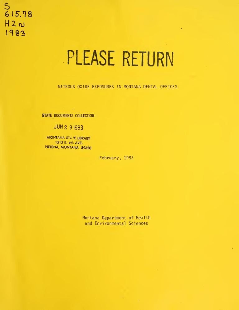 6 15.18 H2nj I'm PLEASE RETURN NITROUS OXIDE EXPOSURES IN MONTANA DENTAL OFFICES STATE DOCUMENTS COLLECTION JUN2 91983 MONTANA STATP LIBRARV 1515 £. 6th AVE. HELENA, MONTANA 59620 February, 1983 Montana Department of Health and Environmental Sciences MONTANA STATE LIBRARY S615.78H2n 1983 c.1 Hooper Nitrous oxide exposures in Montana denta 3 0864 00044603 2 NITROUS OXIDE EXPOSURES IN MONTANA DENTAL OFFICES February, 1983 Montana Department of Health and Environmental Sciences Occupational Health Bureau Cogswell Building Helena, Montana 59620 Prepared by William A. Hooper 406/449-3671 Digitized by the Internet Archive in 2014 http://archive.org/details/nitrousoxideexpo1983hoop OCCUPATIONAL EXPOSURE TO NITROUS OXIDE -IN MONTANA DENTAL OFFICES Nationwide more than 100,000 workers are exposed to nitrous oxide in Data collected in other states show that dental workers are dental offices. exposed to nitrous oxide levels several times higher than workers in hospital operating rooms, furthermore, a large scale epidemiologic study by Ellis N. Cohen, et.al. reported significant occupational health problems associated with nitrous oxide exposures in dental offices. Because of the potentially serious health problems that can result from exposure to nitrous oxide and the high occupational nitrous oxide exposures reported in other states, the Occupational Health Bureau, Montana Department of Health and Environmental Sciences (DHES) initiated an investigation of occupational exposures to nitrous oxide in Montana. Of these, 172 or 48 A total of 355 Montana dentists were contacted. To date, 102 of these offices percent, indicated they use nitrous oxide. have been tested to determine the degree to which dentists and dental Seventeen dentists using personnel are being exposed to nitrous oxide. nitrous oxide did not wish to have their offices tested. Cohen's studies revealed significant occupational health risks which The survey received responses from result from exposure to nitrous oxide. Two groups of equal size 30,650 dentists and 30,547 chairside assistants. about 15,000 nitrous oxide users and 15,000 non-users were systematically Statistically significant health derived from the initial responses. effects reported from this study are shown in Table 1. Based on the information available,,™ 1977, the National Institute for recommended that the maximum Occupational Safety and Health (NI0SH) permissible level of exposure to nitrous oxide should be a Time Weighted Average (TWA) concentration of 25 ppm during the period of administration (where ppm is parts of contaminant per million parts of air). Two commercially available passive monitors for measuring nitrous oxide exposures are: The Solid State Sensor Monitor (marketed by Porter Instrument Co.). 1. This is about the size and shape of a 35 mm film canister, and is an eight-hour sampler. 1 - TABLE 1 Health Effects to Dentists and Chairside Assistants in Dental Offices Where Nitrous Oxide is Used Health Effects Annual Exposure Time (Hours) More Than 300 Less Than 300 Spontaneous abortion Significant for dentist's wives and dental assistants Significant for dentist's wives and dental assistants Congenital abnormalities Only significant for children of dental assi stants* Not significant* Liver disease Not significant Significant for dentists and dental assi stants Kidnev disease Only significant for dental assistants Significant for dentists and dental assi stants Neurologic disease Significant for dentists and dental assi stants Significant for dentists and dental assi stants be associated Maternal offspring. in of abnormalities congenital with a higher rate exposures are associated with increased rates of congenital abnormalities in However, statistical significance is present only for the their offspring. According to Cohen, paternal exposure does not seem to group of light users of anesthetics and the two groups (light and heavy) combined. 2 The R. S. Landauer Monitor (not available before the summer of 2. This is about the size and shape of an ink pen and is a 40-hour 1982). sampl er. Both of these monitors are worn by exposed personnel and then returned to the manufacturer for analysis (infra-red). The United States Air Force evaluated both of these passive monitors in the field and published the results. At nitrous oxide concentrations above 14 ppm, the Solid State Sensor Monitor gave consistently low values. It was also inaccurate at all levels. (A ^IOSH study also found the Solid State Sensor Monitor to be unsatisfactory. ) On the other hand, the R. S. Landauer Monitor performed satisfactorily. However, the R. S. Landauer Monitor provides a Time Weighted Average (TWA) measurement for a full week, while the NIOSH standard is only for the TWA period during which the nitrous oxide is being administered. A Mi ran 1A infra-red analyzer was used exclusively by the DHES to measure nitrous oxide concentrations in Montana. 2 The NIOSH criteria document on waste anesthetic gases and vapors states that the "direct infrared analysis of nitrous oxide is the most desirable method." The Miran 1A meets these criteria. The breathing zone concentrations of nitrous oxide in cjental operatories in Montana are quite similar to those found by NIOSH in other With few exceptions, nitrous oxide levels in areas of the United States. Montana greatly exceeded the NIOSH recommended standard. The nitrous oxide data collected in Montana dental operatories are shown The measurements were made in the dentist's or assistant's breathing zones during the administration of nitrous oxide to one patient. in Table 2. Scavenging systems removed nitrous oxide from around the breathing mask About 20% of the dentist's offices tested used by means of a vacuum system. a scavenging system. Leaks in nitrous oxide delivery systems were found in 54 dental ofNineteen fices. An average of about two leaks were found in each office. of these leaks were repaired during the inspections. From Table 2,