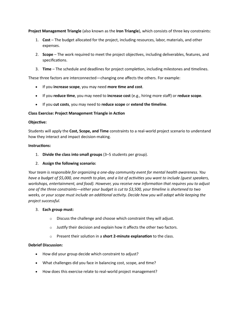 Project Management Triangle (also known as the Iron Triangle), which consists of three key constraints: 1. Cost – The budget allocated for the project, including resources, labor, materials, and other expenses. 2. Scope – The work required to meet the project objectives, including deliverables, features, and specifications. 3. Time – The schedule and deadlines for project completion, including milestones and timelines. These three factors are interconnected—changing one affects the others. For example: If you increase scope, you may need more time and cost. If you reduce time, you may need to increase cost (e.g., hiring more staff) or reduce scope. If you cut costs, you may need to reduce scope or extend the timeline. Class Exercise: Project Management Triangle in Action Objective: Students will apply the Cost, Scope, and Time constraints to a real-world project scenario to understand how they interact and impact decision-making. Instructions: 1. Divide the class into small groups (3–5 students per group). 2. Assign the following scenario: Your team is responsible for organizing a one-day community event for mental health awareness. You have a budget of $5,000, one month to plan, and a list of activities you want to include (guest speakers, workshops, entertainment, and food). However, you receive new information that requires you to adjust one of the three constraints—either your budget is cut to $3,500, your timeline is shortened to two weeks, or your scope must include an additional activity. Decide how you will adapt while keeping the project successful. 3. Each group must: o Discuss the challenge and choose which constraint they will adjust. o Justify their decision and explain how it affects the other two factors. o Present their solution in a short 2-minute explanation to the class. Debrief Discussion: How did your group decide which constraint to adjust? What challenges did you face in balancing cost, scope, and time? How does this exercise relate to real-world project management? Individual Task: Project Management Triangle Decision-Making Objective: Students will apply the Cost, Scope, and Time constraints to a real-world project scenario and make decisions based on their understanding of the Project Management Triangle. Instructions: 1. Read the scenario below: You have been assigned to lead a small project: launching a student awareness campaign on mental health. You have: o A budget of $2,000 o A timeline of one month o A scope that includes social media posts, printed flyers, and an awareness event 2. Unexpected Change: Due to unforeseen circumstances, you must adjust one of the three constraints: o Your budget is reduced to $1,200, OR o Your timeline is cut to two weeks, OR o Your scope expands to include an additional school (meaning more work) 3. Your Task: o Choose one constraint to adjust. o Explain why you made this choice. o Describe how this change will affect the other two constraints. o Suggest a solution to keep the project successful despite the change. 4. Submission: o Write a 1-page response o Reflection Questions (for discussion after submission): How did your decision impact the project? What strategies can project managers use to balance these constraints in real-world scenarios? Answer Key: Project Management Triangle Decision-Making Since this exercise requires critical thinking, there isn’t a single "correct" answer. However, here are sample responses based on each possible decision, showing how the Project Management Triangle is affected. Option 1: Budget Reduction ($2,000 → $1,200) Impact on Time: Likely no major change, but fewer funds may slow down progress (e.g., fewer paid resources). Impact on Scope: The project may need to cut some activities, such as reducing printed flyers or limiting the awareness event’s size. Solution: Focus more on social media marketing instead of printed flyers to save money. Seek sponsorships or donations from local businesses for event costs. Use volunteers instead of paid staff for the awareness event. Option 2: Timeline Reduction (1 Month → 2 Weeks) Impact on Cost: Might increase because the team may need to pay for rush orders or extra staff to complete tasks on time. Impact on Scope: Some activities may need to be cut to fit within the shorter timeline. Solution: Prioritize high-impact tasks like social media outreach and a simplified awareness event. Reduce planning time by using ready-made templates for marketing materials. Assign clear deadlines and responsibilities to maximize efficiency. Option 3: Scope Expansion (Add an Extra School) Impact on Cost: Likely increases, as more materials and resources will be needed. Impact on Time: The team may need extra time to manage the additional workload. Solution: Seek additional funding through partnerships or sponsorships. Delegate responsibilities by creating smaller teams to manage different schools. Use a phased approach, focusing on one school first and expanding outreach gradually.