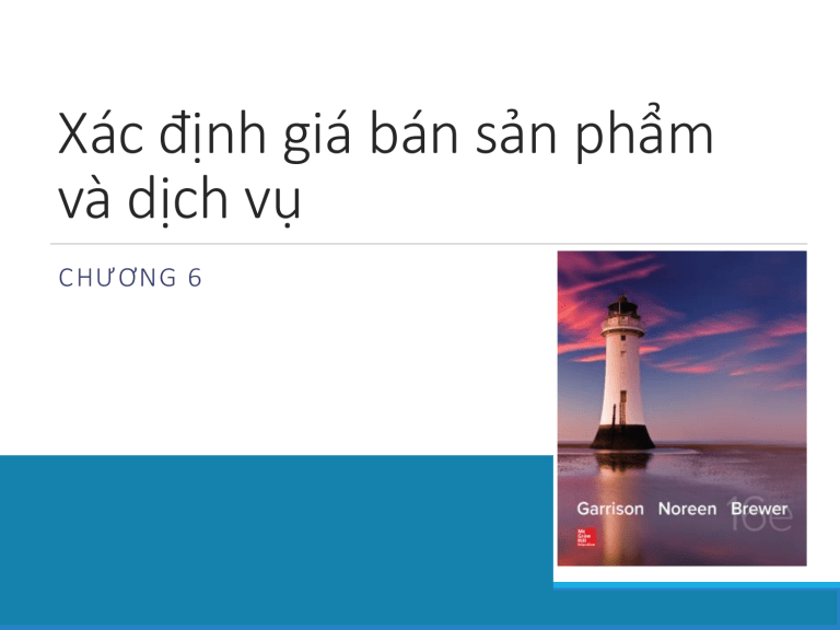 Xác định giá bán sản phẩm và dịch vụ CHƯ ƠNG 6 PowerPoint Authors: Susan Coomer Galbreath, Ph.D., CPA Jon A. Booker, Ph.D., CPA, CIA Cynthia J. Rooney, Ph.D., CPA ©McGraw-Hill Education. All rights reserved. Authorized only for instructor use in the classroom. No reproduction or further distribution permitted without the prior written consent of McGraw-Hill Education. 12A-2 Mục tiêu chương 6 1.Hiểu được một số vấn đề chú ý trong đinh giá sản phẩm. 2.Biết cách định giá bán sản phẩm sản xuất hàng loạt. 3. Biết cách định giá bán theo chi phí mục tiêu. 4. Biết cách định giá bán theo sản phẩm dịch vụ. 5. Biết cách định giá bán trong một số trường hợp đặc biệt. ©McGraw-Hill Education. All rights reserved. Authorized only for instructor use in the classroom. No reproduction or further distribution permitted without the prior written consent of McGraw-Hill Education. 12A-3 Mục tiêu 1 Tính giá bán của sản phẩm bằng phương pháp toàn bộ. ©McGraw-Hill Education. All rights reserved. Authorized only for instructor use in the classroom. No reproduction or further distribution permitted without the prior written consent of McGraw-Hill Education. 12A-4 Xác định giá theo phương pháp toàn bộ Công ty thường xác định giá bán bằng cách cộng thêm một số tiền (markup) hay một tỷ lệ phần trăm vào chi phí sản phẩm. Phần số tiền cộng thêm của sản phẩm là chênh lệch giữa giá bán và chi phí sản phẩm và nó thường được biễu diễn dưới dạng phần trăm của chi phí. Giá bán= (1 + Tỷ lệ số tiền cộng thêm) x Chi phí Nếu chi phí 1 sản phẩm là $50 và cty muốn lợi nhuận kì vọng 20% so với chi phí, thì giá bán sản phẩm sẽ là $60. Giá bán= (1 + 20%) x $50 Giá bán= $60 ©McGraw-Hill Education. All rights reserved. Authorized only for instructor use in the classroom. No reproduction or further distribution permitted without the prior written consent of McGraw-Hill Education. 12A-5 Quá trình xác định giá bán gồm 3 bước Bước 1, Công ty cần tính chi phí sản xuất một sản phẩm (bao gồm NVLTT, NCTT, biến phí SXC và định phí sản xuất chung). Bước 2, Công ty cần xác định tỷ lệ số tiền cộng thêm theo phương pháp tính phí toàn bộ. Bước 3, Công ty cần nhân chi phí sản phẩm đơn vị với tỷ lệ phần trăm số tiền cộng thêm để xác định giá bán sản phẩm. ©McGraw-Hill Education. All rights reserved. Authorized only for instructor use in the classroom. No reproduction or further distribution permitted without the prior written consent of McGraw-Hill Education. 12A-6 Chi phí cơ bản (chi phí nền) Sử dụng phương pháp toàn bộ để xác định giá bán thì chi phí nền chính là Chi phí sản xuất sản phẩm đơn vị theo phương pháp toàn bộ Chi phí cơ bản (nền) bao gồm NVLTT, NCTT, biến phí sản xuất chung và định phí sản xuất chung. ©McGraw-Hill Education. All rights reserved. Authorized only for instructor use in the classroom. No reproduction or further distribution permitted without the prior written consent of McGraw-Hill Education. 12A-7 Xác định giá bán sản phẩm– Ví dụ Thông tin bên dưới cung cấp bởi quản lý cty R NVL trực tiếp NC trực tiếp Biến phí sản xuất chung Định phí sản xuất chung Biến phí bán hàng và QLDN Định Phí bán hàng và QLDN mỗi sp $ 6 4 3 Tổng $ 70.000 2 60.000 Công ty sẽ sử dụng phương pháp tính phí toàn bộ để xác định giá bán sản phẩm theo phương pháp định giá cộng thêm vào chi phí và qui trình xác định giá bán gồm 3 bước.. ©McGraw-Hill Education. All rights reserved. Authorized only for instructor use in the classroom. No reproduction or further distribution permitted without the prior written consent of McGraw-Hill Education. 12A-8 Xác định giá bán sản phẩm– Bước 1 Bước đầu tiên trong qui trình xác định giá bán theo phương pháp toàn bộ là tính chi phí sx sản phẩm đơn vị hay chi phí nền của 1 sản phẩm NVLTT NCTT Biến phí SXC Định phí SXC Chi phí sx sản phẩm đơn vị Mỗi sp $ 6 4 3 7 $ 20 ($70,000 ÷ 10,000 sp = $7 /sp) ©McGraw-Hill Education. All rights reserved. Authorized only for instructor use in the classroom. No reproduction or further distribution permitted without the prior written consent of McGraw-Hill Education. 12A-9 Xác định giá bán sản phẩm– Bước 2 Bước thứ 2 trong qui trình xác định giá bán theo phương pháp toàn bộ tính tỷ lệ số tiền cộng thêm vào chi phí ở bước 1 Phương trình để tính tỷ lệ số tiền cộng thêm trình bày bên dưới. % số tiền cộng (ROI mong muốn× Vốn đầu tư) + Cp.BH&QLDN thêm = Số lượng bán× cp.sản phẩm đơn vị pp tính phí toàn bộ Tỷ lệ số tiền cộng thêm phải đủ lớn để bù đắp chi phí bán hàng, quản lý doanh nghiệp và hoàn lại lợi nhuận mong muốn cho vốn đầu tư. ©McGraw-Hill Education. All rights reserved. Authorized only for instructor use in the classroom. No reproduction or further distribution permitted without the prior written consent of McGraw-Hill Education. 12A-10 Xác định giá bán sản phẩm– Bước 2– Ví dụ Hãy giả định rằng R phải đầu tư $100,000 vào sản phẩm và tiếp thị 10,000 sp mỗi năm. Cty mong muốn tỷ lệ hoàn vốn là 20% cho tất cả các khoản đầu tư. Hãy xác định tỷ lệ số tiền cộng thêm của R theo phương pháp tính phí toàn bộ. ©McGraw-Hill Education. All rights reserved. Authorized only for instr