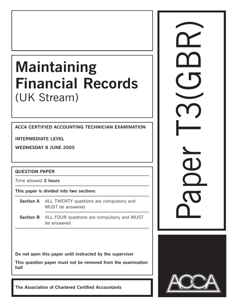 (UK Stream) ACCA CERTIFIED ACCOUNTING TECHNICIAN EXAMINATION INTERMEDIATE LEVEL WEDNESDAY 8 JUNE 2005 QUESTION PAPER Time allowed 2 hours This paper is divided into two sections Section A ALL TWENTY questions are compulsory and MUST be answered Section B ALL FOUR questions are compulsory and MUST be answered Do not open this paper until instructed by the supervisor This question paper must not be removed from the examination hall The Association of Chartered Certified Accountants Paper T3(GBR) Maintaining Financial Records Section A – ALL TWENTY questions are compulsory and MUST be attempted Each question in this section is worth 2 marks. Please use the Candidate Registration Sheet provided to indicate your chosen answer to each multiple choice question. 1 Jenny has recorded the following journal entry: Debit Purchases £1,500 Credit Stationery £1,500 What is the correct narrative for Jenny’s journal entry? A B C D 2 Which of the following items should be included in the calculation of gross profit? A B C D 3 Carriage inwards Carriage outwards Early settlement discount allowed Early settlement discount received Which of the following correctly calculates cost of sales? A B C D 4 Being cash purchase of stationery Being credit purchase of stationery Being correction of error – purchases originally recorded as stationery Being correction of error – stationery originally recorded as purchases Purchases + Opening stock + Closing stock Purchases – Opening stock + Closing stock Purchases – Opening stock – Closing stock Purchases + Opening stock – Closing stock Esther is recording the invoice for the purchase of a new fixed asset. As well as the basic cost of the asset, the invoice shows the following items: Delivery Installation Maintenance Which of the costs should be treated as revenue expenditure? A B C D 5 Delivery only Installation only Maintenance only All of the costs Which of the following items should be included in current assets? (i) assets which are not intended to be converted into cash (ii) assets which will be converted into cash in the long term (iii) assets which will be converted into cash in the near future A B C D (i) only (ii) only (iii) only (ii) and (iii) 2 6 When entering invoices in the purchase day book, Elaine recorded an invoice for £126 for motor expenses as £162. The day book has been posted to the nominal ledger. What entry will correct the error? A B C D 7 Debit Motor expenses Credit Creditors control Debit Creditors control Credit Motor expenses Debit Motor expenses Credit Creditors control Debit Creditors control Credit Motor expenses £36 £36 £36 £36 £288 £288 £288 £288 Consider the following statements about control accounts: (i) control accounts can help to speed up the preparation of draft accounts by providing the balance sheet values for debtors and creditors (ii) control accounts are always used in double entry bookkeeping Which of the following combinations is correct? A B C D (i) True True False False (ii) False True True False The following information relates to questions 8 and 9: Tony sold a fixed asset with a net book value of £1,500 for £1,600. The cash received was correctly recorded in the bank account, but was credited to the sales account. Tony made no entries in the fixed asset accounts in the nominal ledger in respect of the sale. 8 What action should be taken to ensure that the debit and credit totals of the trial balance agree? A B C D 9 open a suspense account with a debit balance of £1,500 open a suspense account with a debit balance of £1,600 open a suspense account with a debit balance of £3,100 a suspense account is not needed as the totals will agree If the error is not corrected before the final accounts are prepared, how will the net profit be affected? A B C D net profit will be correct net profit will be overstated by £100 net profit will be overstated by £1,500 net profit will be overstated by £1,600 3 [P.T.O. The following information relates to questions 10 and 11: Jamie is preparing a reconciliation of the balance on the purchase ledger control account in the nominal ledger to the total of the list of balances on the accounts in the purchase ledger. He has discovered the following: (i) a debit balance on a supplier’s account was listed as a credit balance; (ii) an invoice for £378 was entered in the purchase day book as £387. 10 Which of the errors will require an adjustment to the purchase ledger control account in the nominal ledger? A B C D neither (i) nor (ii) (i) only (ii) only both (i) and (ii) 11 Which of the errors will require an adjustment to the list of balances? A B C D neither (i) nor (ii) (i) only (ii) only both (i) and (ii) 12 Shirley has prepared the following reconciliation of the balance on the sales ledger control account in her nominal ledger to the total of the list of balances on customers’ personal accounts: £ Balance on nominal ledger control account 35,776 less: Balance omitted from list of balances 452 ––––––– 35,324 add: Sales day book undercast 900 ––––––– Total of list of balances 36,224 ––––––– ––––––– What is the correct balance of debtors to be reported on the balance sheet? A B C D £35,324 £35,776 £36,224 £36,676 13 At 31 March Sally was owed £47,744 by her customers. At the same date her provision for doubtful debts was £3,500. How should these balances be reported on Sally’s balance sheet at 31 March? A B C D £44,244 as a current asset £3,500 as a current asset and £47,744 as a current liability £47,744 as a current asset and £3,500 as a current liability £51,244 as a current asset 4 14 Colin made a mistake in his calculations which resulted in the value of his closing stock at 30 April 2004 being overstated by £900. The value was calculated correctly at 30 April 2005. What was the effect of the error on the profit reported in Colin’s accounts for each of the two years? A B C D 2
