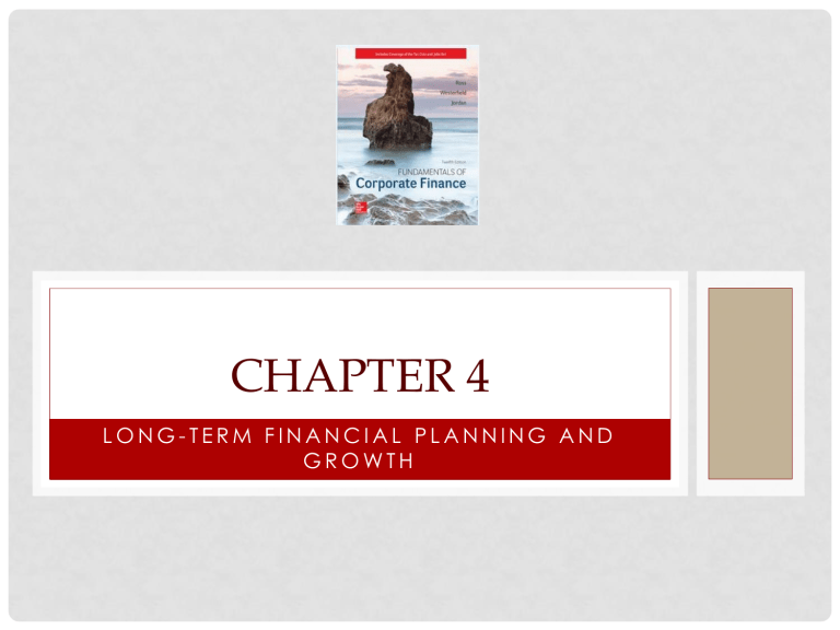 CHAPTER 4 LONG-TERM FINANCIAL PLANNING AND GROWTH KEY CONCEPTS AND SKILLS • Apply the percentage of sales method • Compute the external financing needed to fund a firm’s growth • Name the determinants of a firm’s growth • Anticipate some of the problems in planning for growth 4-2 CHAPTER OUTLINE 1. What Is Financial Planning? 2. Financial Planning Models: A First Look 3. The Percentage of Sales Approach 4. External Financing and Growth 5. Some Caveats Regarding Financial Planning Models 4-3 FINANCIAL PLAN To develop an explicit financial plan, managers must establish certain basic elements of the firm’s financial policy: • The firm’s needed investment in new assets: This will arise from the investment opportunities the firm chooses to undertake, and it is the result of the firm’s capital budgeting decisions. • The degree of financial leverage the firm chooses to employ: This will determine the amount of borrowing the firm will use to finance its investments in real assets. This is the firm’s capital structure policy. • The amount of cash the firm thinks is necessary and appropriate to pay shareholders: This is the firm’s dividend policy. • The amount of liquidity and working capital the firm needs on an ongoing basis: This is the firm’s net working capital decision. Financial planners have no fewer than six Ps: 4-4 Proper Prior Planning Prevents Poor Performance FINANCIAL PLANNING Financial planning formulates the way in which financial goals are to be achieved. A financial plan is thus a statement of what is to be done in the future. Growth, by itself, is not an appropriate goal for the financial manager. The appropriate goal for a firm is increasing the market value of the owners’ equity Growth may thus be a desirable consequence of good decision making, but it is not an end unto itself 4-5 DIMENSIONS OF FINANCIAL PLANNING 1. Planning Horizon – divide decisions into short-run decisions (usually next 12 months) and long-run decisions (usually 2 – 5 years) 2. Aggregation – all individual projects and investments the firm will undertake are combined to determine the total needed investment 3. Assumptions and Scenarios Make realistic assumptions about important variables Run several scenarios where you vary the assumptions by reasonable amounts Determine, at a minimum, worst case, normal case, and best case scenarios 4-6 WHAT CAN PLANNING ACCOMPLISH? • Examine interactions – help management see the interactions between decisions (ex: financing for expansion) • Explore options – give management a systematic framework for exploring its opportunities • Avoid surprises – help management identify possible outcomes and develop contingency plans accordingly • Ensure feasibility and internal consistency – help management determine if goals can be accomplished and if the various stated (and unstated) goals of the firm are consistent or compatible with one another 4-7 CONCEPT CHECK • What are the dimensions of the financial planning process? • Why should firms draw up financial plans? 4-8 CHAPTER OUTLINE 1. What Is Financial Planning? 2. Financial Planning Models: A First Look 3. The Percentage of Sales Approach 4. External Financing and Growth 5. Some Caveats Regarding Financial Planning Models 4-9 FINANCIAL PLANNING MODEL INGREDIENTS • Sales Forecast – many cash flows depend directly on the level of sales (often estimated using sales growth rate) • Pro Forma Statements (pro formas) – setting up the plan using projected financial statements (balance sheet, income statement and statement of cash flows), based on projections of key items such as sales, allows for consistency and ease of interpretation • Asset Requirements – the additional assets that will be required to meet sales projections – projected capital spending • Financial Requirements – the amount of financing needed to pay for the required assets – debt policy/new equity, and dividend policy • Plug Variable – determined by management, deciding what type of financing will be used to make the balance sheet balance: ex: external equity, debt, dividends • Economic Assumptions – explicit forecasted economic environment assumptions about the 4-10 CHAPTER OUTLINE 1. What Is Financial Planning? 2. Financial Planning Models: A First Look 3. The Percentage of Sales Approach 4. External Financing and Growth 5. Some Caveats Regarding Financial Planning Models 4-11 PERCENTAGE OF SALES APPROACH • Some items vary directly with sales, while others do not. • Income Statement Costs may vary directly with sales – if this is the case, then the profit margin is constant. Depreciation and interest expense may not vary directly with sales – if this is the case, then the profit margin is not constant. Dividends are a management decision and generally do not vary directly with sales – this influences additions to retained earnings. • Balance Sheet Initially assume all assets, including fixed, vary directly with sales. Accounts payable will also normally vary directly with sales. Notes payable, long-term debt and equity generally do not vary directly with sales because they depend on management decisions about capital structure. The change in the retained earnings portion of equity will come from the dividend decision. 4-12 EXAMPLE: INCOME STATEMENT ROSENGARTEN CORPORATION Income Statement Sales $1,000 Costs 833 Taxable income $ 167 Taxes (21%) 35 Net income $ 132 Dividends Addition to retained earnings $ 44 88 Rosengarten has projected a 25 percent increase in sales for the coming year, so we are anticipating sales of $1,000 × 1.25 = $1,250. To generate a pro forma income statement, we assume that total costs will continue to run at $833/$1,000 = .833, or 83.3% of sales or in other words will also increase by 25% ROSENGARTEN CORPORATION Pro Forma Income Statement Sales (projected) $1,250 Costs (83.3% of sales) 1,041 Taxable income $ 209 Taxes (21%) 44 Net income $