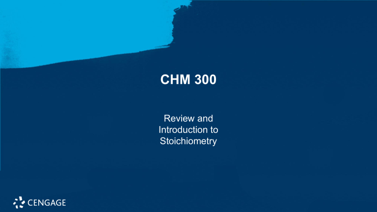 CHM 300 Review and Introduction to Stoichiometry R.8 Classification of Matter • Matter: anything occupying space and having mass • Matter exists in three states: solid, liquid and gas © 2021 Cengage. All Rights Reserved. May not be scanned, copied or duplicated, or posted to a publicly accessible website, in whole or in part. Mixtures • Most of the matter around us consists of mixtures of pure substances • Wood, gasoline, wine, soil, and air all are mixtures. • Main characteristic of a mixture is that it has variable composition • Mixtures can be classified as homogeneous (having visibly indistinguishable parts) or heterogeneous (having visibly distinguishable parts). © 2021 Cengage. All Rights Reserved. May not be scanned, copied or duplicated, or posted to a publicly accessible website, in whole or in part. Examples of Mixtures • A homogeneous mixture is called a solution. • Air is a solution consisting of a mixture of gases. Wine is a complex liquid solution. Brass is a solid solution of copper and zinc. • Heterogeneous mixtures • Examples: sand in water, salt and sand, and iced tea with ice cubes • Heterogeneous mixtures usually can be separated into two or more homogeneous mixtures or pure substances. © 2021 Cengage. All Rights Reserved. May not be scanned, copied or duplicated, or posted to a publicly accessible website, in whole or in part. Separating Mixtures • Mixtures can be separated into pure substances by physical methods. • A pure substance is one with constant composition. Pure water is composed solely of H2O molecules • water found in nature (groundwater or the water in a lake or ocean) is a mixture. • seawater, for example, contains large amounts of dissolved minerals. © 2021 Cengage. All Rights Reserved. May not be scanned, copied or duplicated, or posted to a publicly accessible website, in whole or in part. Separating Mixtures based on Physical Properties A physical change is a change in the form of a substance, not in its chemical composition. A physical change can be used to separate a mixture into pure compounds, but it will not break compounds into elements. • Boiling seawater produces steam, which can be condensed to pure water, leaving the minerals behind as solids. • The dissolved minerals in seawater also can be separated out by freezing the mixture, since pure water freezes out. The processes of boiling and freezing are physical changes. When water freezes or boils, it changes its state but remains water; it is still composed of molecules. © 2021 Cengage. All Rights Reserved. May not be scanned, copied or duplicated, or posted to a publicly accessible website, in whole or in part. Distillation One of the most important methods for separating the components of a mixture is distillation. Depends on differences in volatility. Works very well when only one component of the mixture is volatile. (sand and water) © 2021 Cengage. All Rights Reserved. May not be scanned, copied or duplicated, or posted to a publicly accessible website, in whole or in part. Filtration and Chromatography • Another method of separation is simple filtration • which is used when a mixture consists of a solid and a liquid. The mixture is poured onto a mesh, such as filter paper, which passes the liquid and leaves the solid behind. • A third method of separation is chromatography. • Chromatography is the general name applied to a series of methods that use a system with two phases (states) of matter: a mobile phase and a stationary phase. • The stationary phase is a solid, and the mobile phase is either a liquid or a gas. The separation process occurs because the components of the mixture have different affinities for the two phases and thus move through the system at different rates. © 2021 Cengage. All Rights Reserved. May not be scanned, copied or duplicated, or posted to a publicly accessible website, in whole or in part. Compounds and elements • Pure substances are either compounds (combinations of elements) or free elements. • A compound is a substance with constant composition that can be broken down into elements by chemical processes. • electrolysis of water, chemical change because the water molecules have been broken down into the free elements hydrogen and oxygen. A chemical change is one in which a given substance becomes a new substance or substances with different properties and different composition. • Elements, composed of atoms, are substances that cannot be decomposed into simpler substances by chemical or physical means. © 2021 Cengage. All Rights Reserved. May not be scanned, copied or duplicated, or posted to a publicly accessible website, in whole or in part. The Organization of Matter © 2021 Cengage. All Rights Reserved. May not be scanned, copied or duplicated, or posted to a publicly accessible website, in whole or in part. Chapter 5 Stoichiometry Zumdahl, CHEMISTRY: An Atoms First Approach, Third Edition. © 2021 Cengage. All Rights Reserved. May not be scanned, copied or duplicated, or posted to a publicly accessible website, in whole or in part. Table of Contents (1 of 2) • (5-1) Counting by weighing • (5-2) Atomic masses • (5-4) The mole • (5-5) Molar mass • (5-6) Percent composition of compounds • (5-7) Determining the formula of a compound © 2021 Cengage. All Rights Reserved. May not be scanned, copied or duplicated, or posted to a publicly accessible website, in whole or in part. Questions to Consider • Can atoms be counted? • Does the number of atoms in a reaction affect the result? • Can the mass of a sample be used to determine the number of moles it comprises? © 2021 Cengage. All Rights Reserved. May not be scanned, copied or duplicated, or posted to a publicly accessible website, in whole or in part. Section 5.1 Counting by Weighing © 2021 Cengage. All Rights Reserved. May not be scanned, copied or duplicated, or posted to a publicly accessible website, in whole or in part.